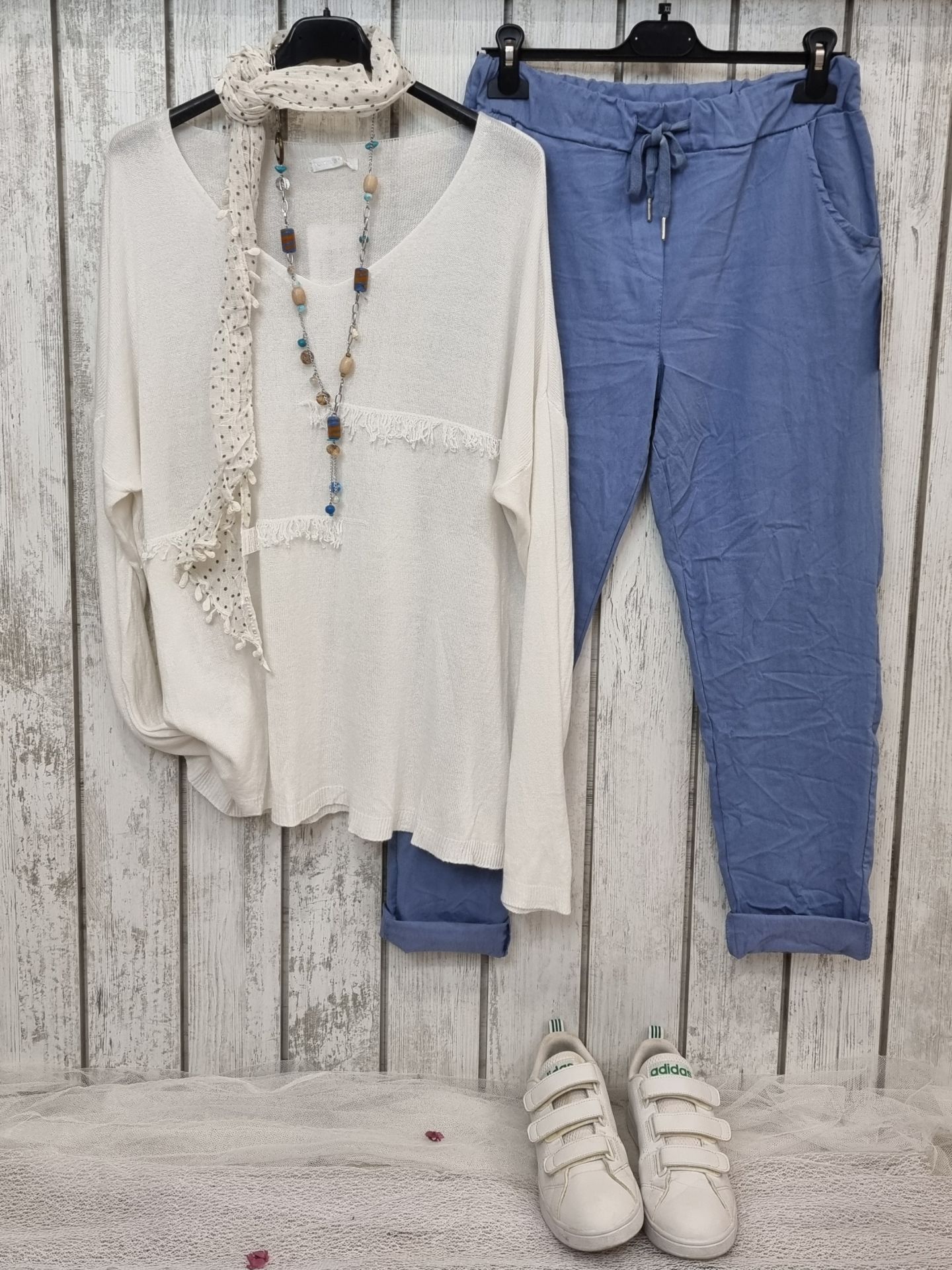 Beyazın sade duruşunu yumuşacık bir dokuyla birleştiren bu %100 doğal içerikli oversize İtalyan triko kazak, her mevsim şıklık arayan kadınlar için tasarlandı. Modal ve viskon karışımıyla elde edilen ince yapısı, teninizde adeta bir esinti gibi hissedilir. Eskitme yıkama efekti, beyaz rengin doğal bir geçiş tonuna kavuşmasını sağlar. V yakası ve geniş kesimiyle hem klasik hem sportif kombinlere kolayca uyum sağlar. 52 bedene kadar uyum sağlayan oversize formu sayesinde rahatlık ve şıklığı bir arada sunar. Günlük kullanımda sadeliği seven ama stilinden ödün vermeyen kadınların gardırobunda yerini almaya hazır bu İtalyan triko kazak, katmanlı giyim için de ideal.