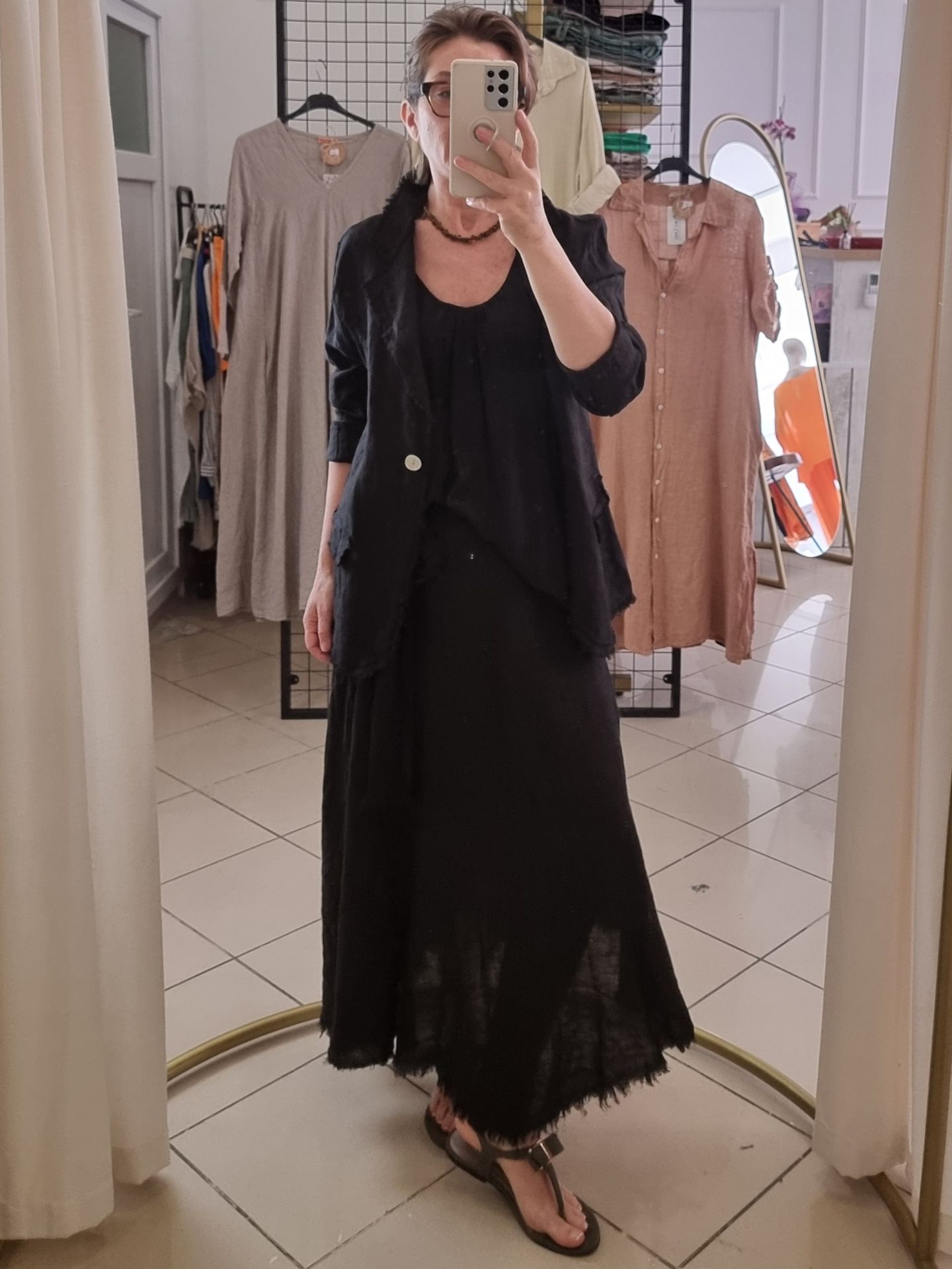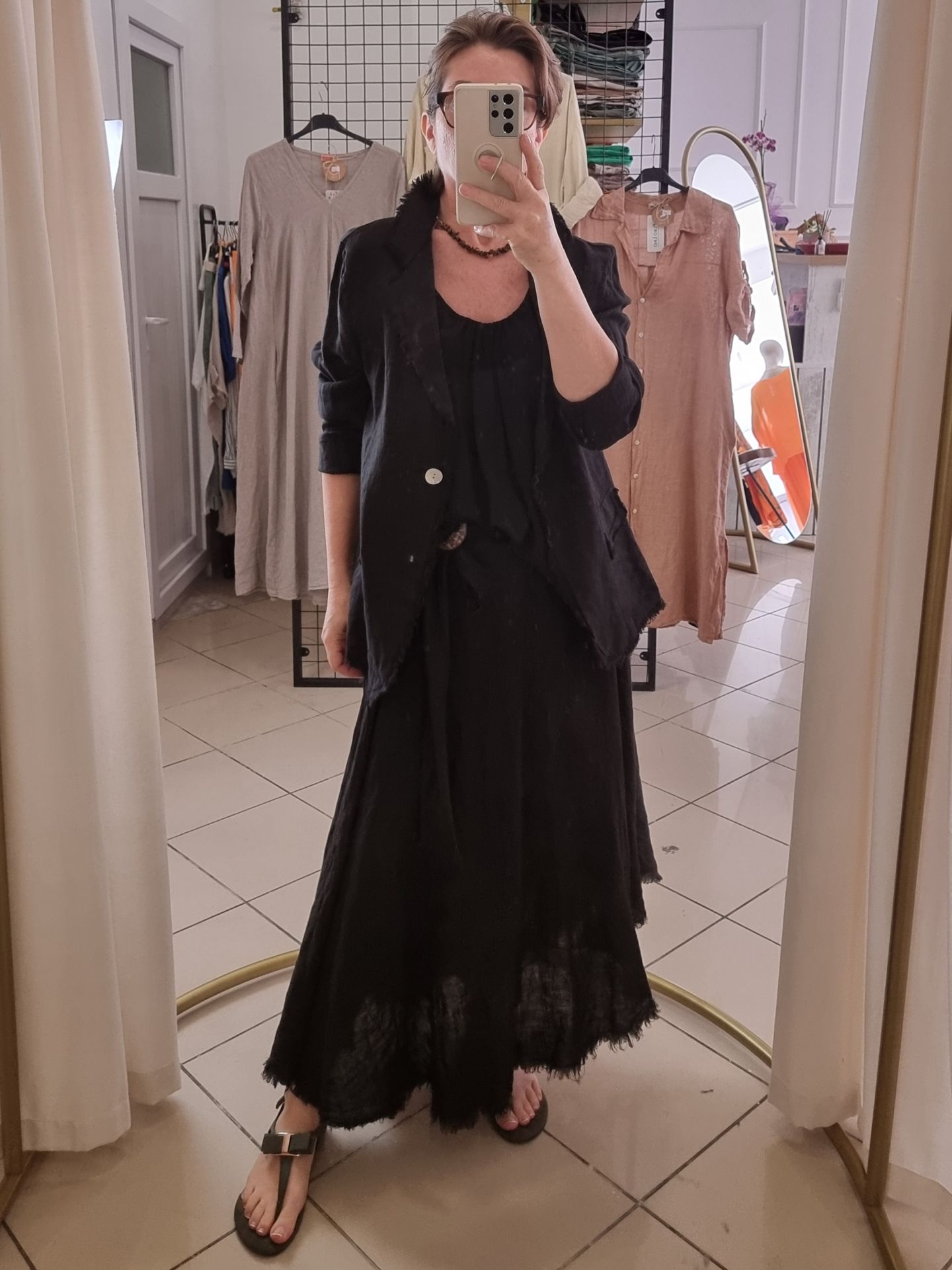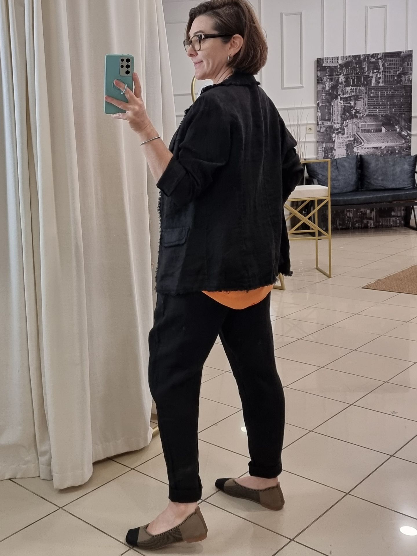 Siyah tonu ile dikkat çeken bu İtalyan keten siyah ceket, sade ama etkili bir görünüm isteyen kadınlar için tasarlandı. %100 doğal keten dokusu sayesinde nefes alan bir yapı sunar, sıcak havalarda bile konforlu bir kullanım sağlar. Oversize kalıbı, farklı vücut tiplerine uyum sağlarken hareket özgürlüğü de sunar. Yalın ama güçlü duruşu, ister ofis stilinizde ister hafta sonu kombinlerinizde kolayca yer bulur. İçine basic bir bluzla günlük stilinizi tamamlayabilir, keten pantolonlar veya elbiselerle kombinleyerek şıklığınızı bir üst seviyeye taşıyabilirsiniz.