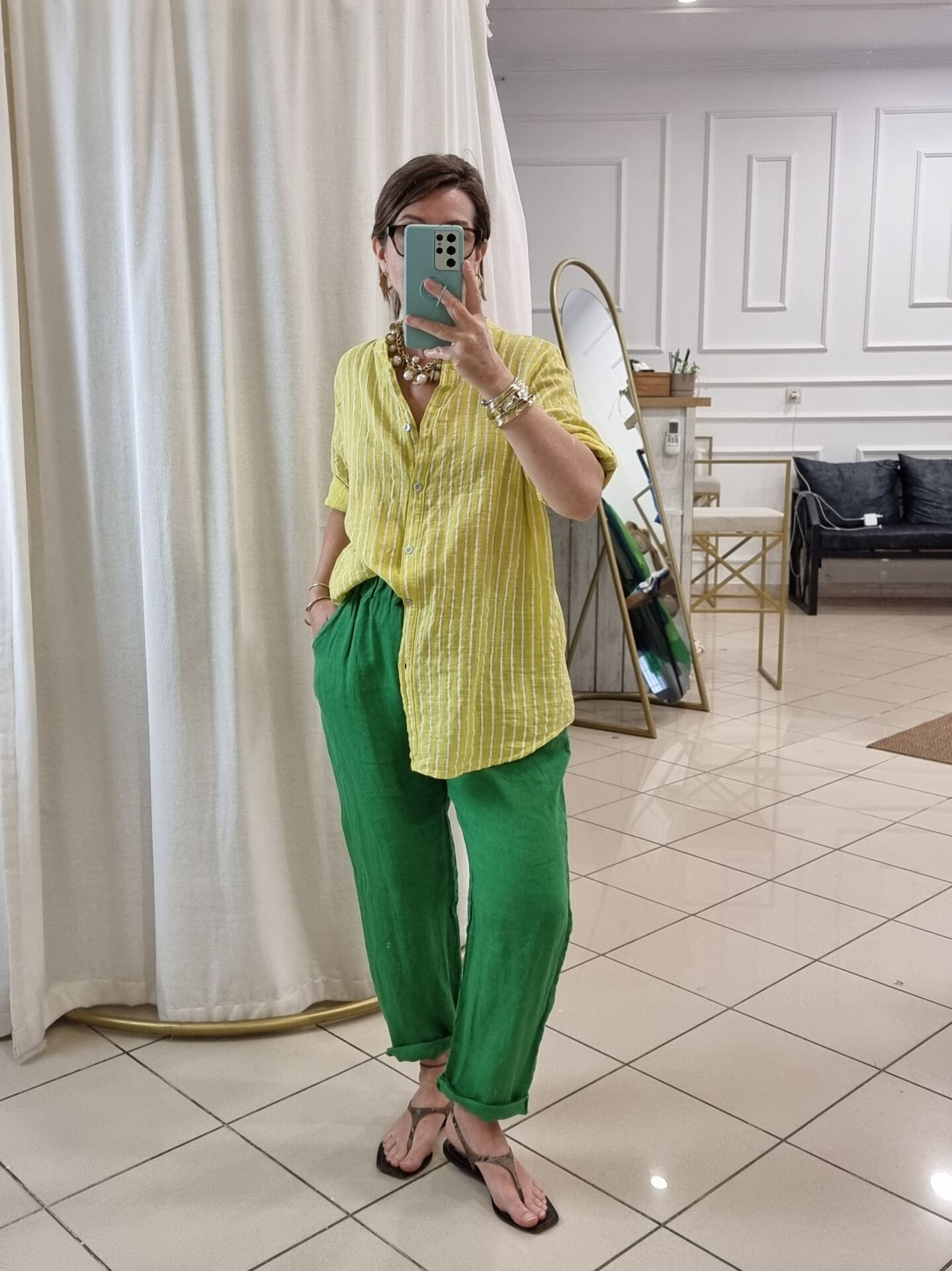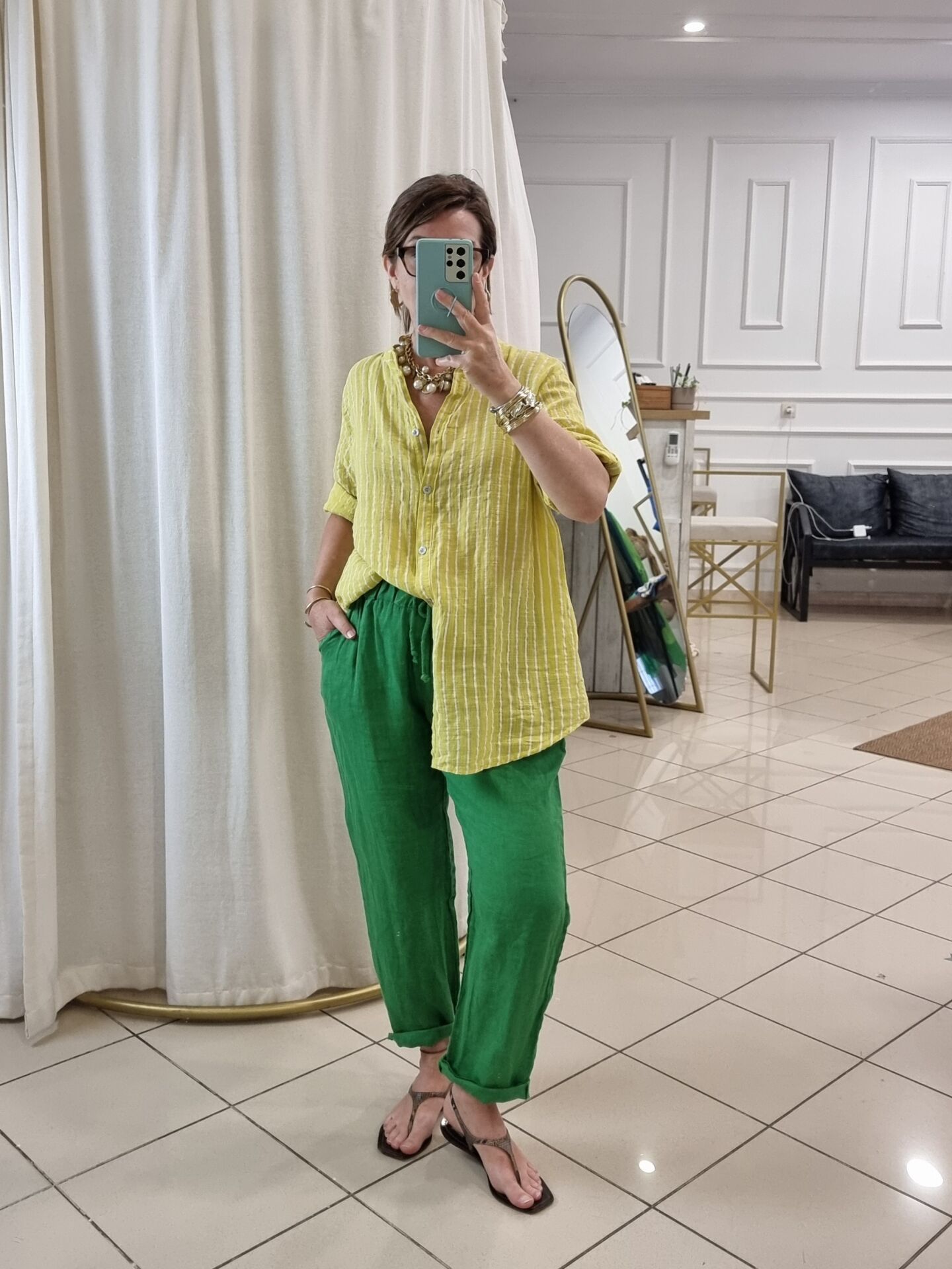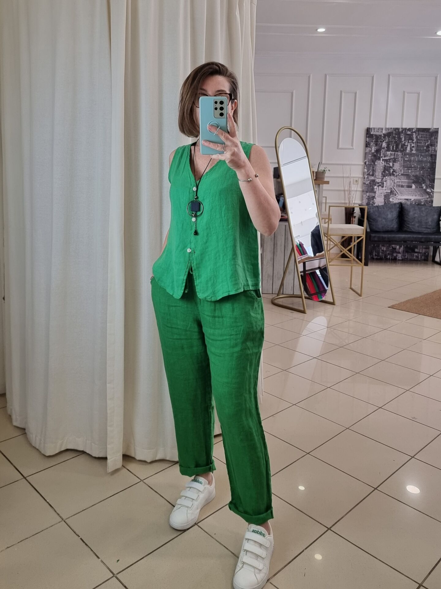 %100 keten kumaşıyla nefes alan yapıya sahip bu fıstık yeşili İtalyan pantolon, yaz aylarında aradığınız hafiflik ve ferahlığı bir arada sunuyor. Bol kesimi sayesinde rahat bir hareket alanı sağlarken, doğal tonuyla doğadan ilham alan bir stil vadediyor. Hem sade kombinlere enerji katmak hem de farklı renklerle dinamik görünümler oluşturmak isteyenler için zamansız bir parça. Beli lastikli yapısı gün boyu konfor sunarken, cepli tasarımı pratikliği elden bırakmıyor. Renk ve dokusuyla fark yaratmak isteyen kadınlar için ideal.