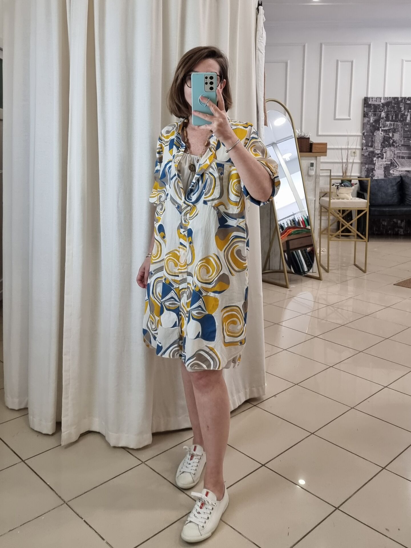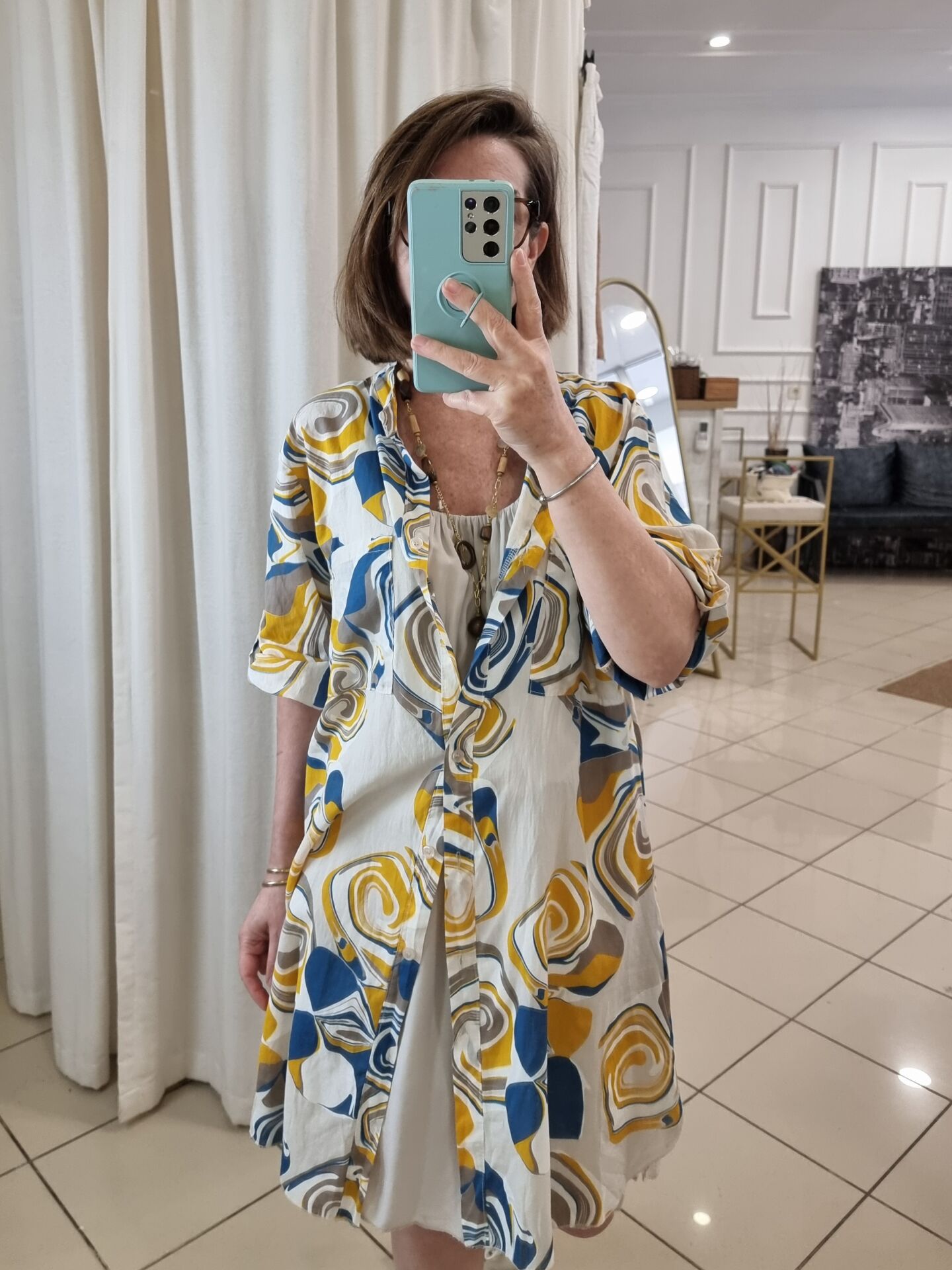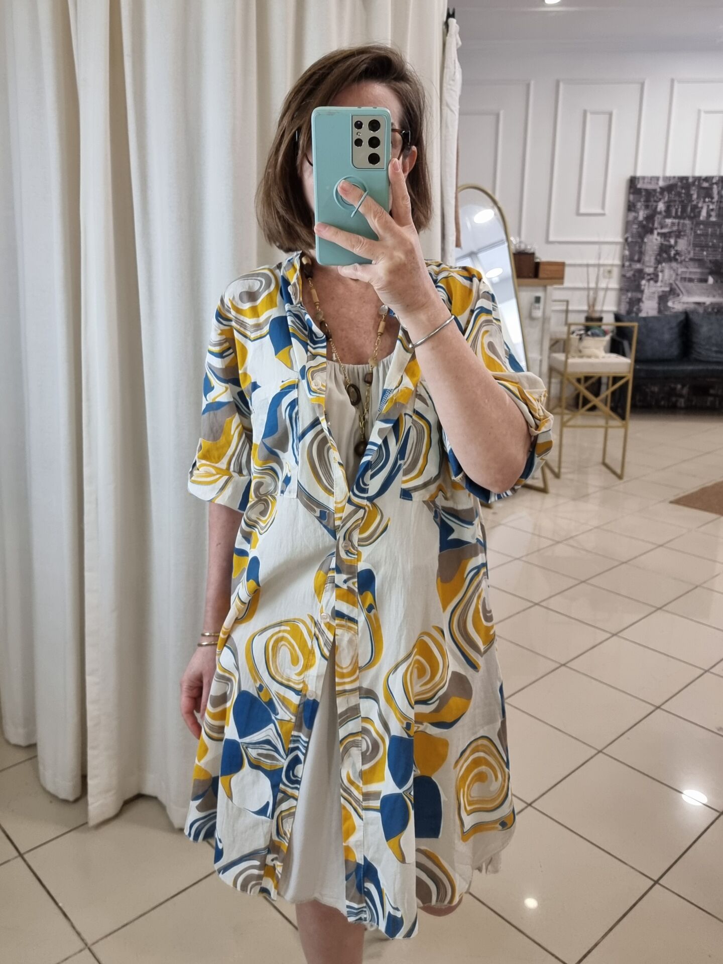 Bej desenli ince poplin tunik.
