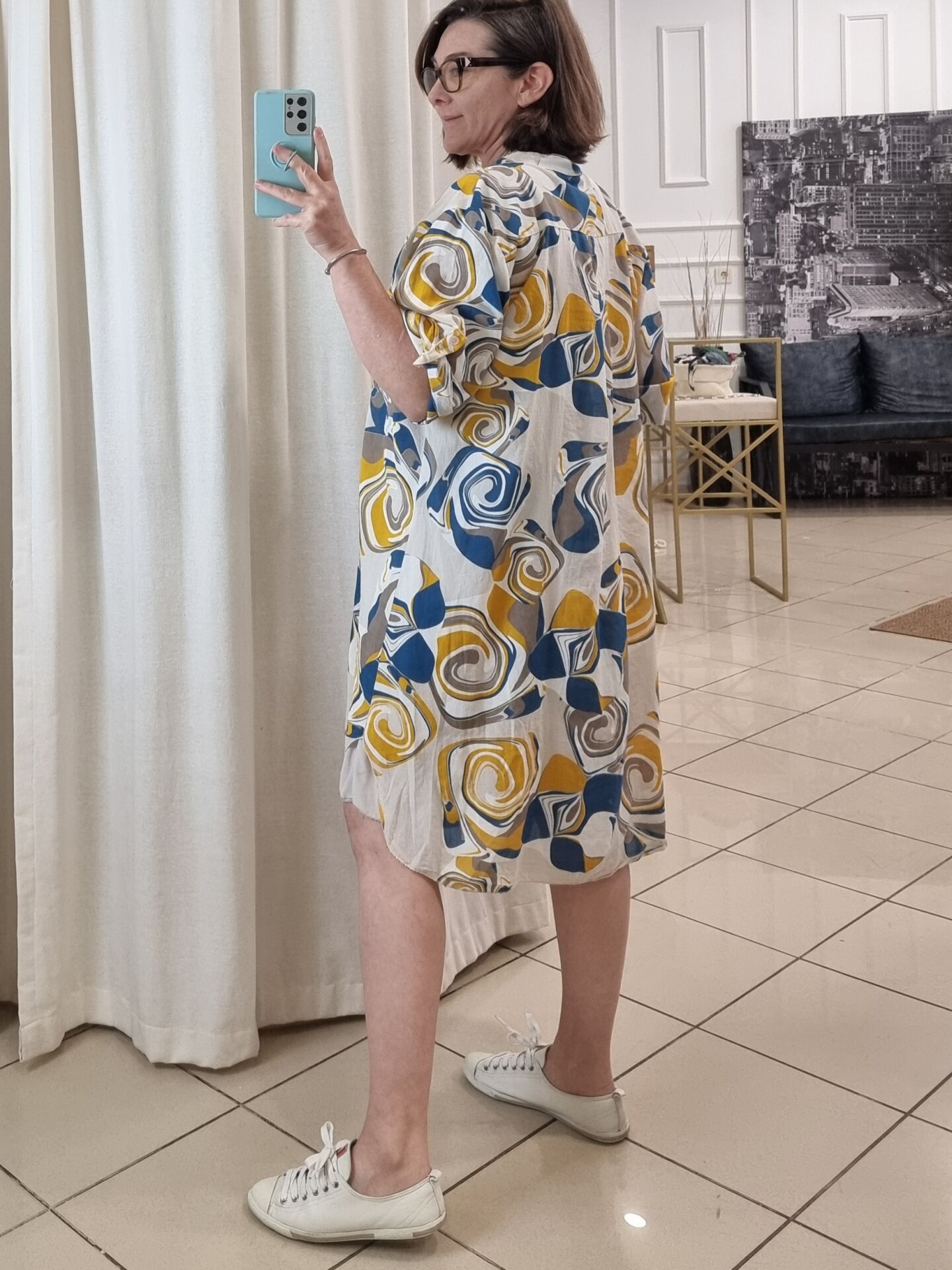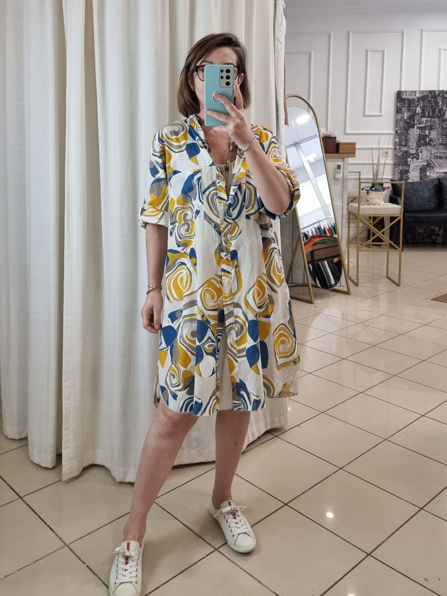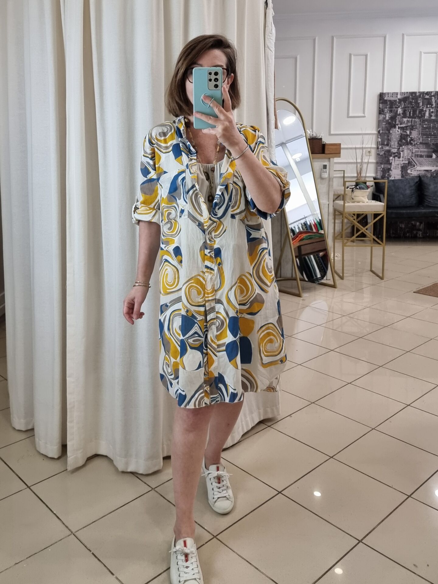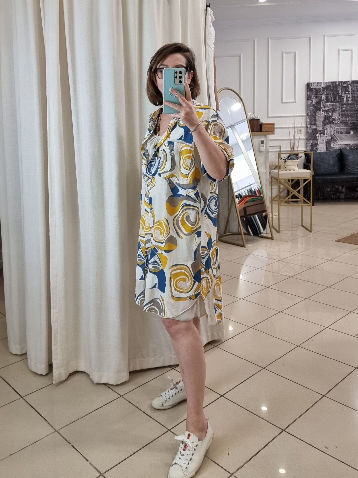 Bej desenli ince poplin tunik.