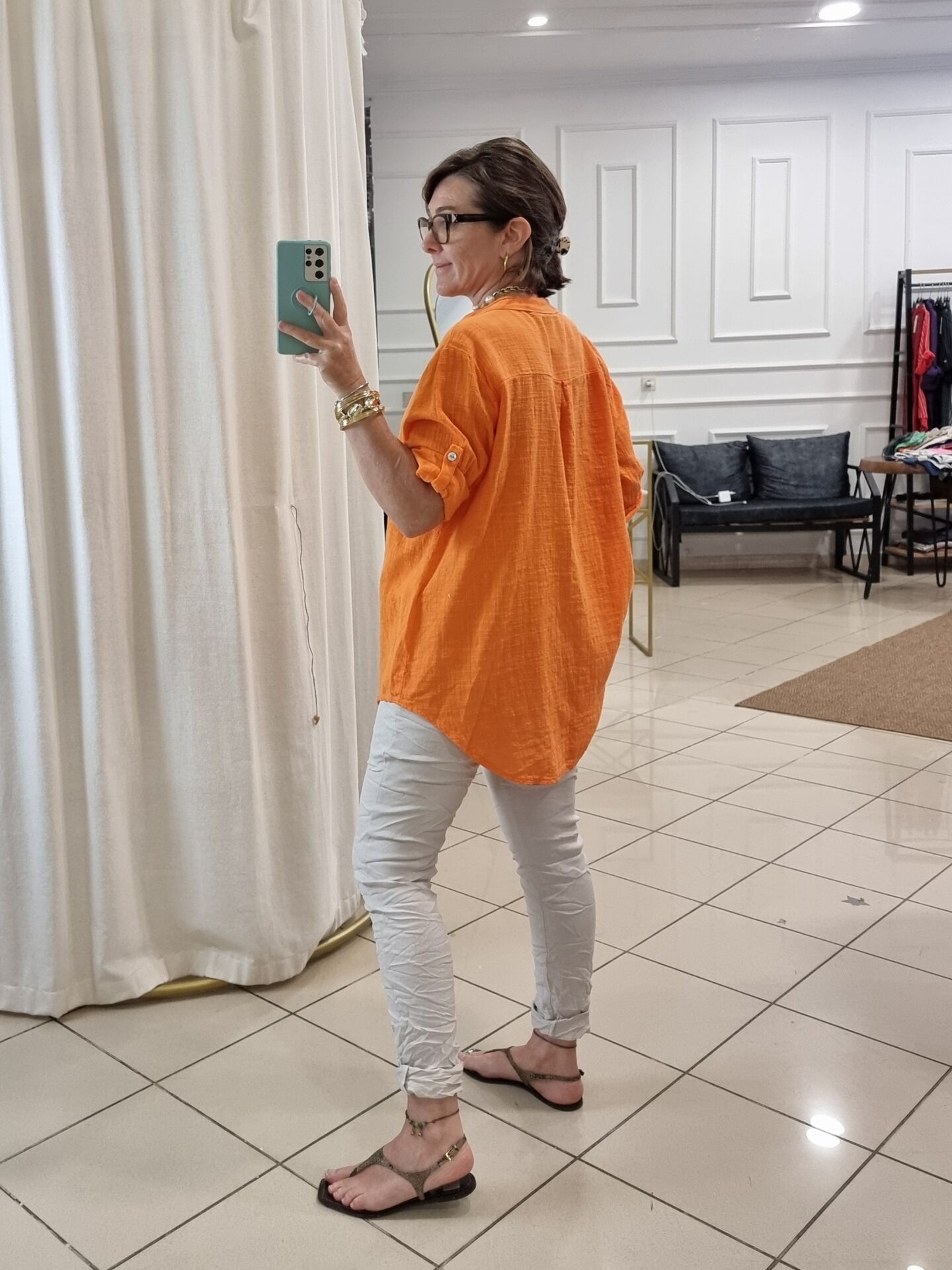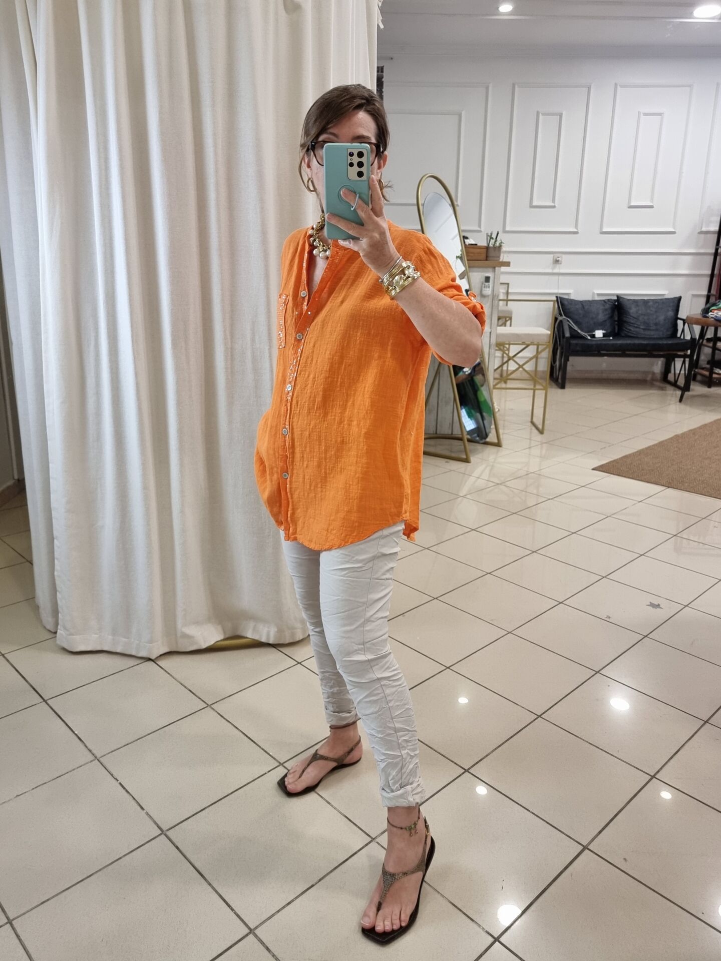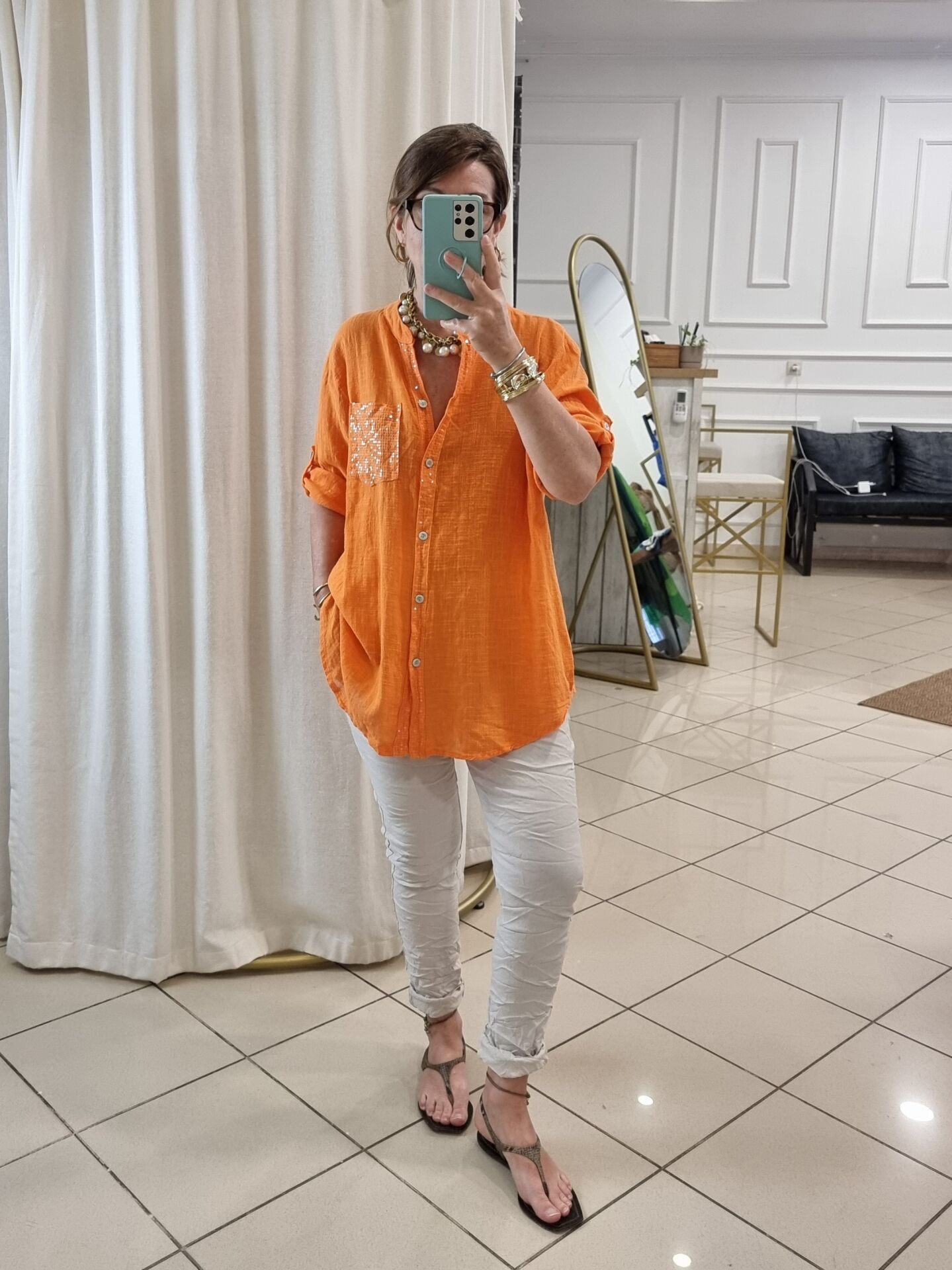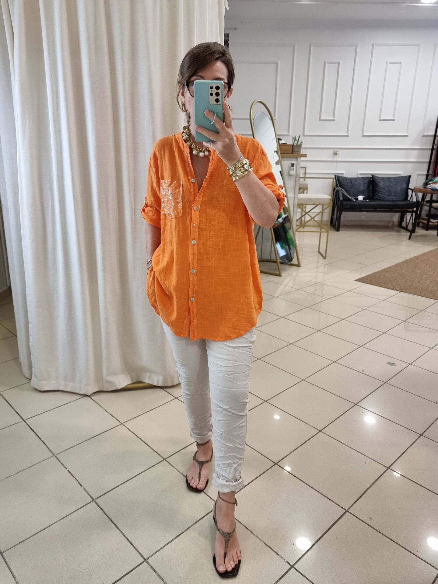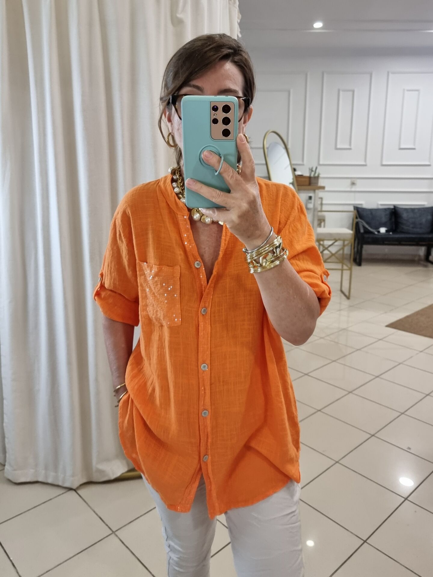 %100 Pamuklu Payetli Turuncu Gömlek
