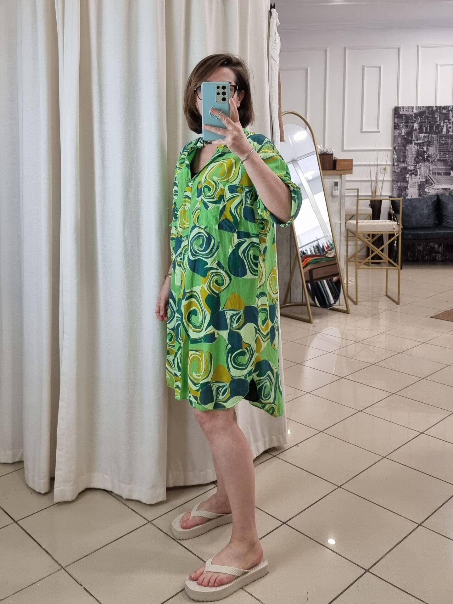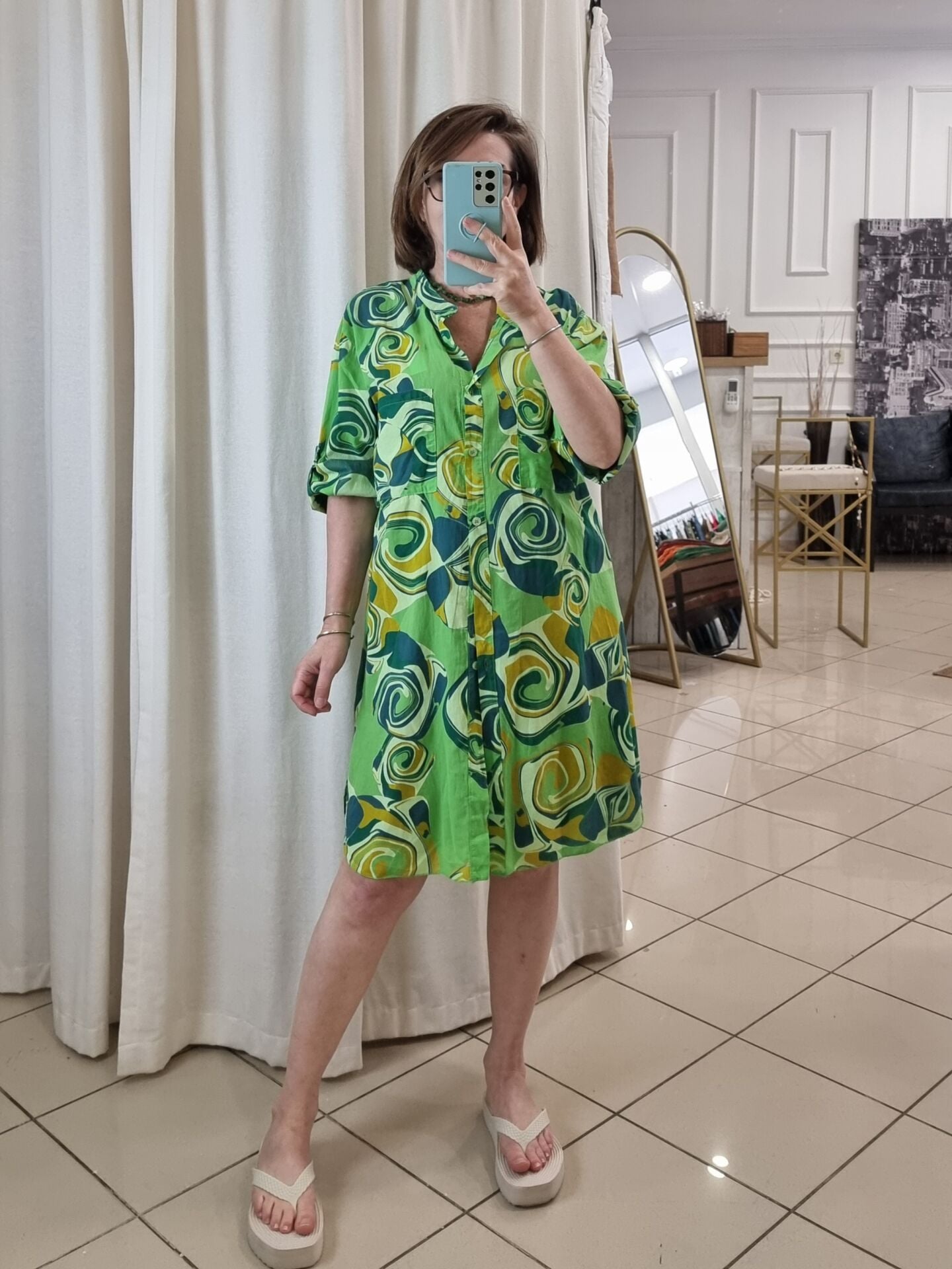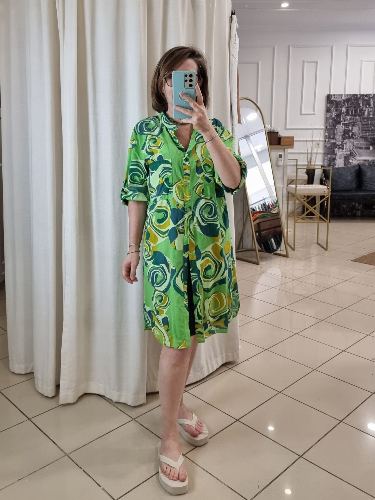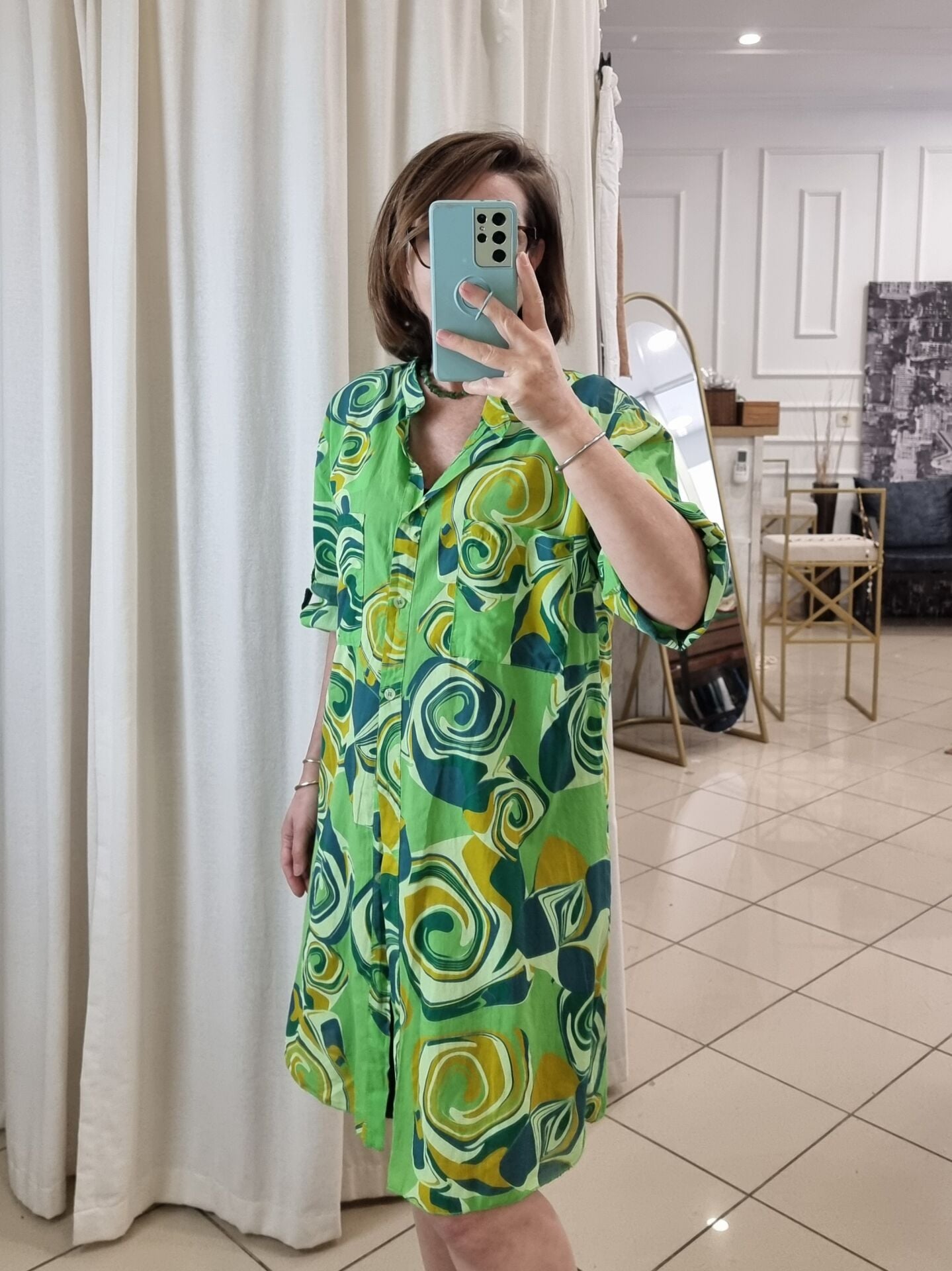 %100 Pamuklu Desenli Gömlek Elbise Yeşil