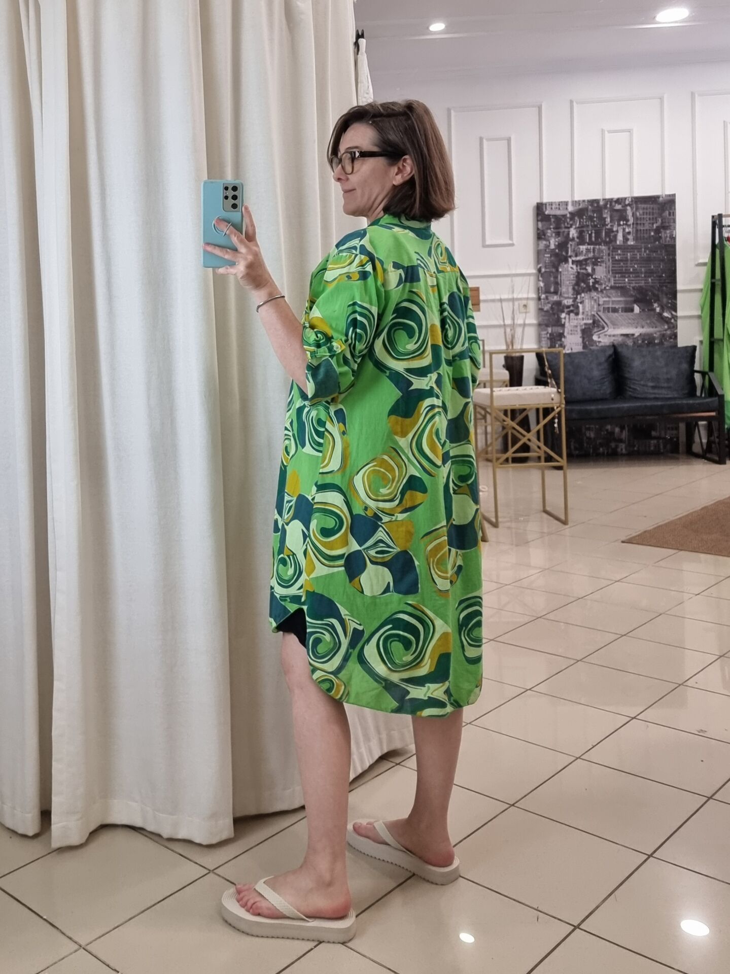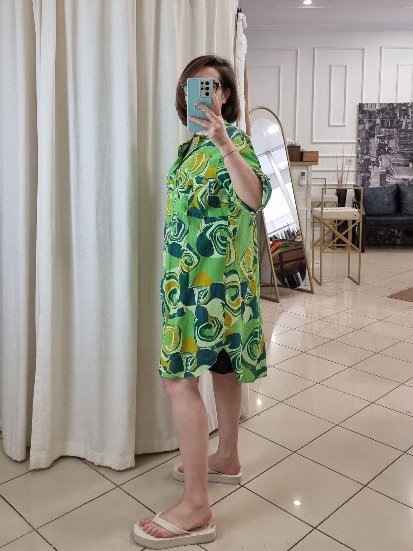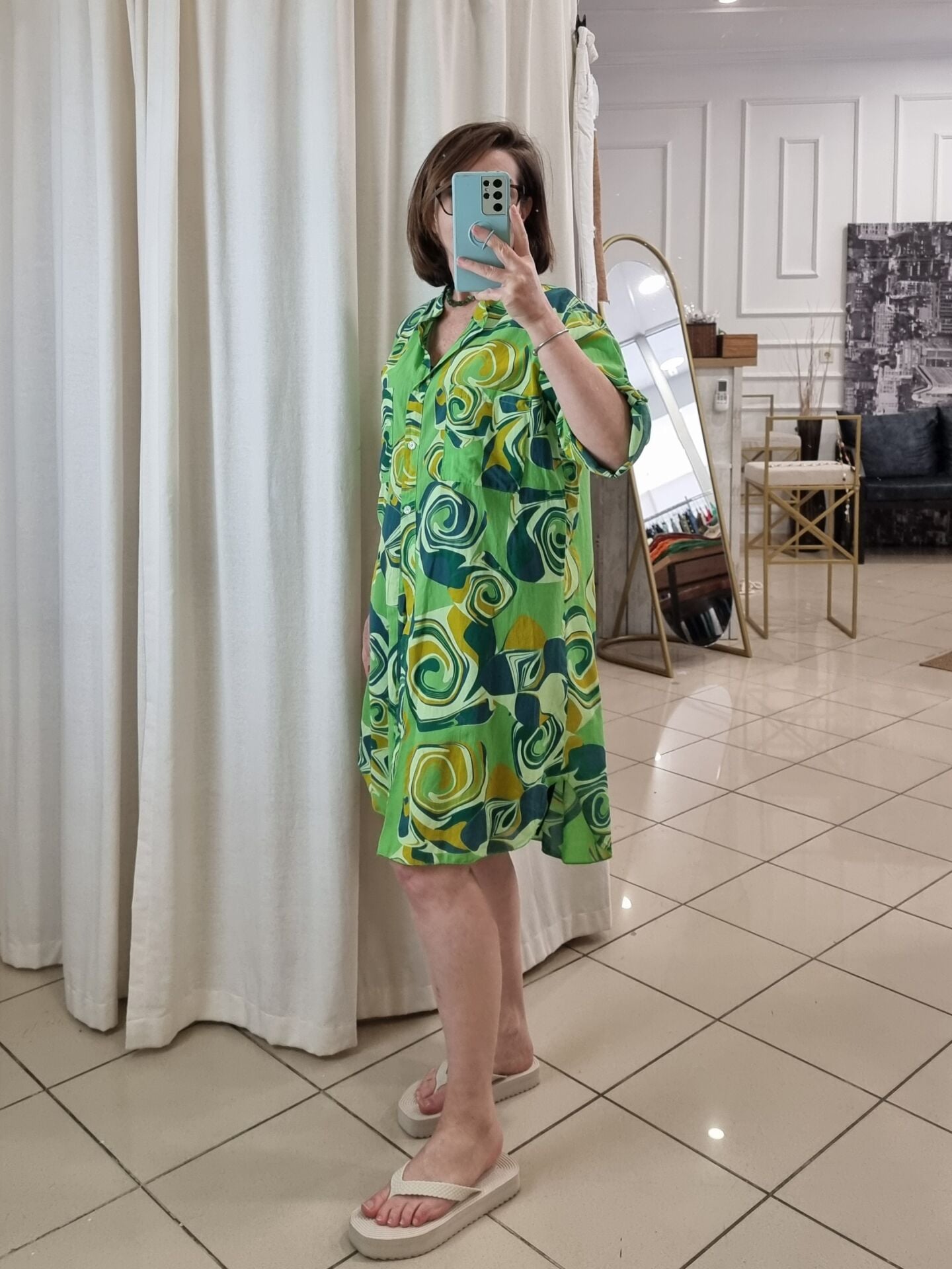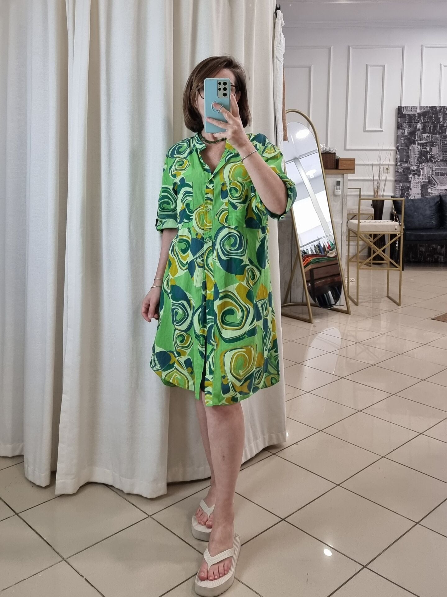%100 Pamuklu Desenli Gömlek Elbise Yeşil