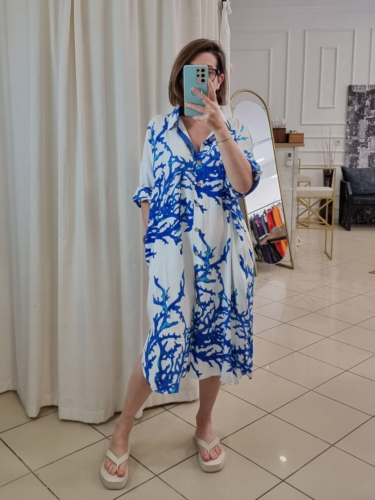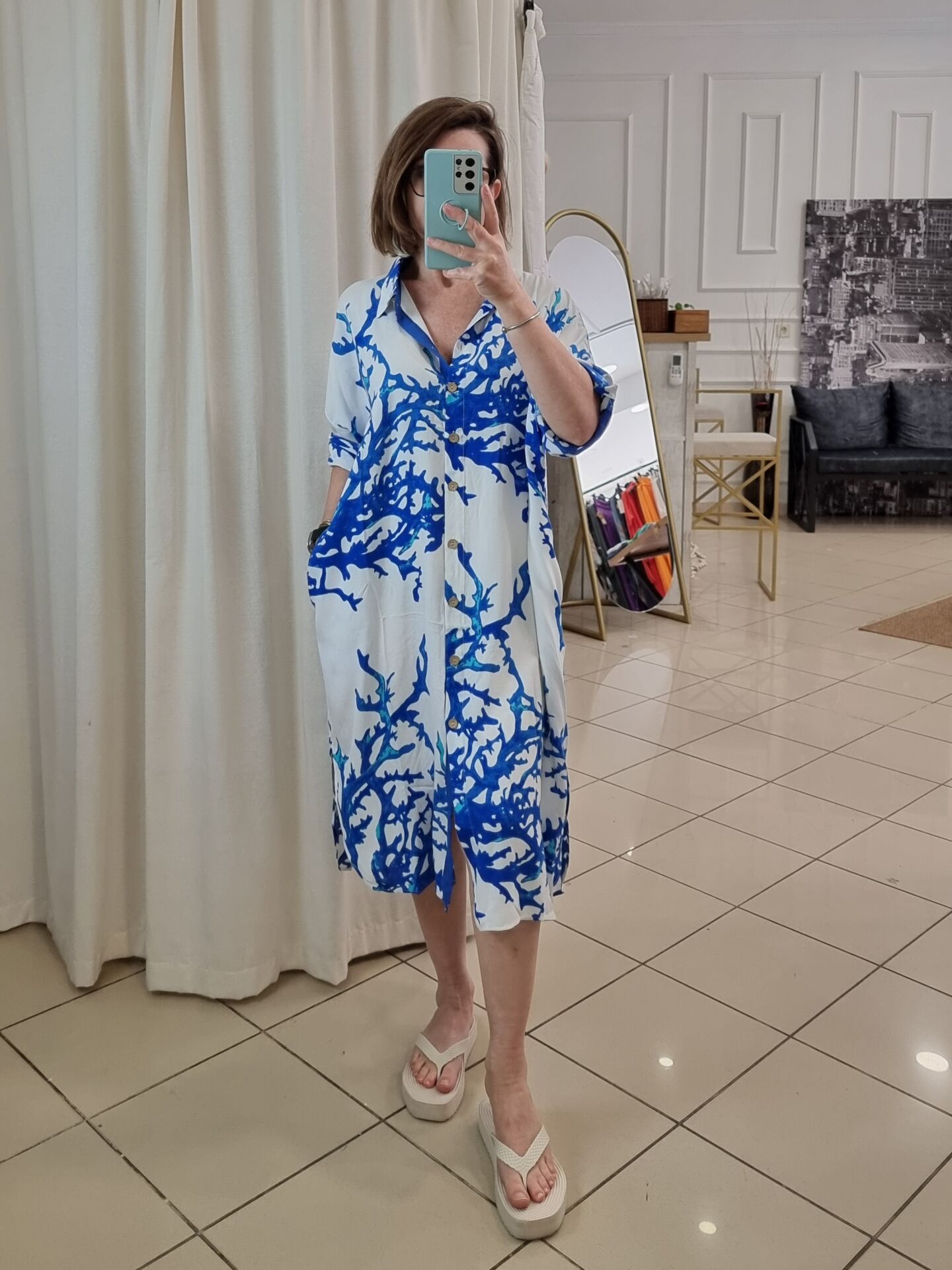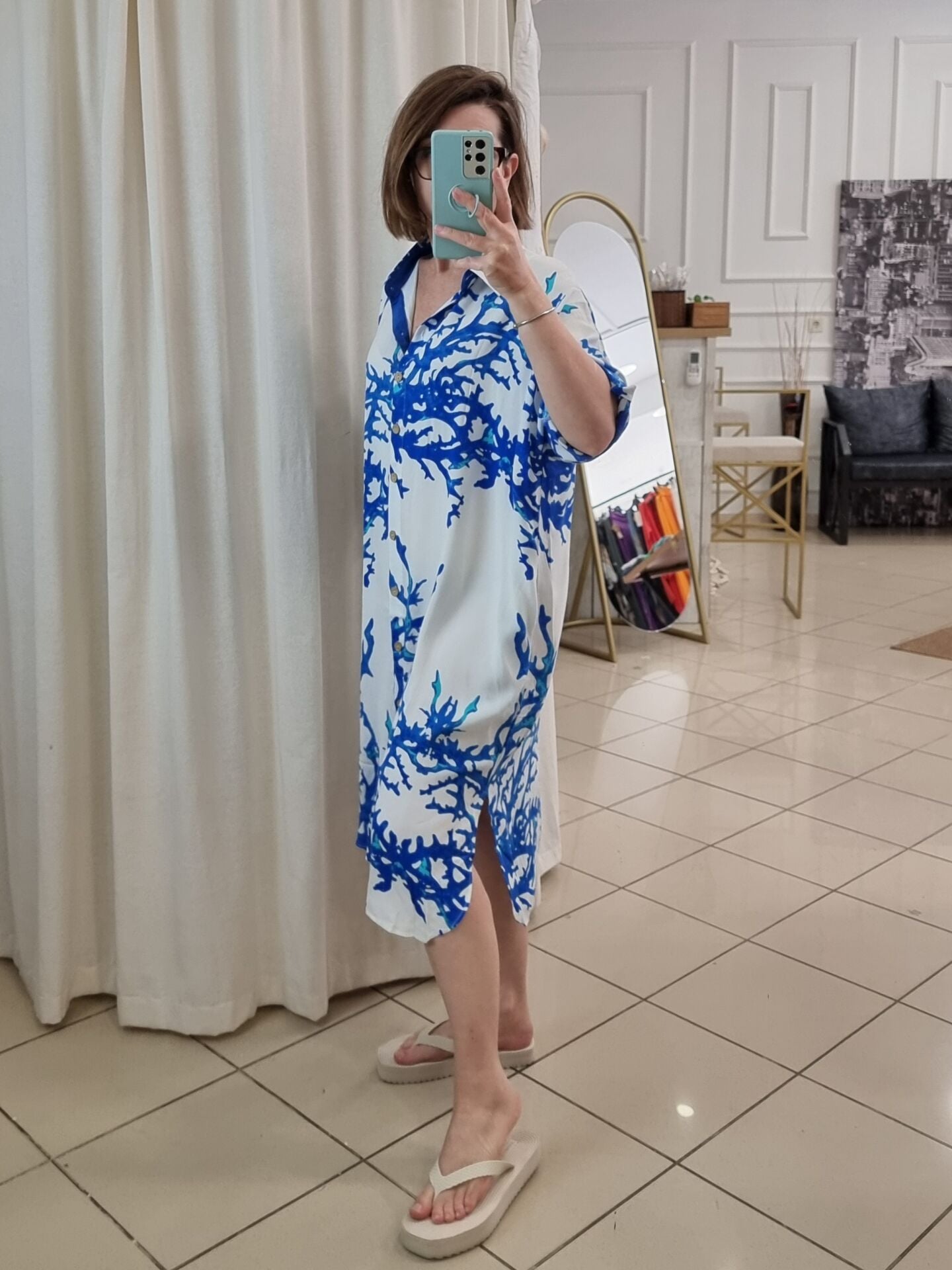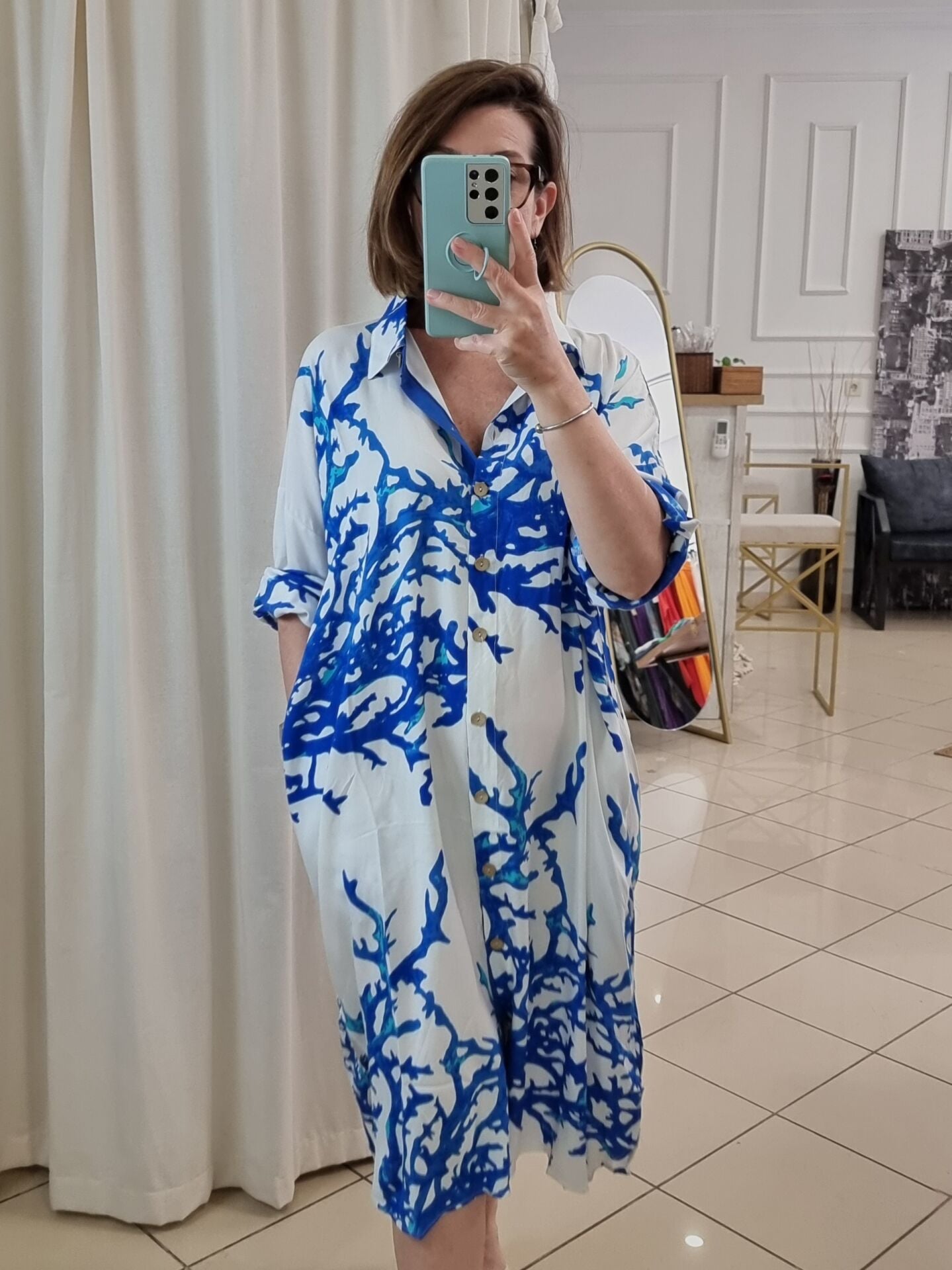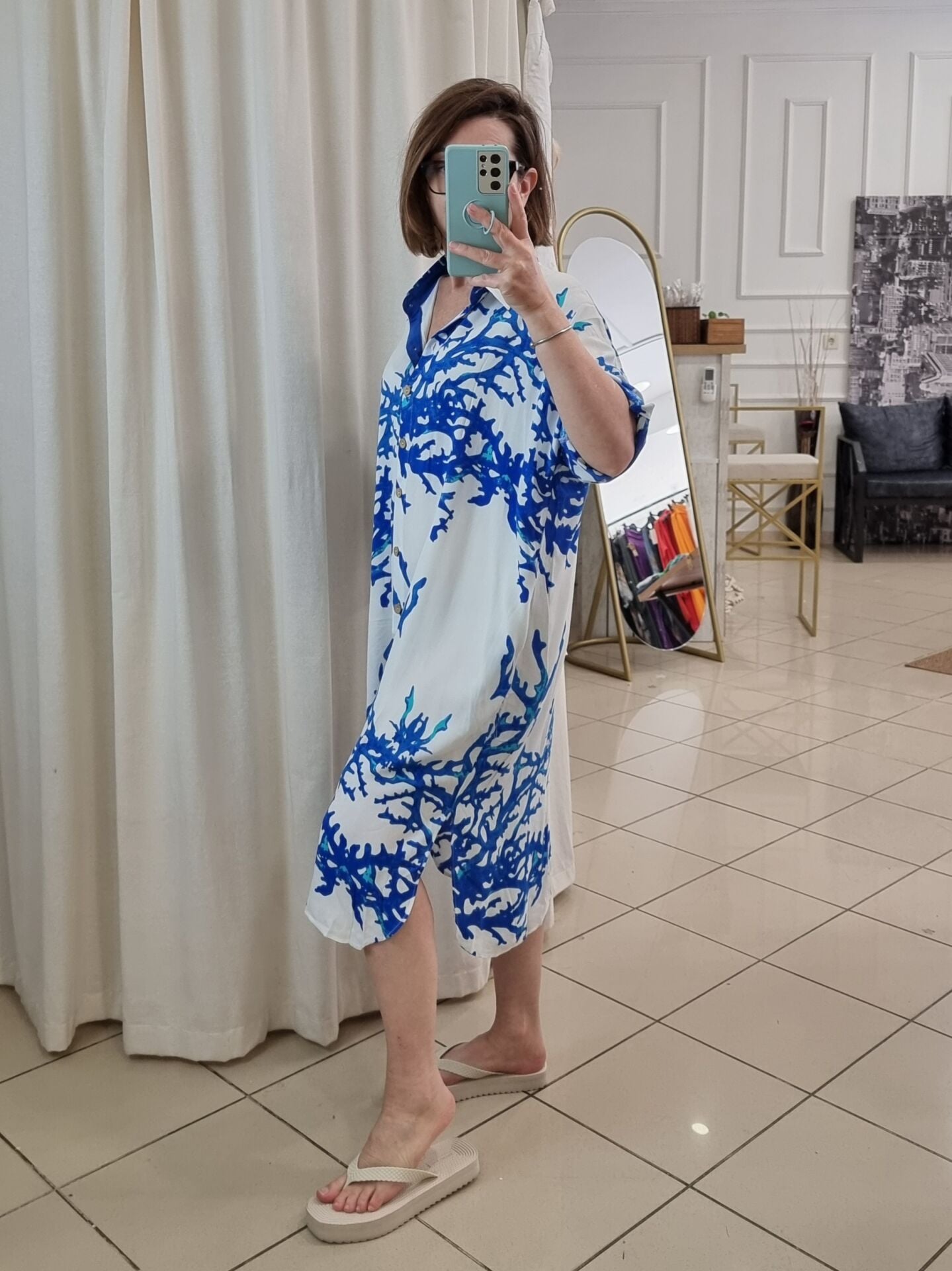 Beyaz üzeri mavi desenli viskon tunik.