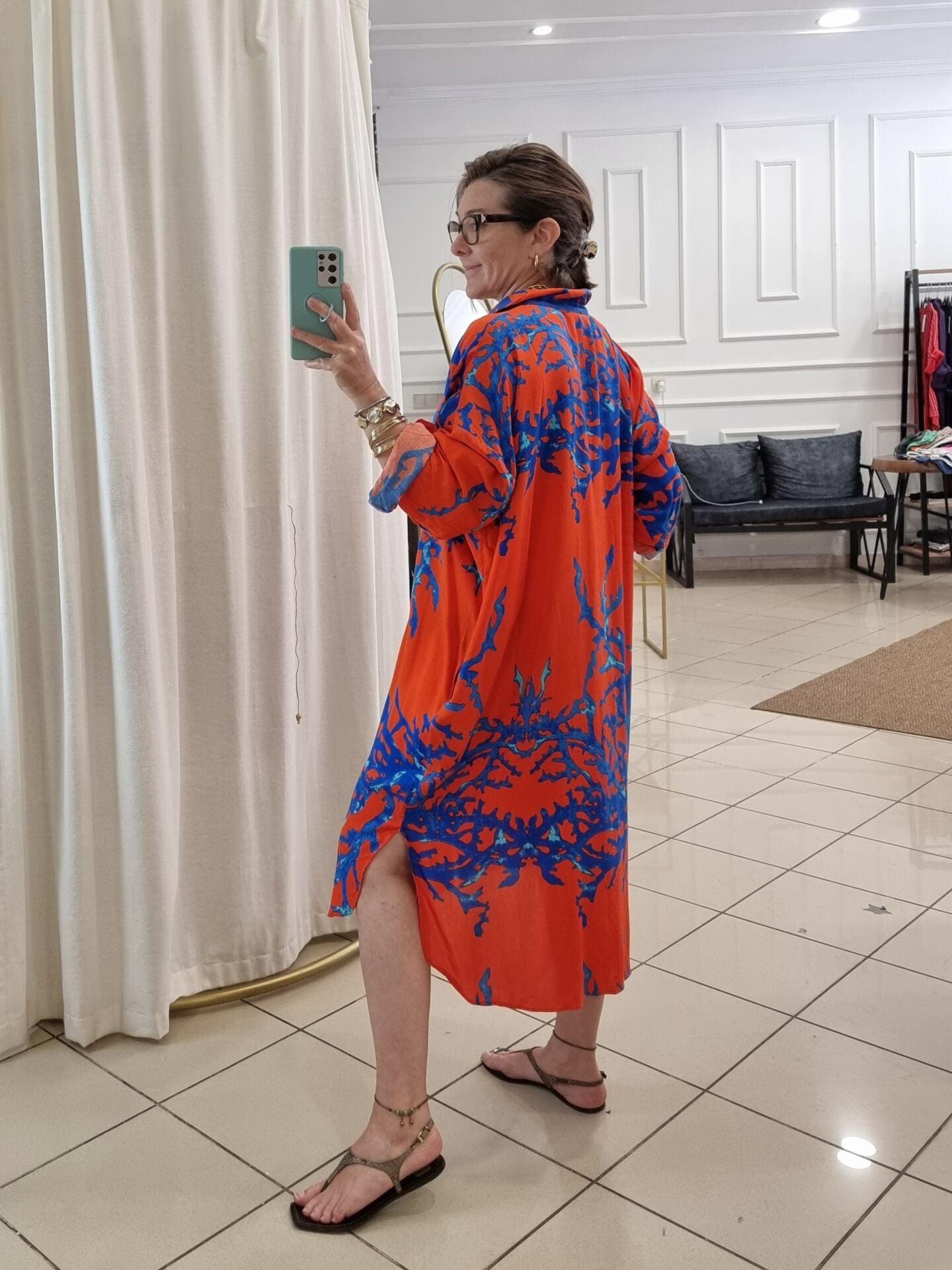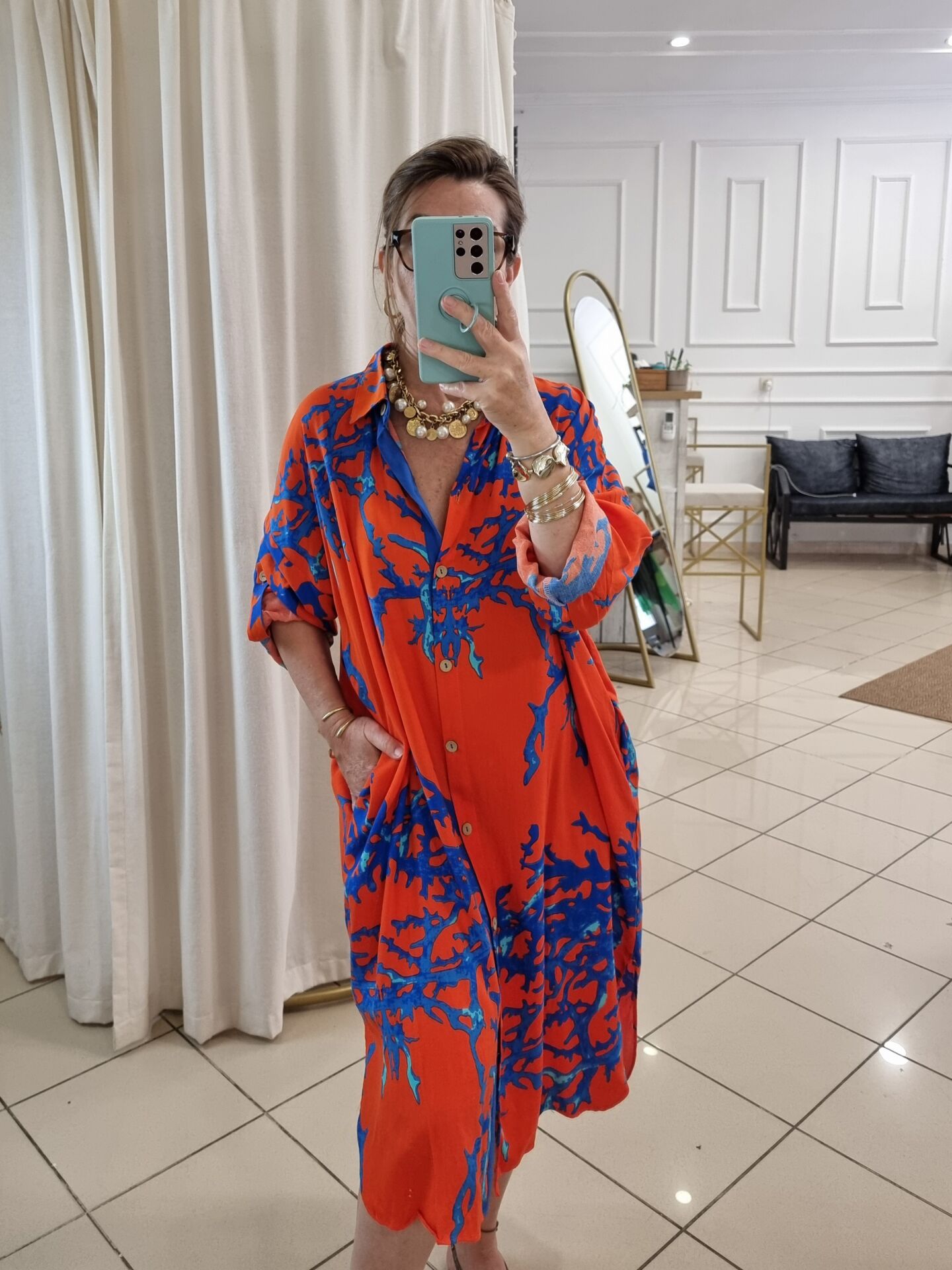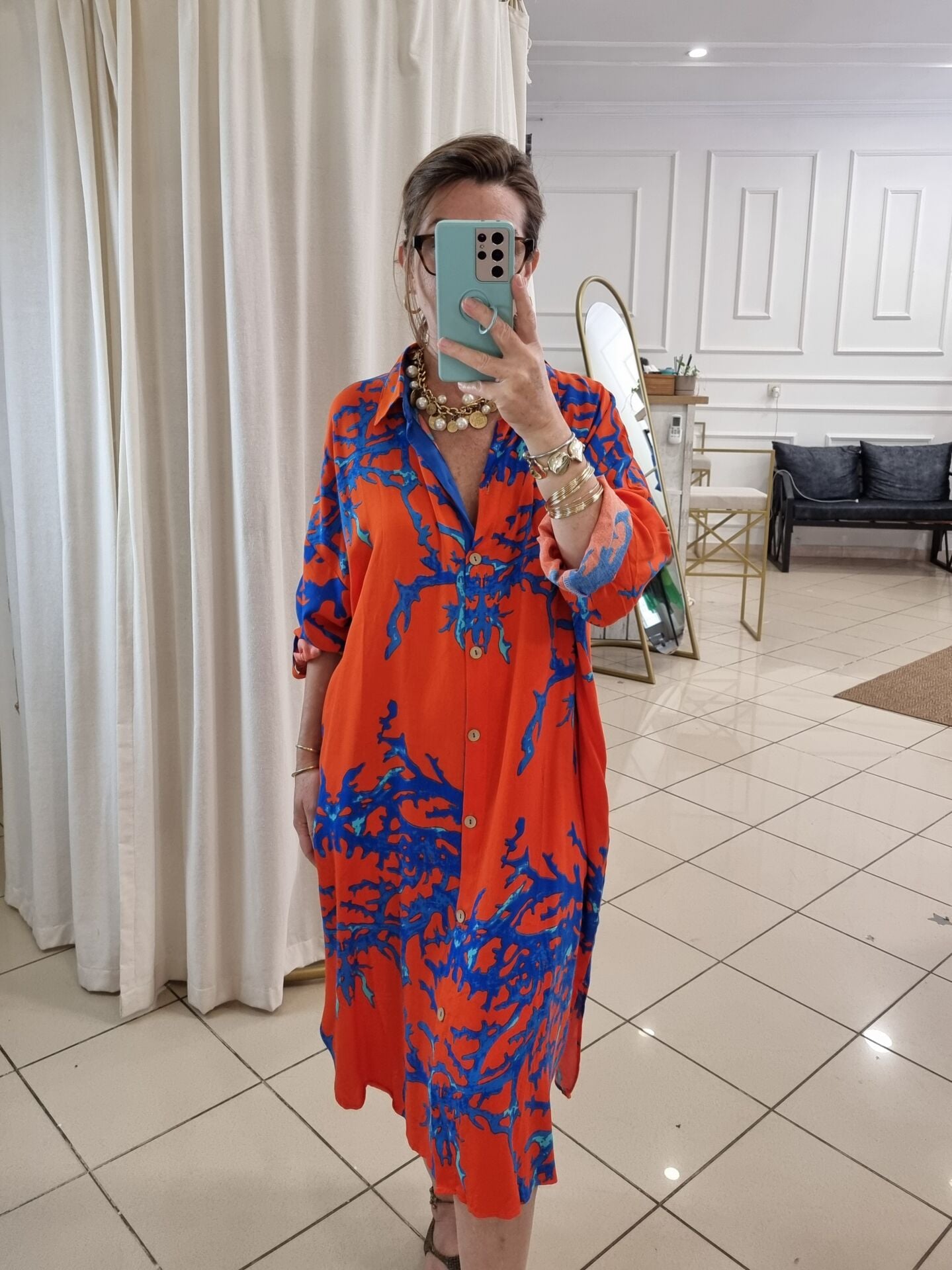 Turuncu renk üzeri mavi desenli viskon tunik.