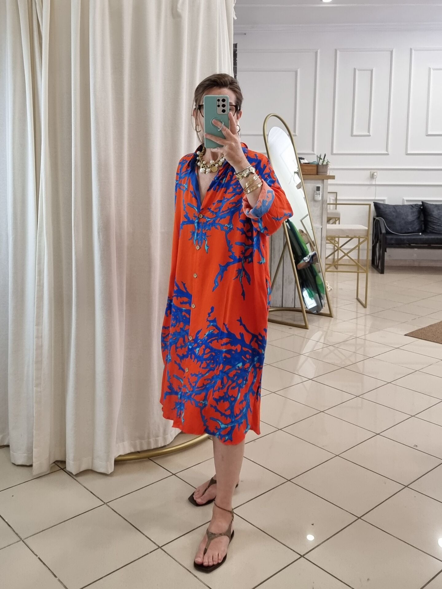 Turuncu Desenli Uzun Gömlek Elbise Tunik