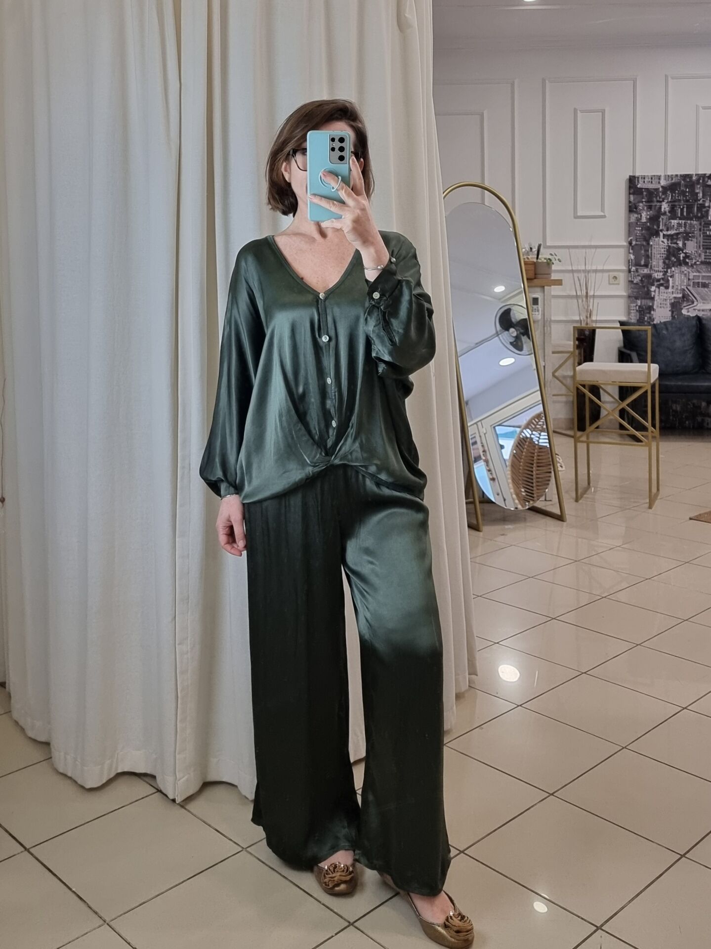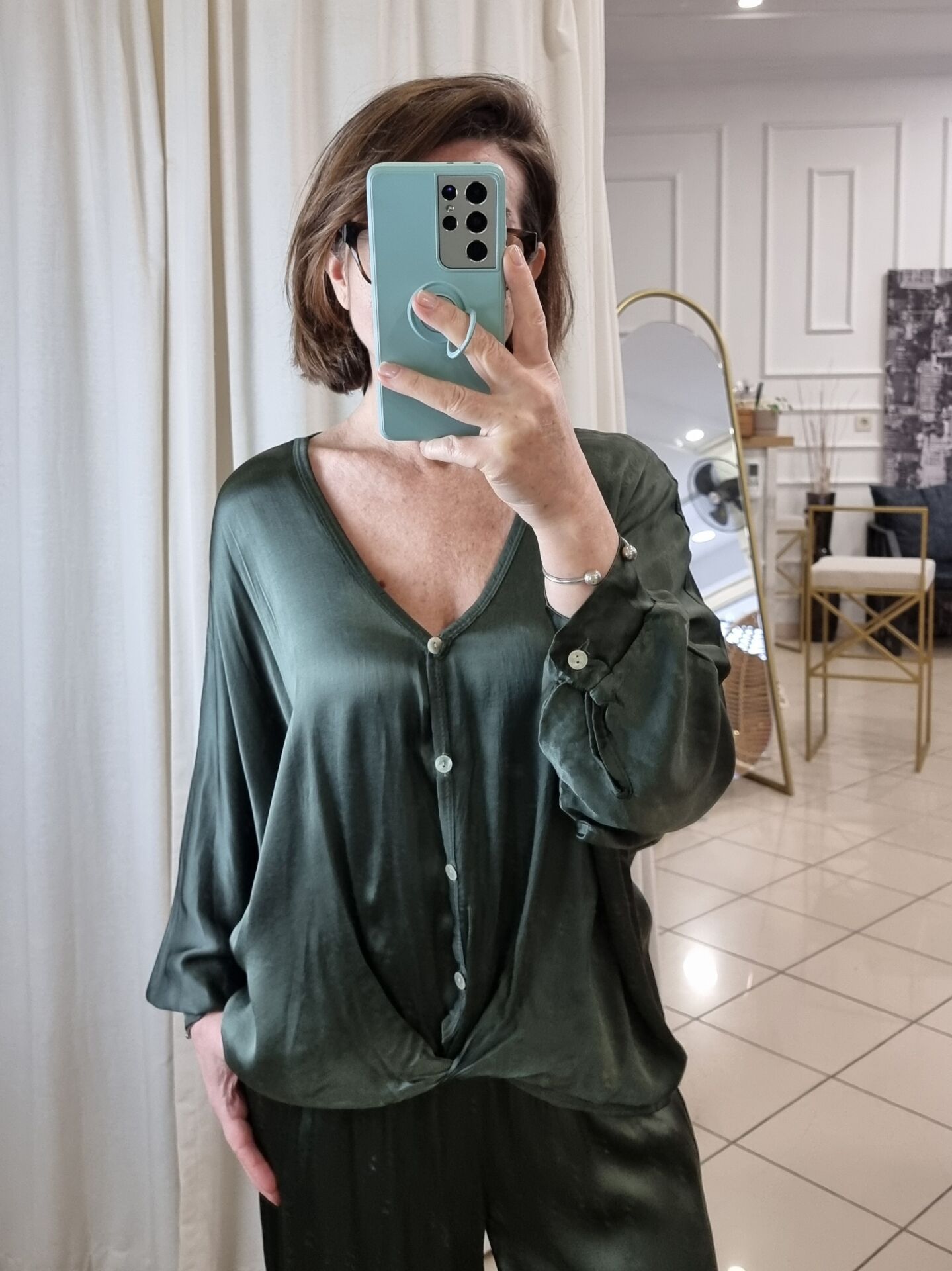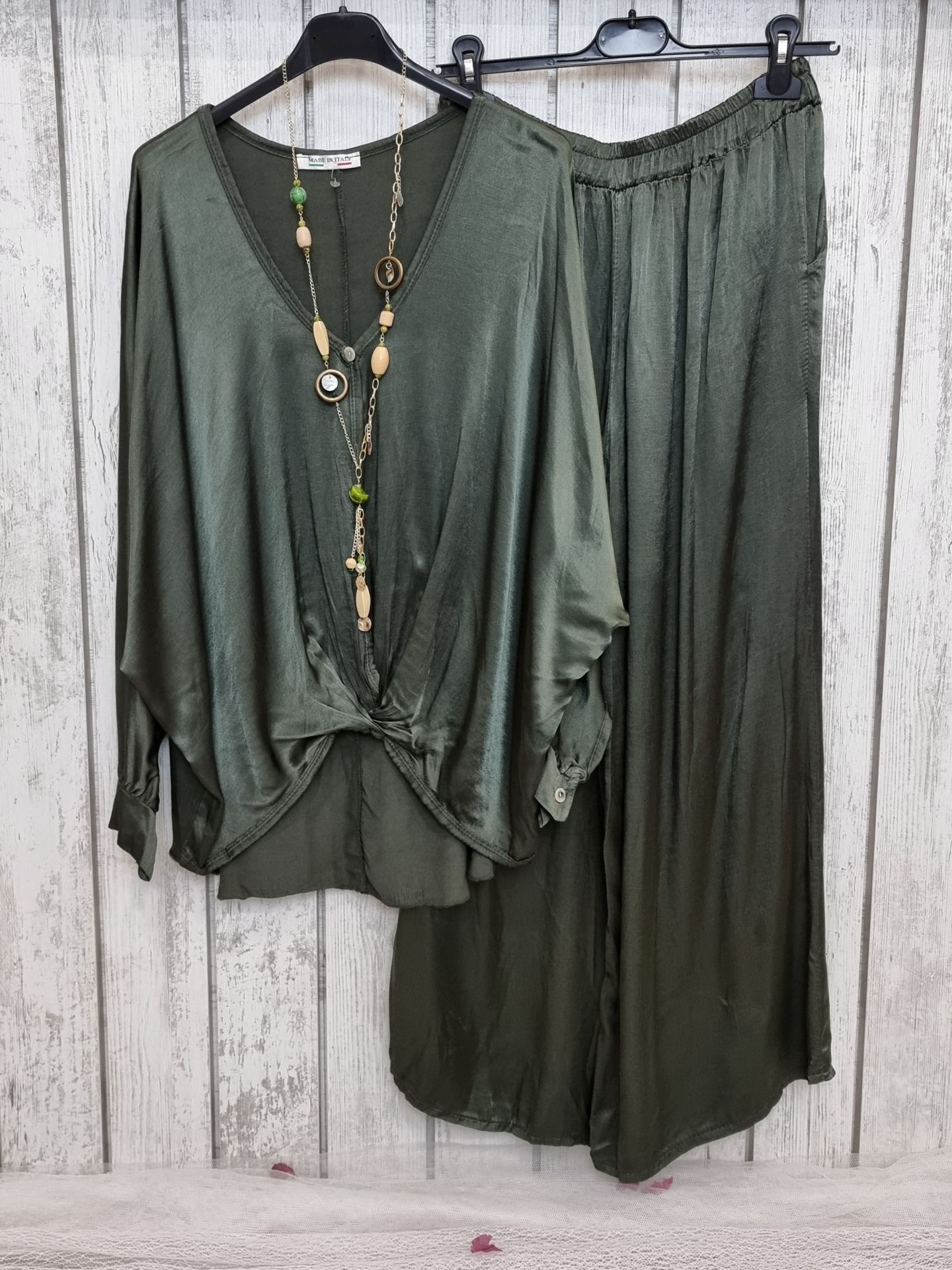 %100 Viskon Saten Gömlek Haki