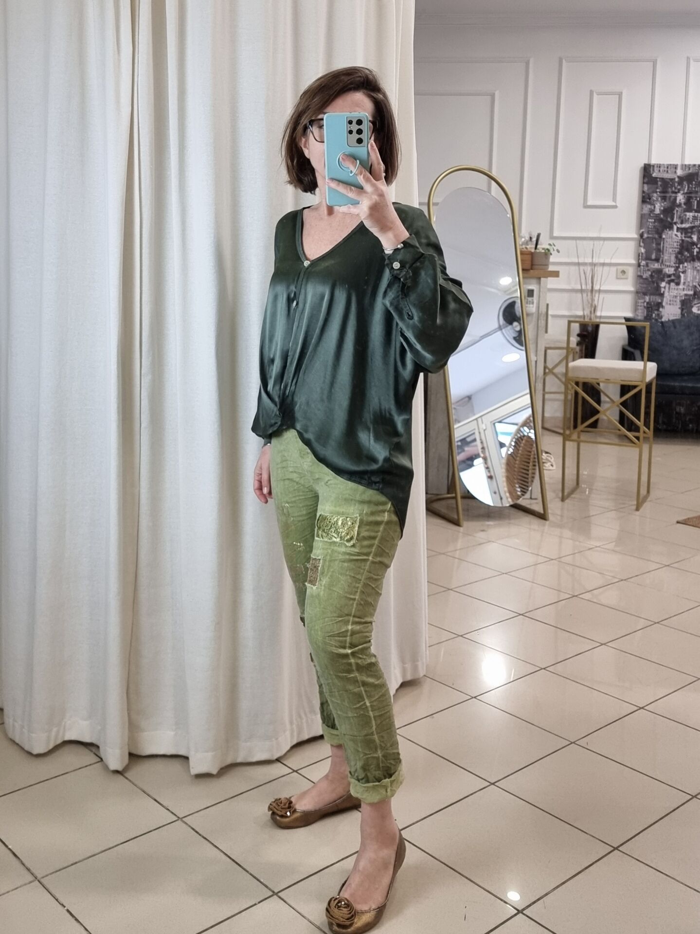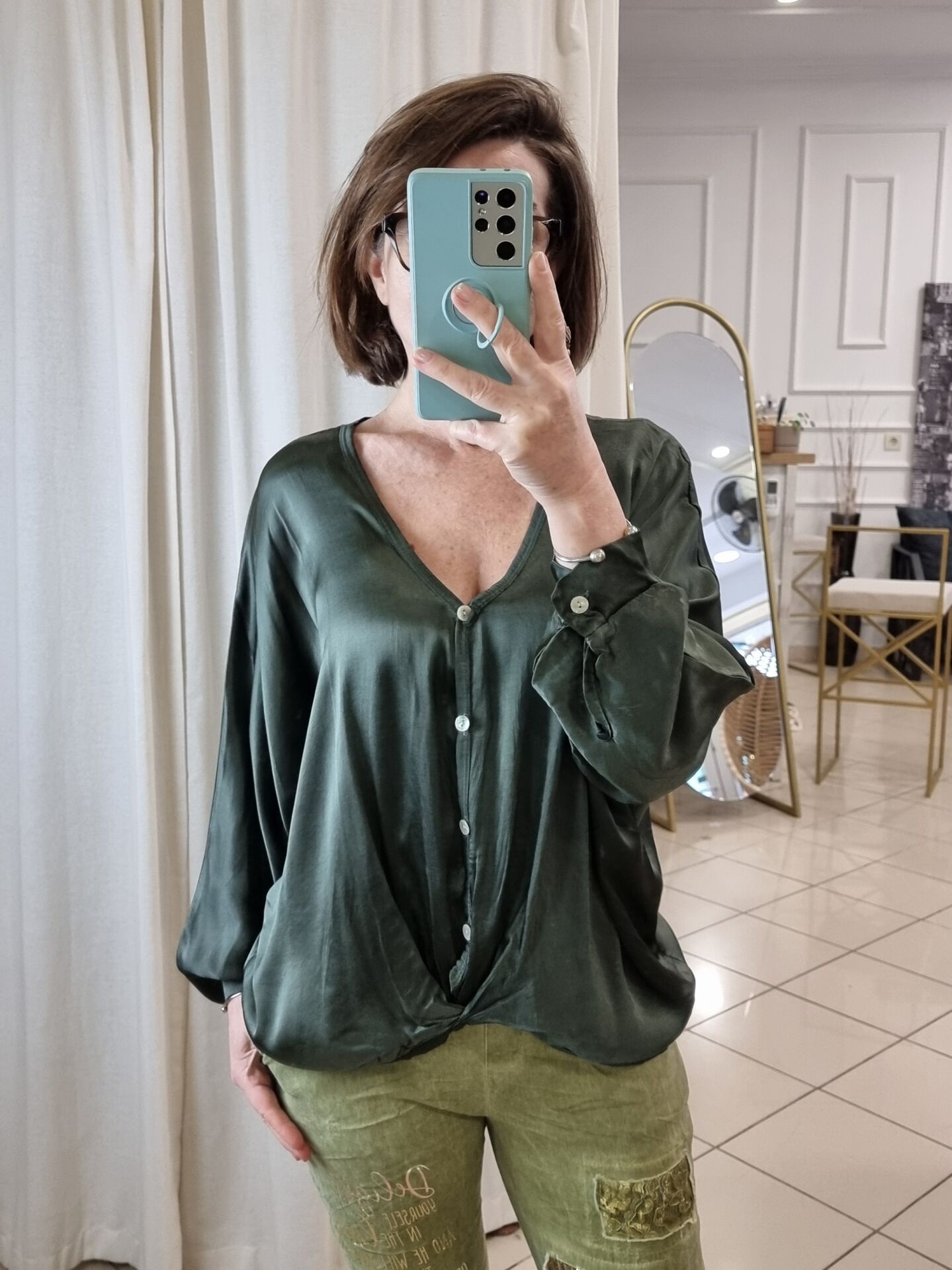 V yaka önü düğmeli dökümlü gömlek.