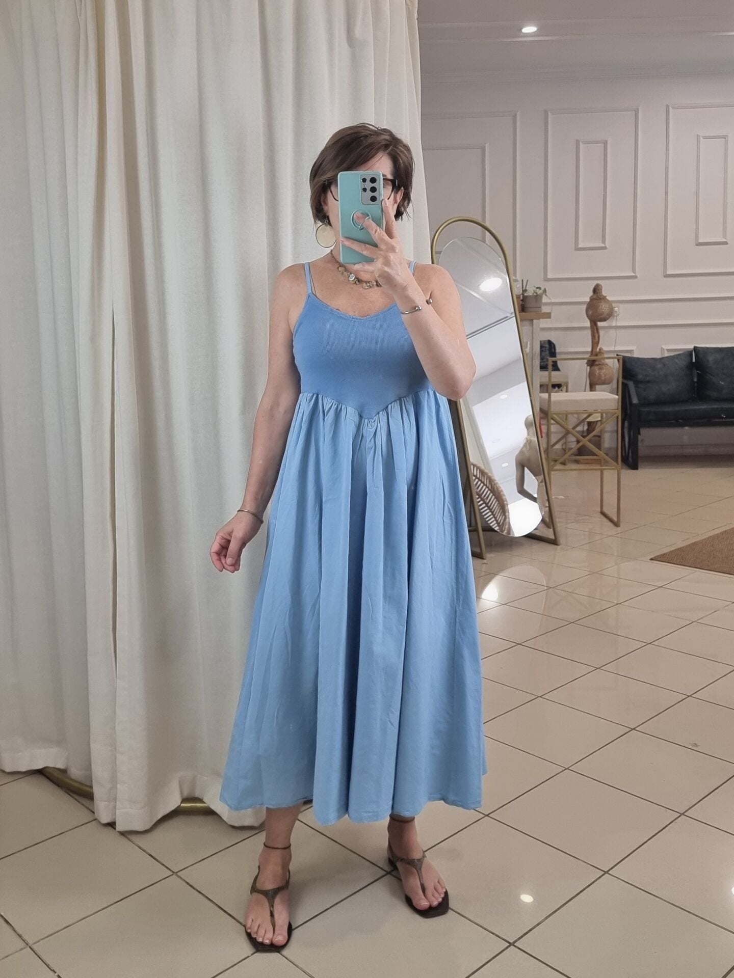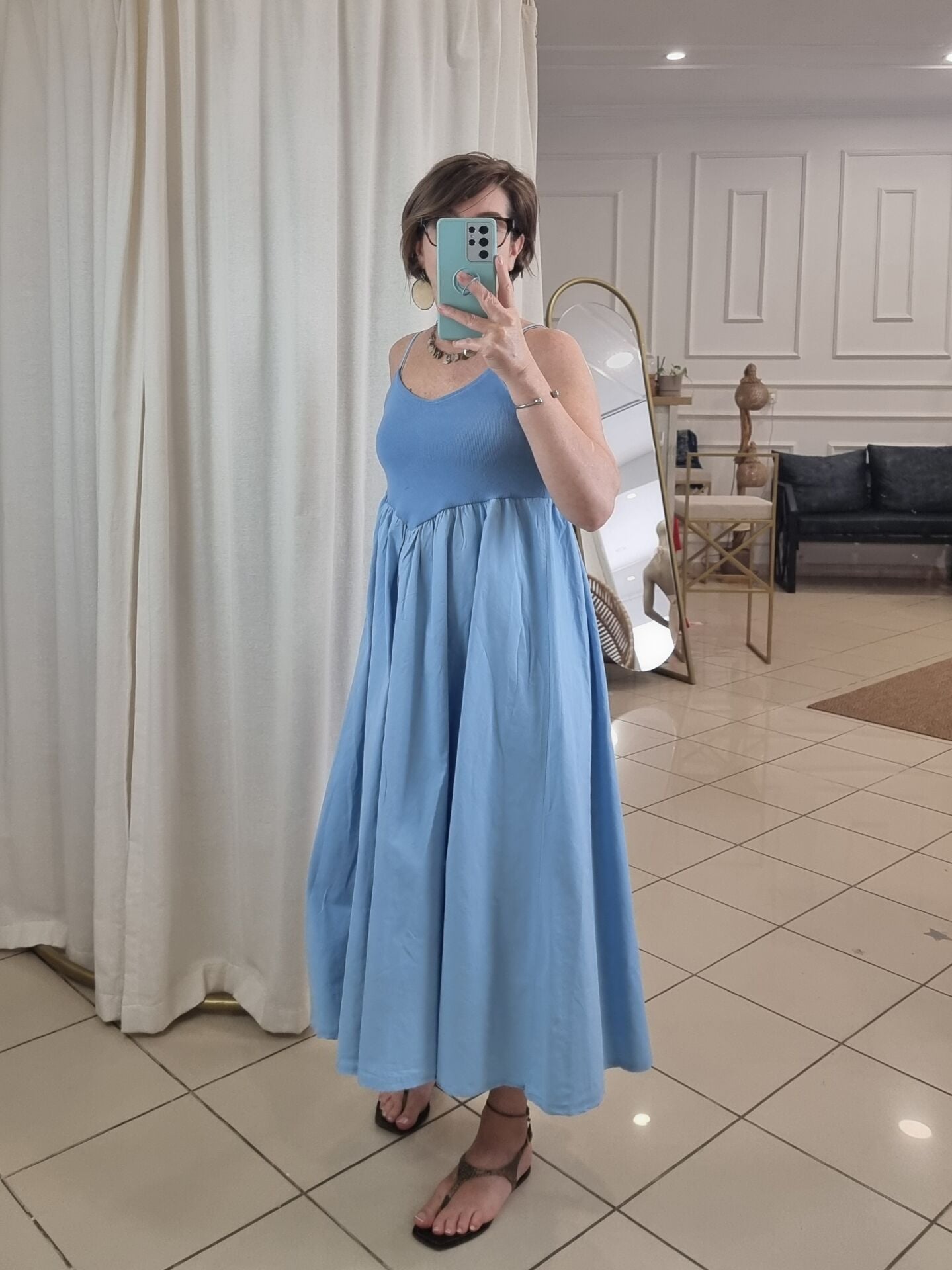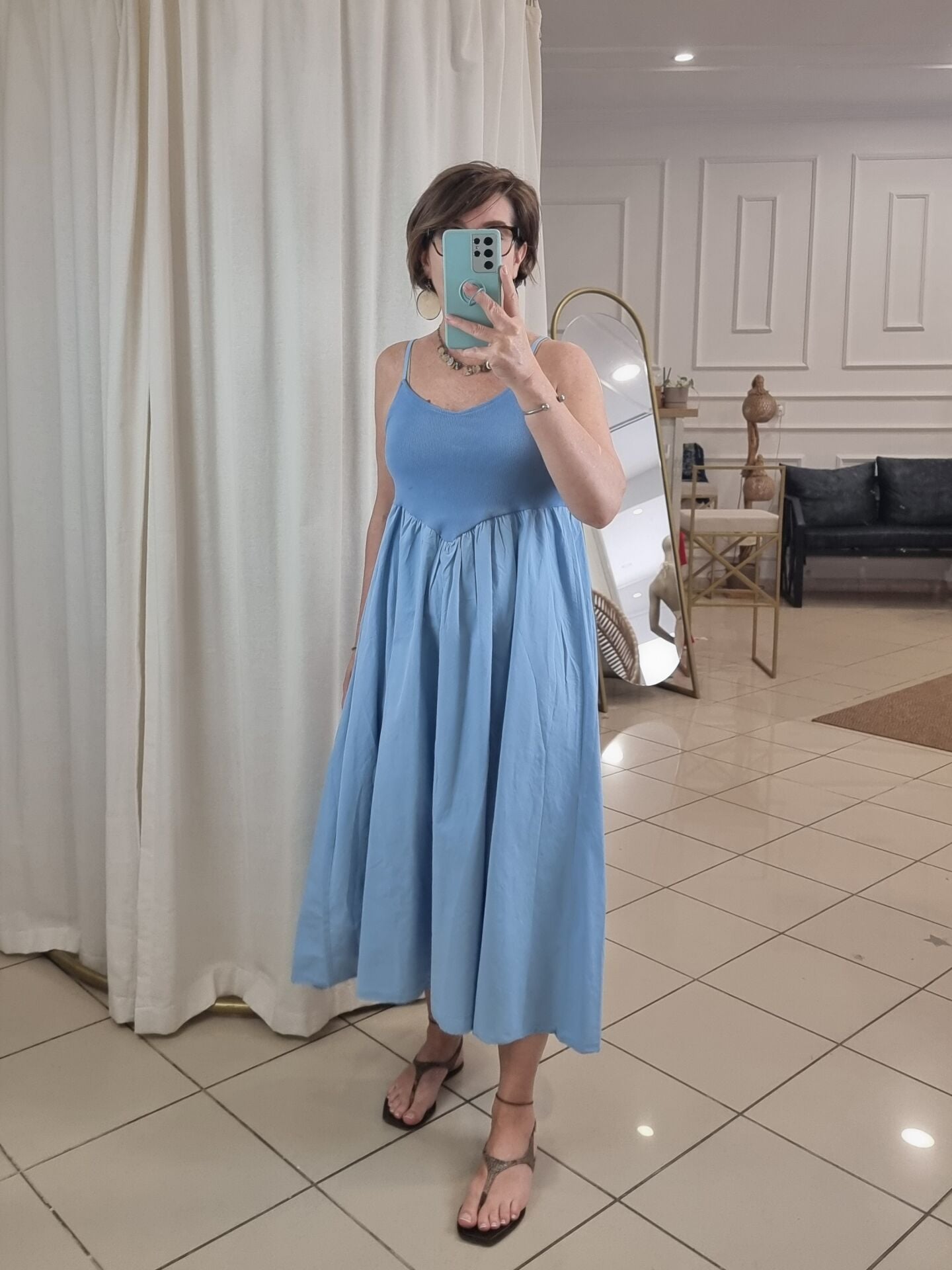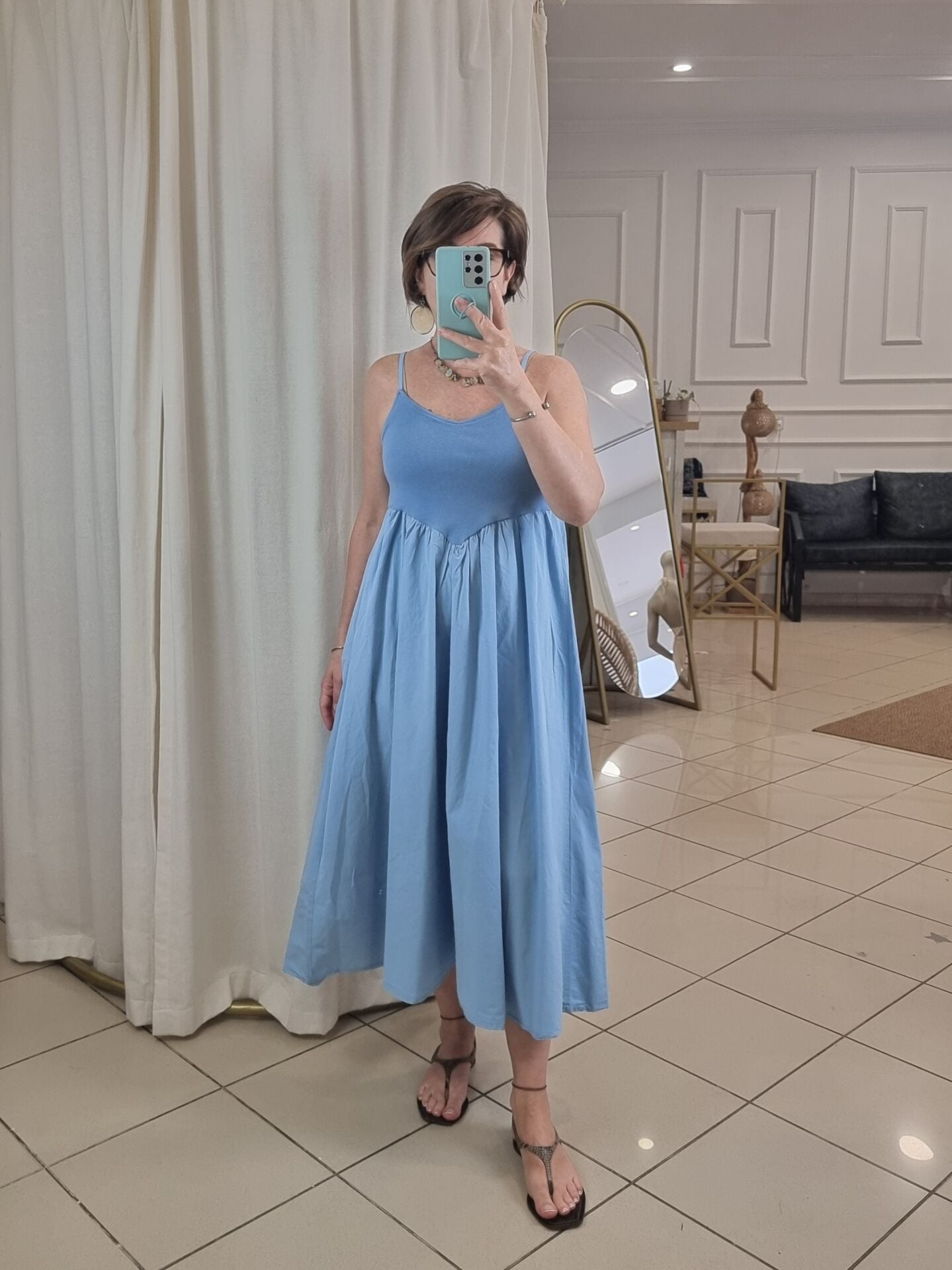 Askılı, göğsü oturan eteği kabarık volanlı midi elbise.