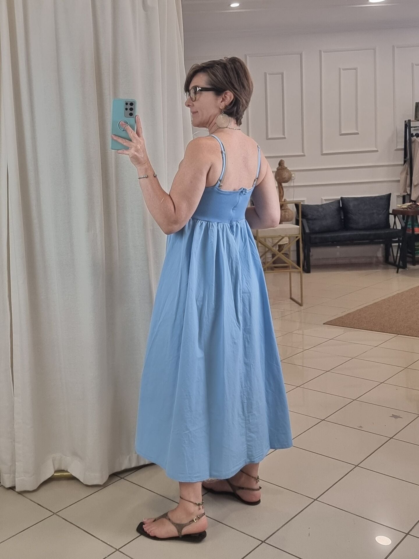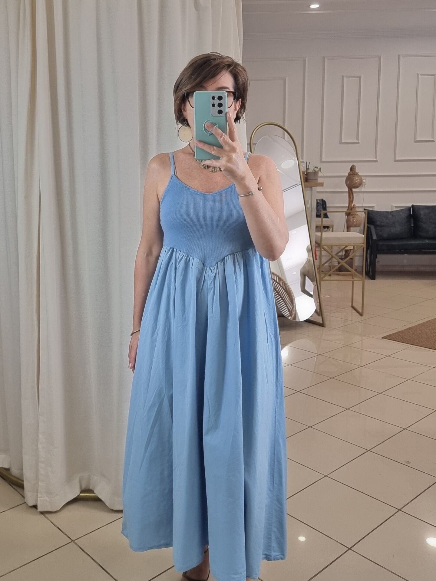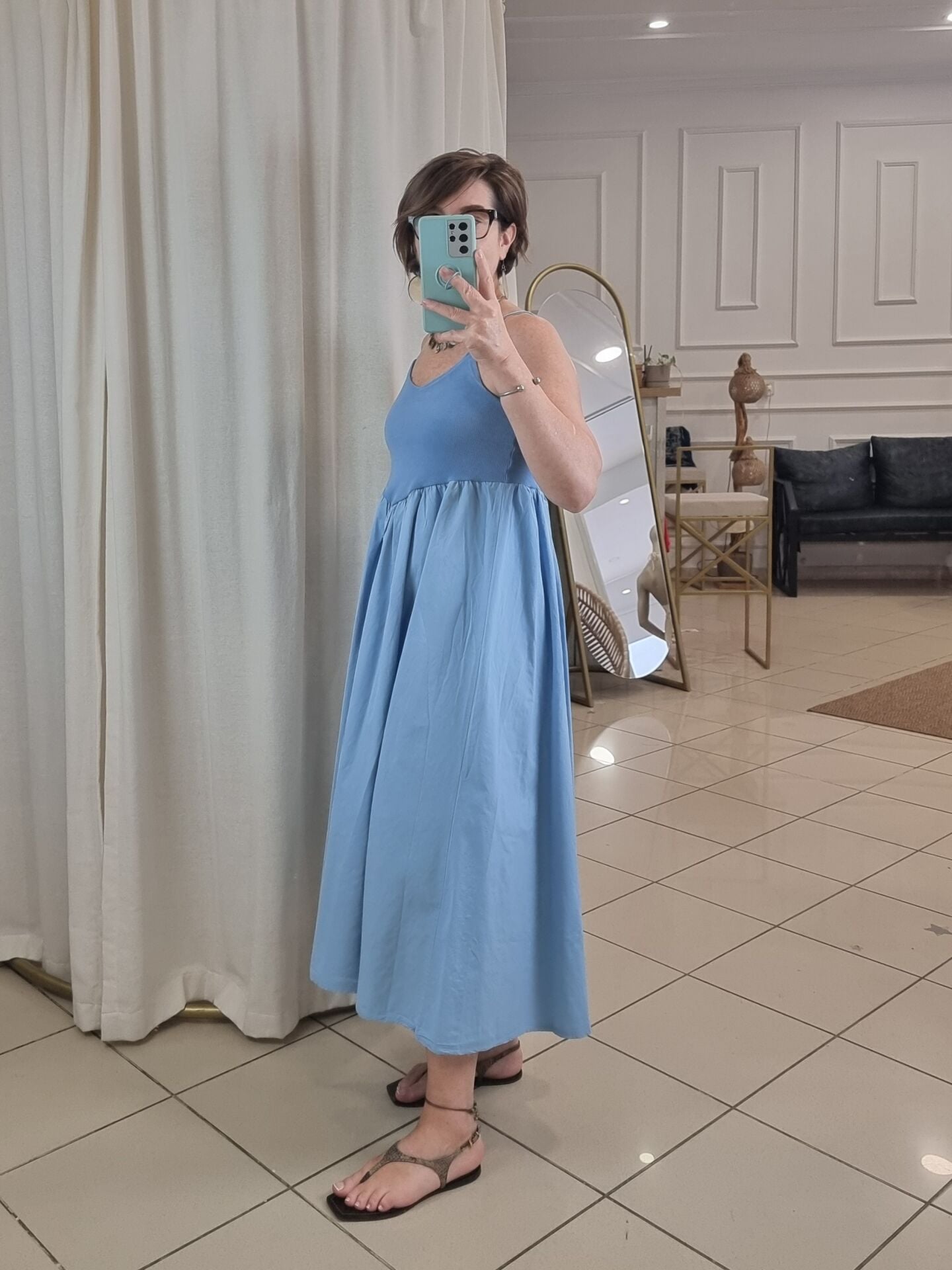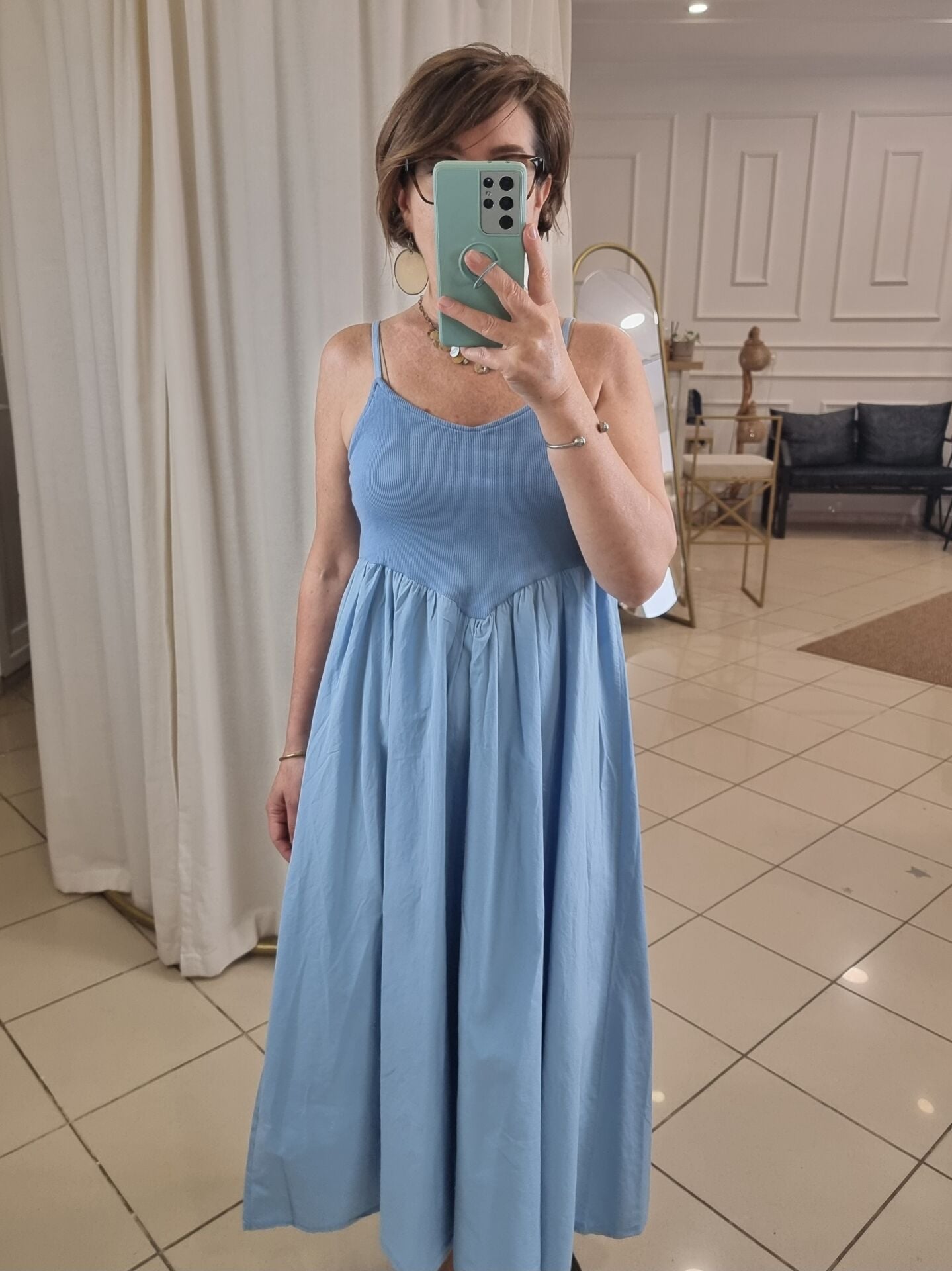 Askılı, göğsü oturan eteği kabarık volanlı midi elbise.