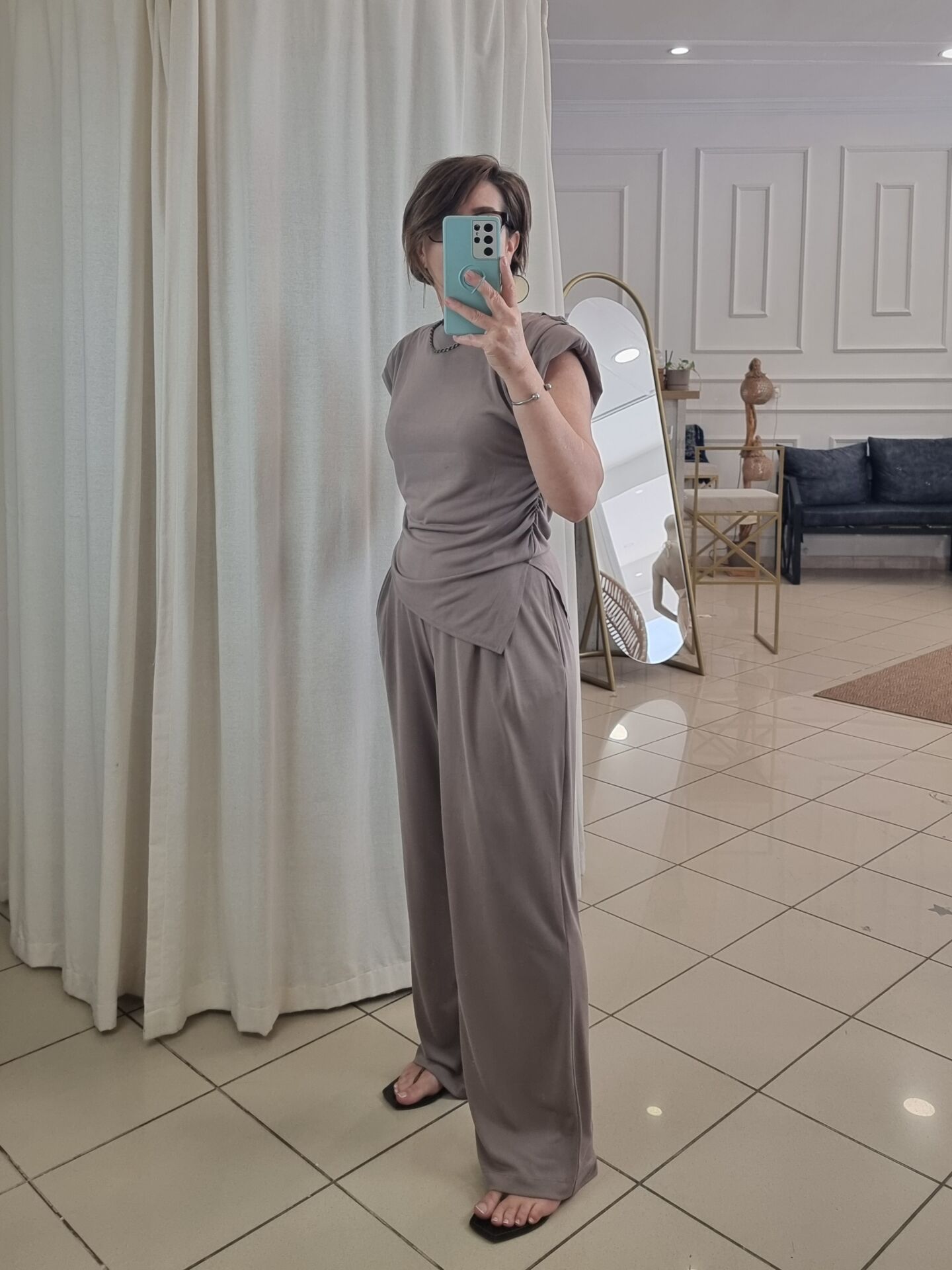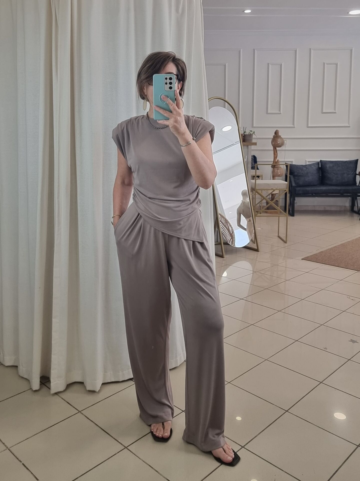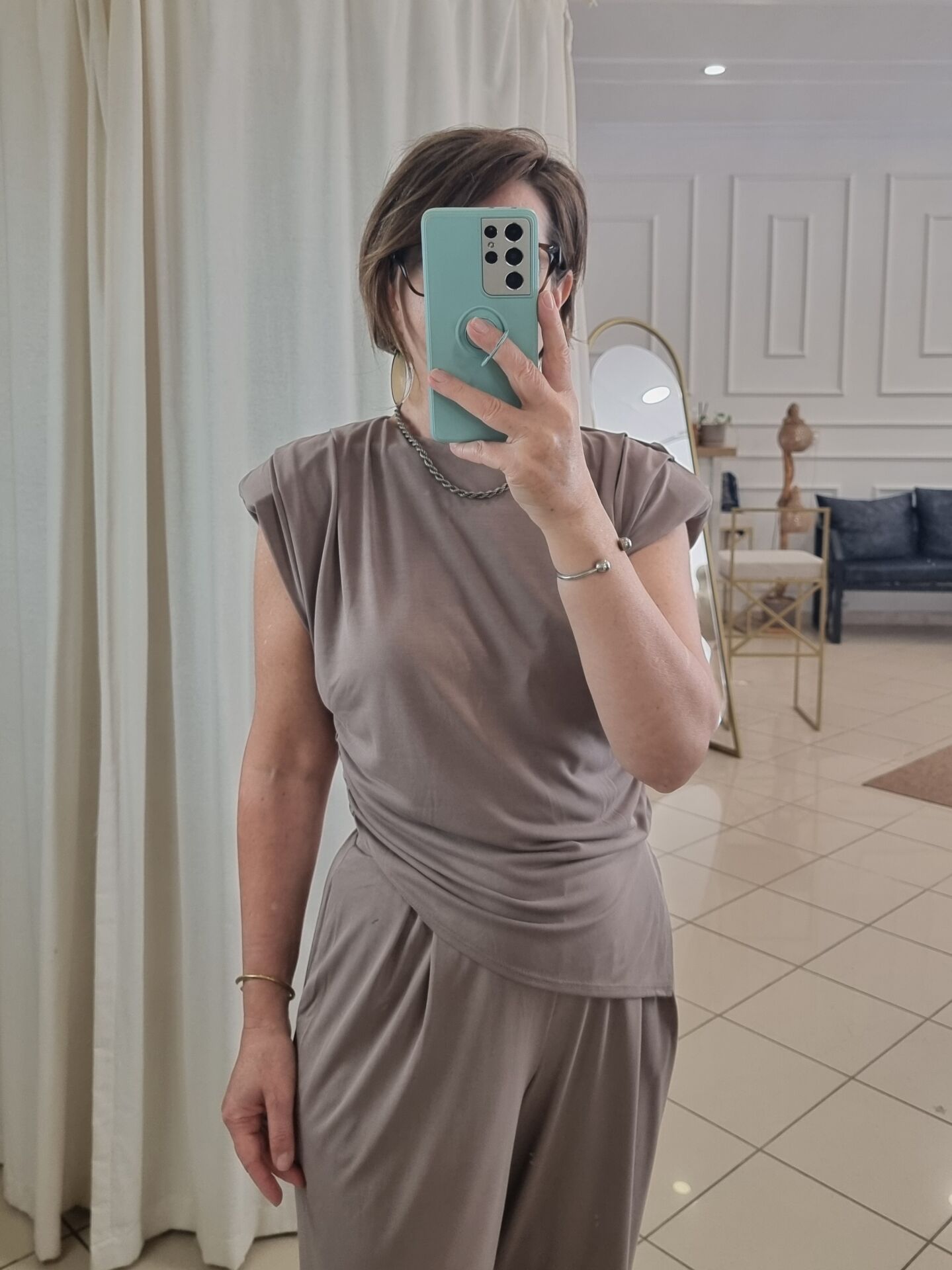 Asimetrik kesim vatkalı bluz.