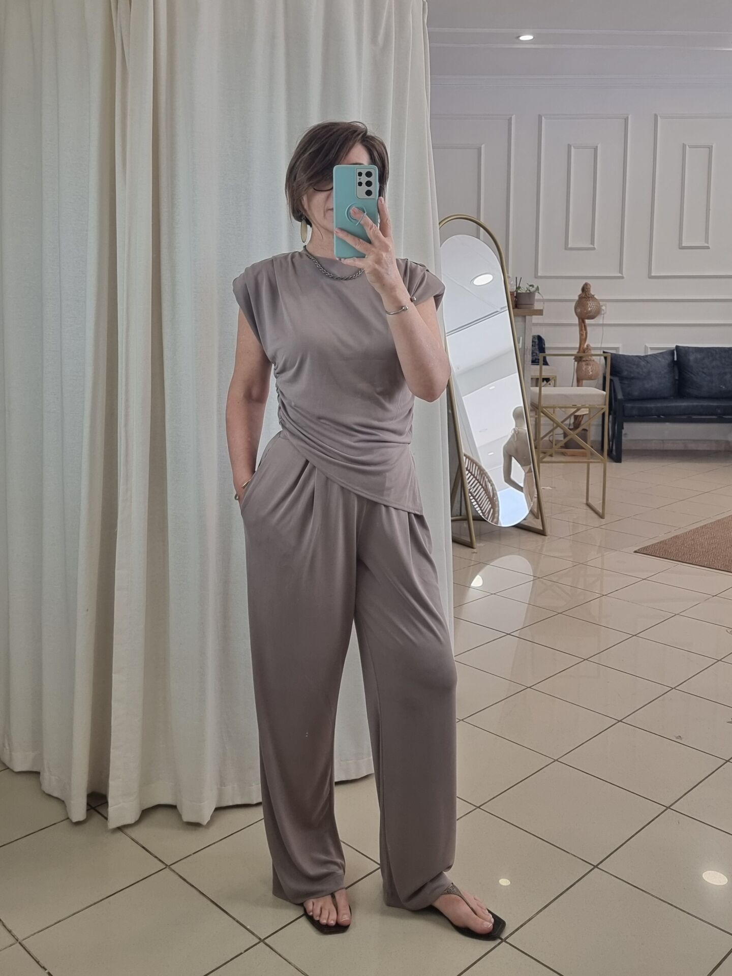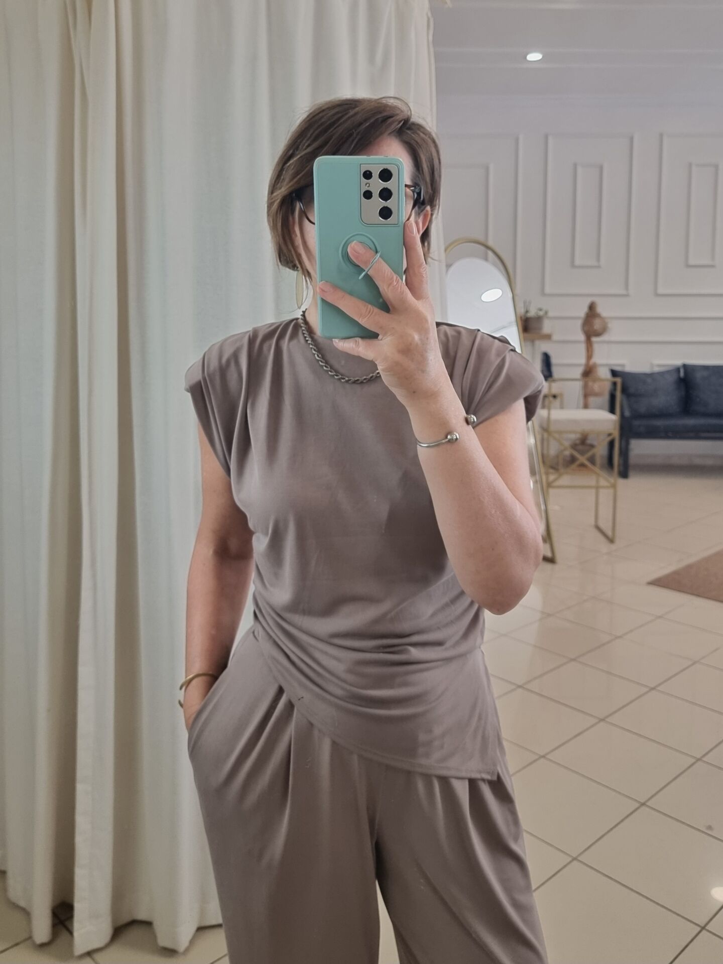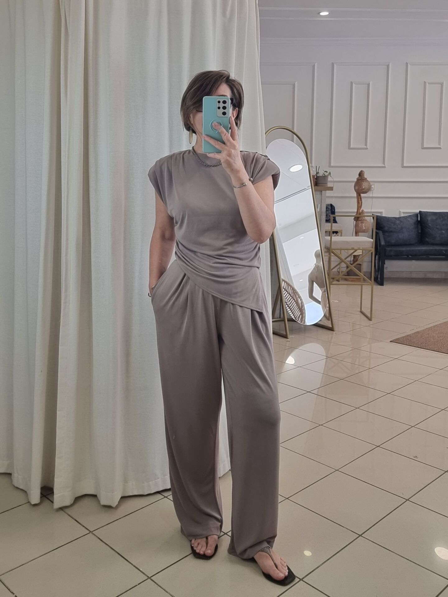 Asimetrik kesim vatkalı bluz.