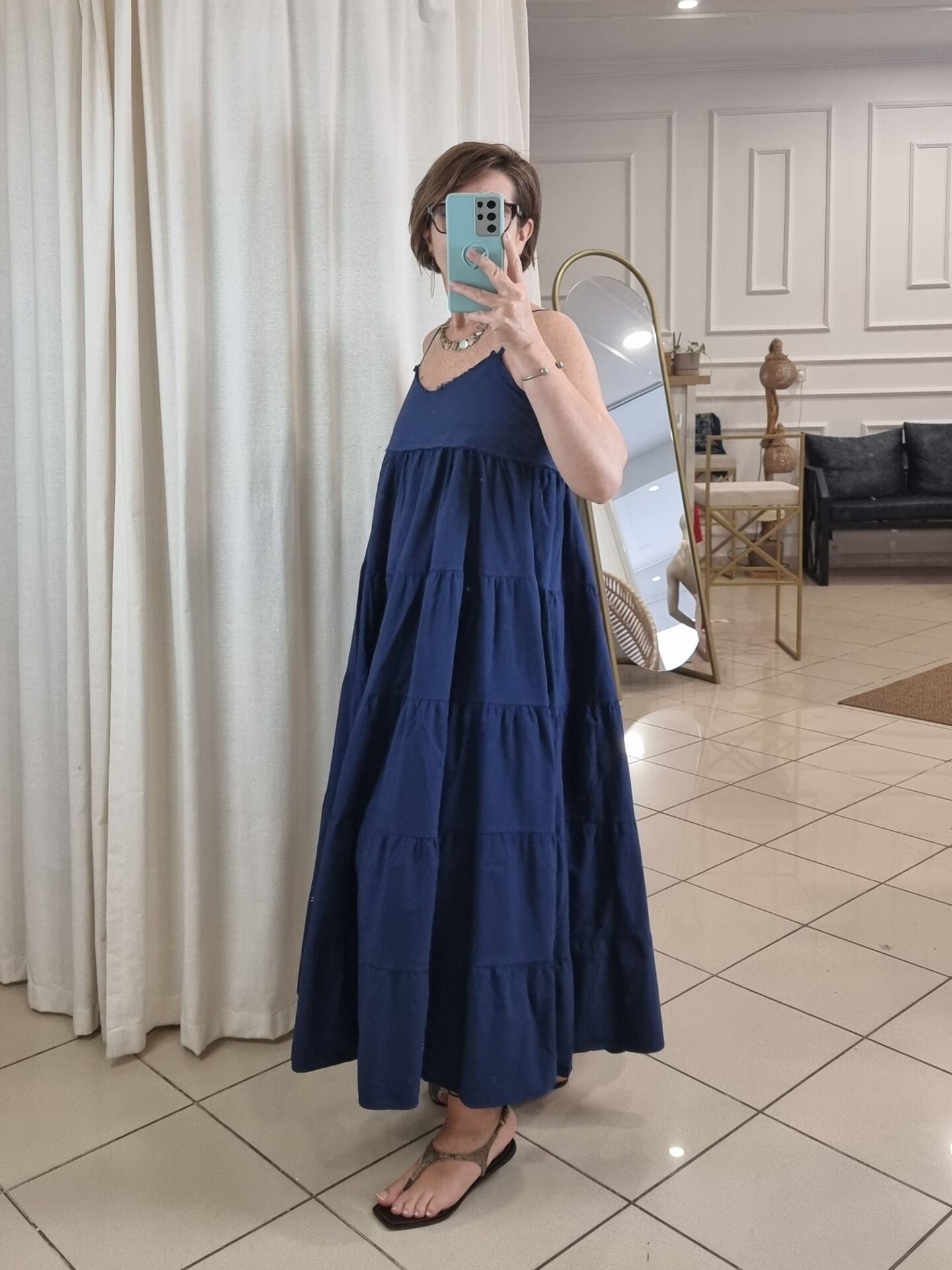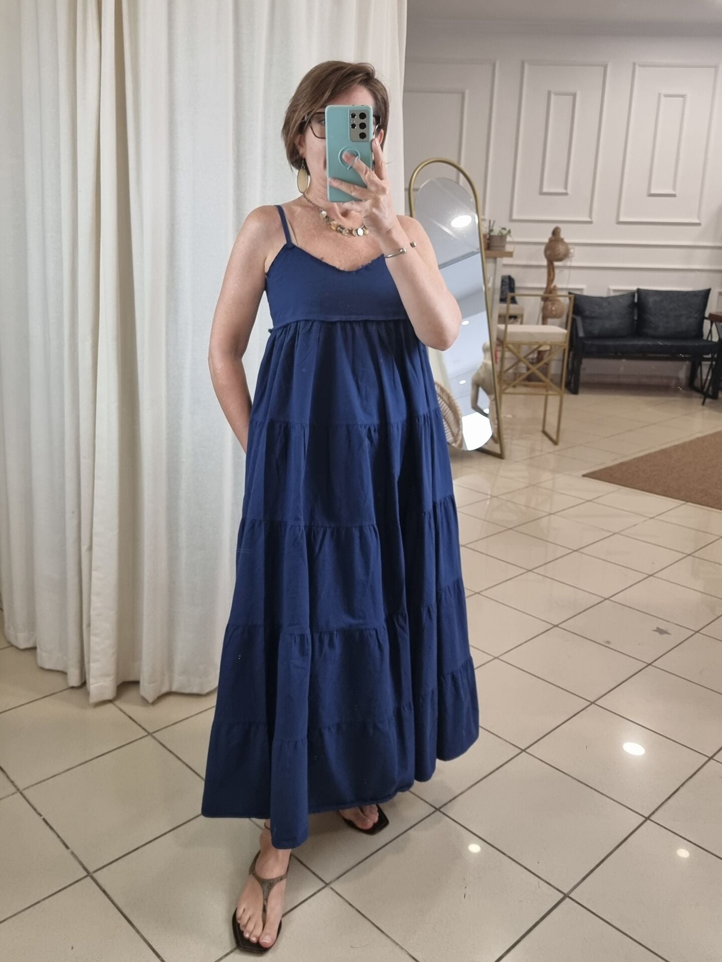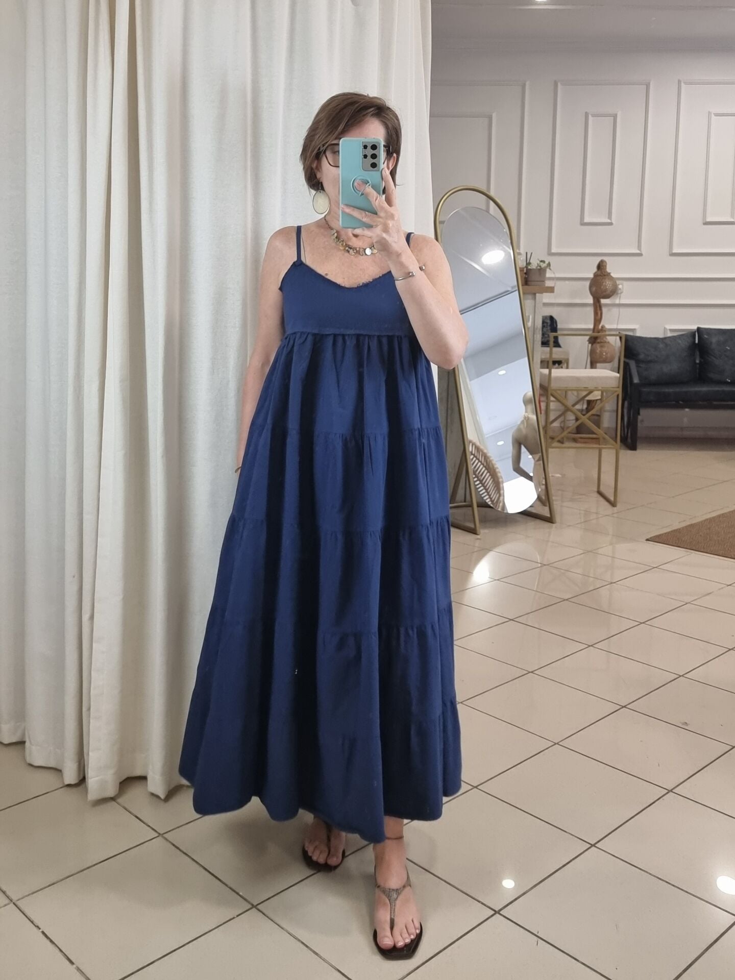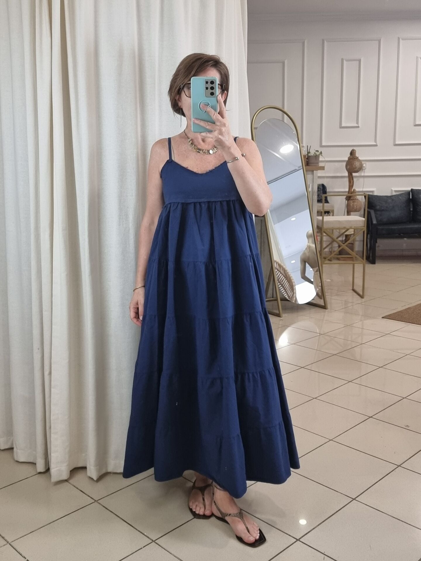 Volanlı Poplin Askılı Uzun Lacivert Elbise