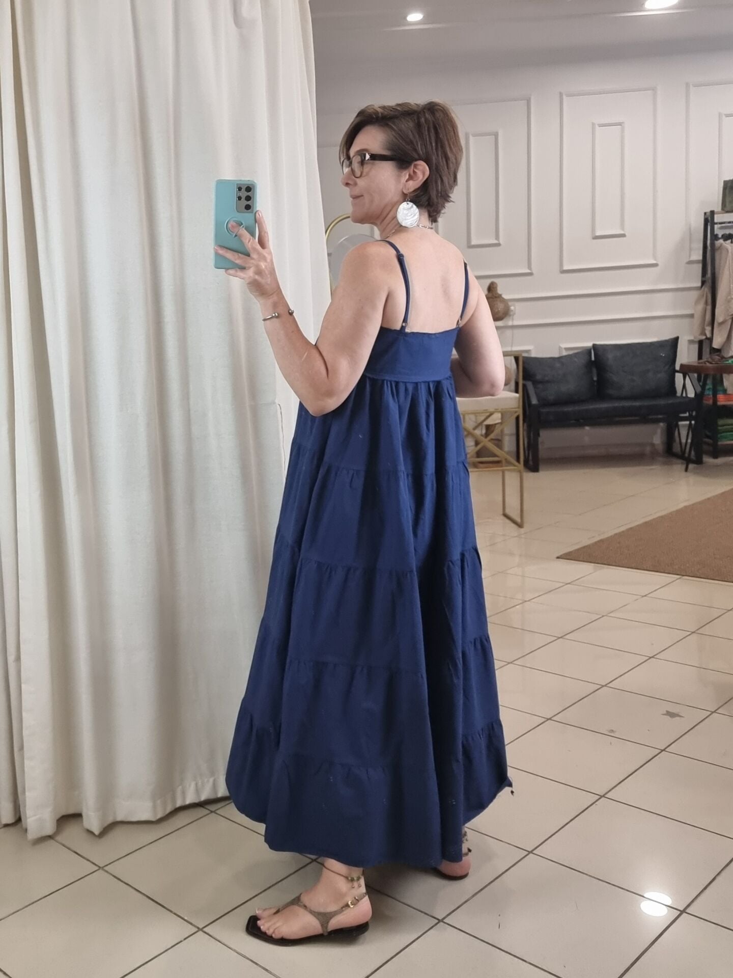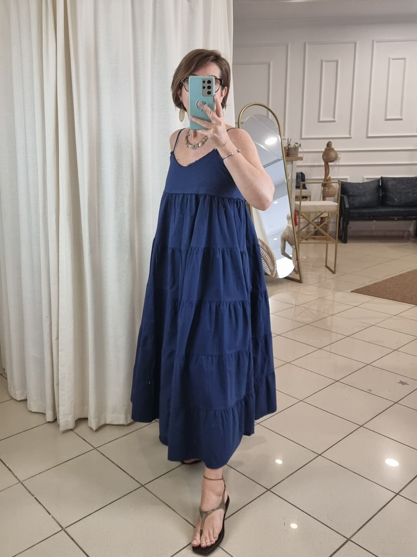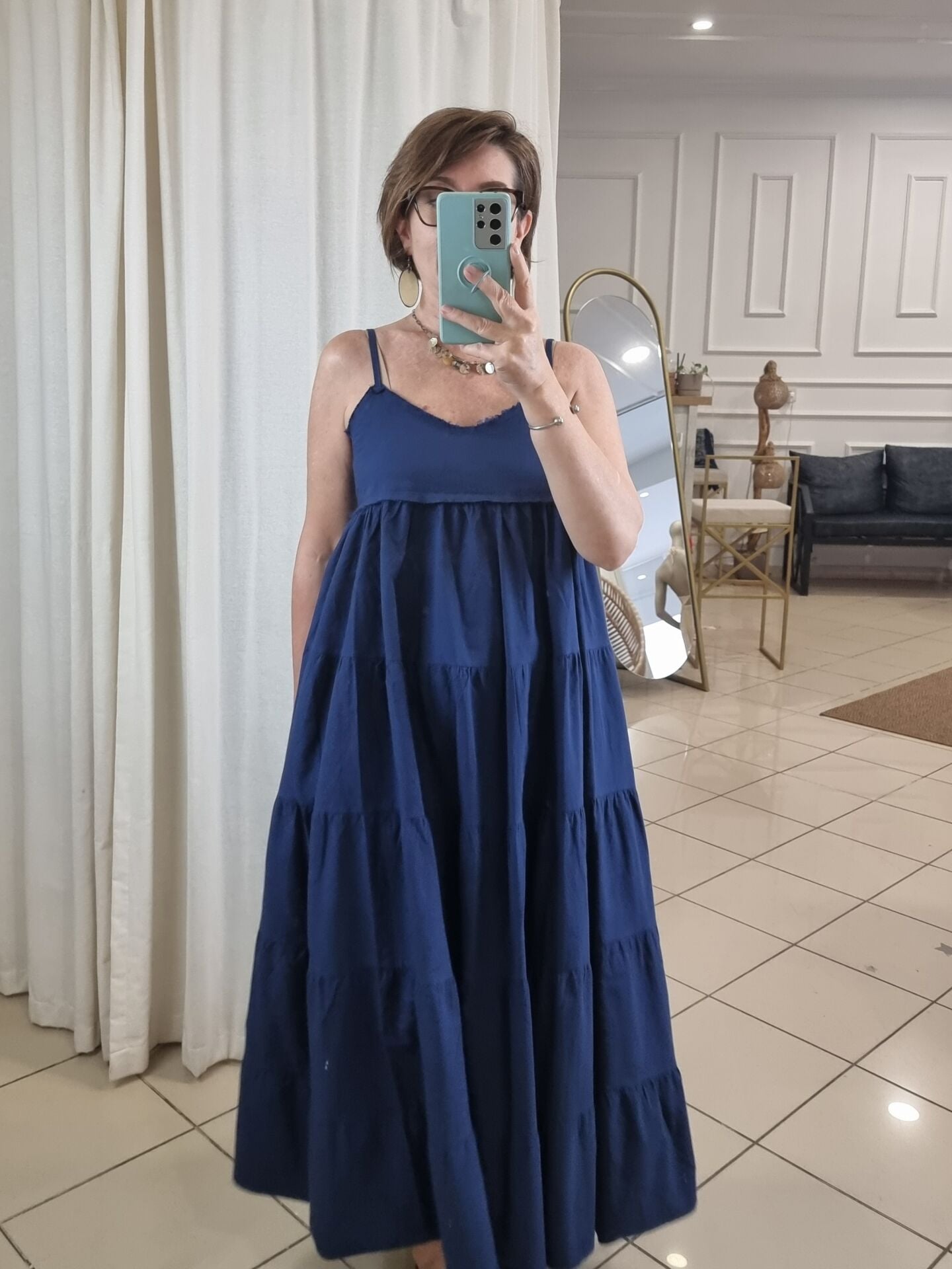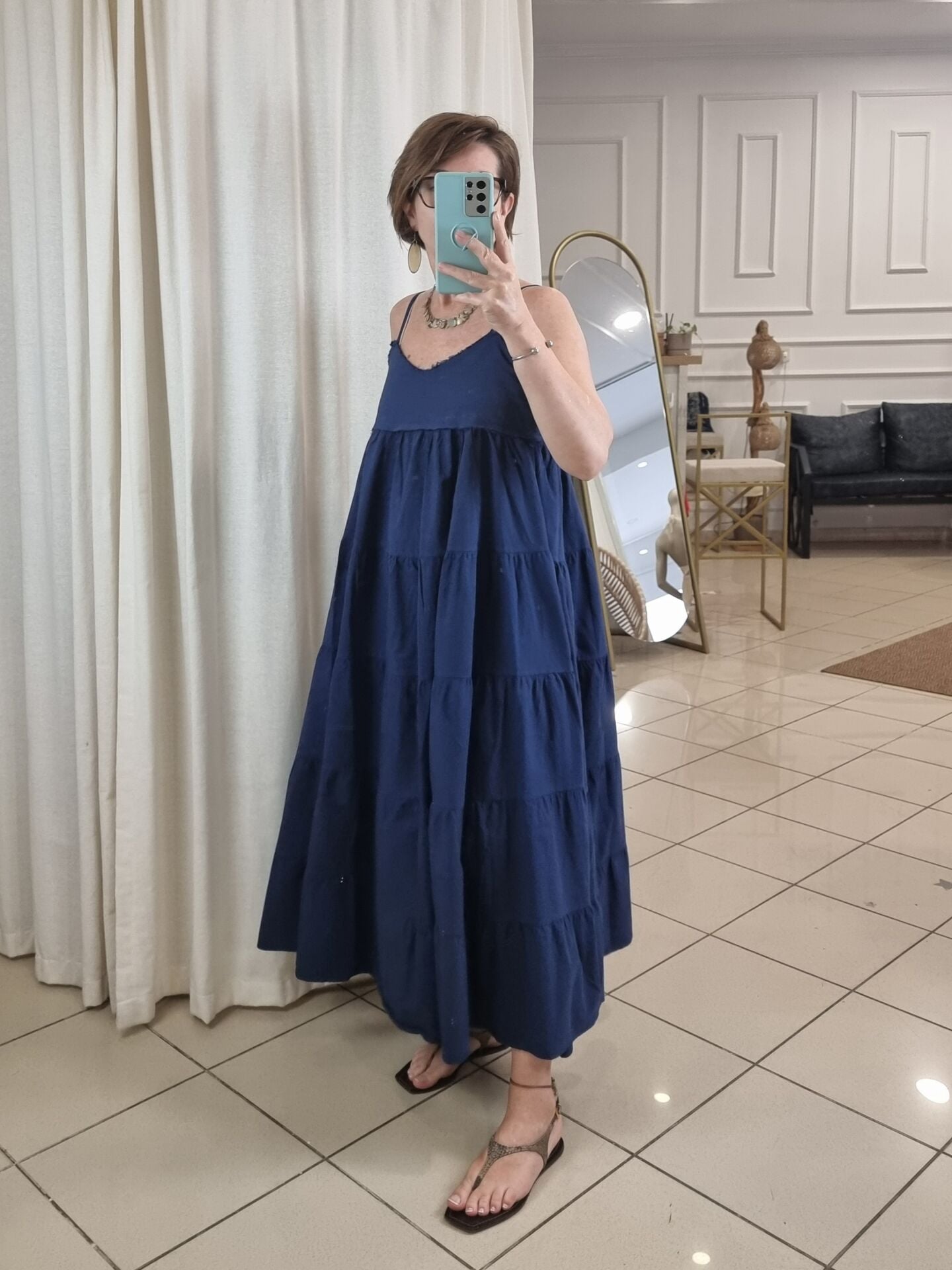 Volanlı Poplin Askılı Uzun Lacivert Elbise