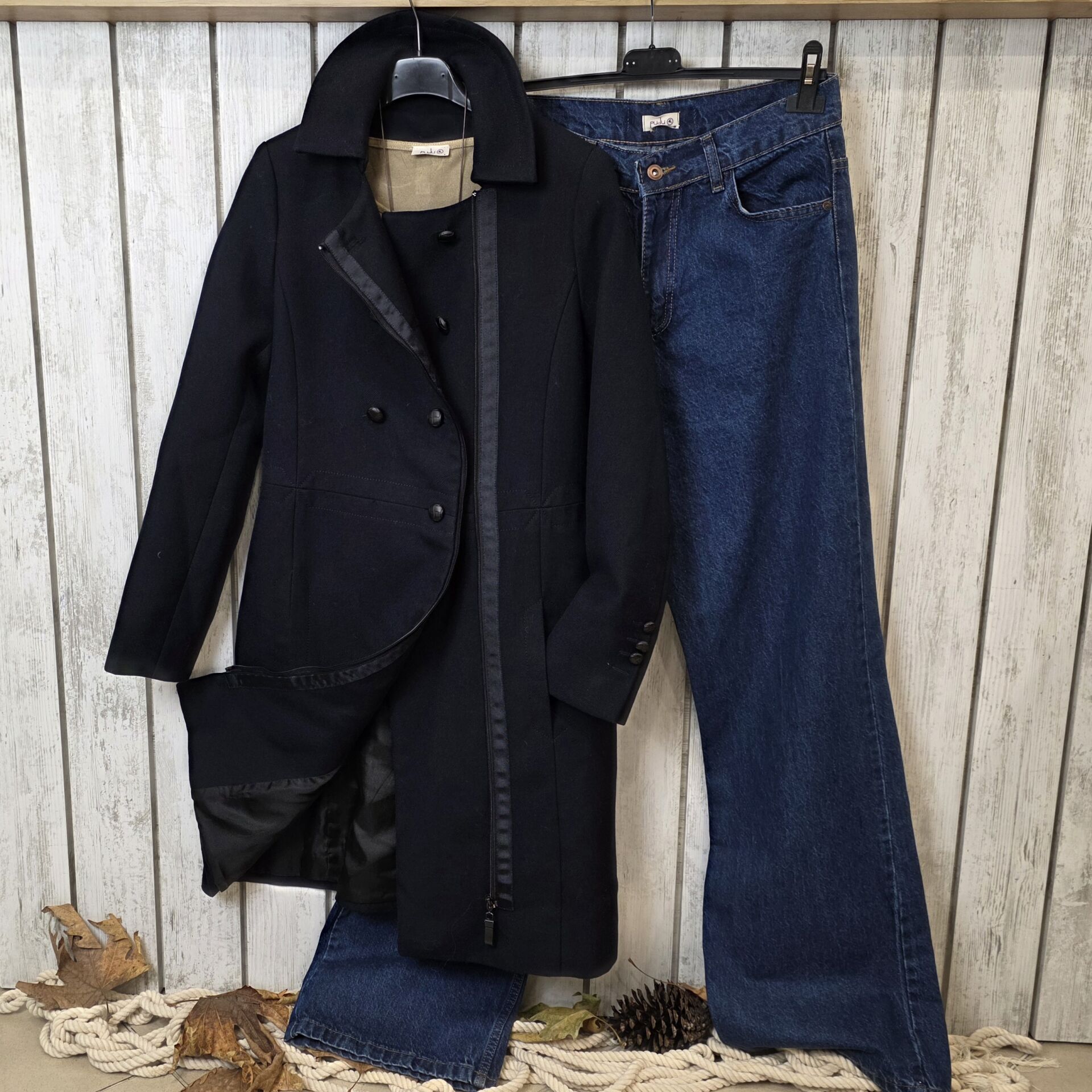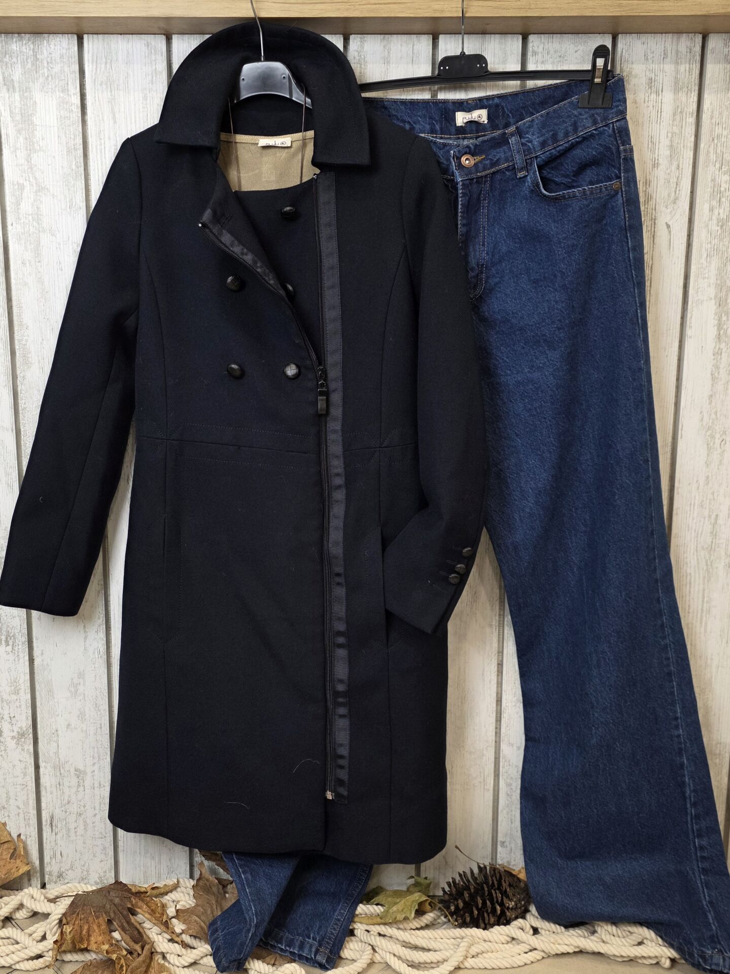 Önden çift sıra düğme ve fermuar kapamalı manto.