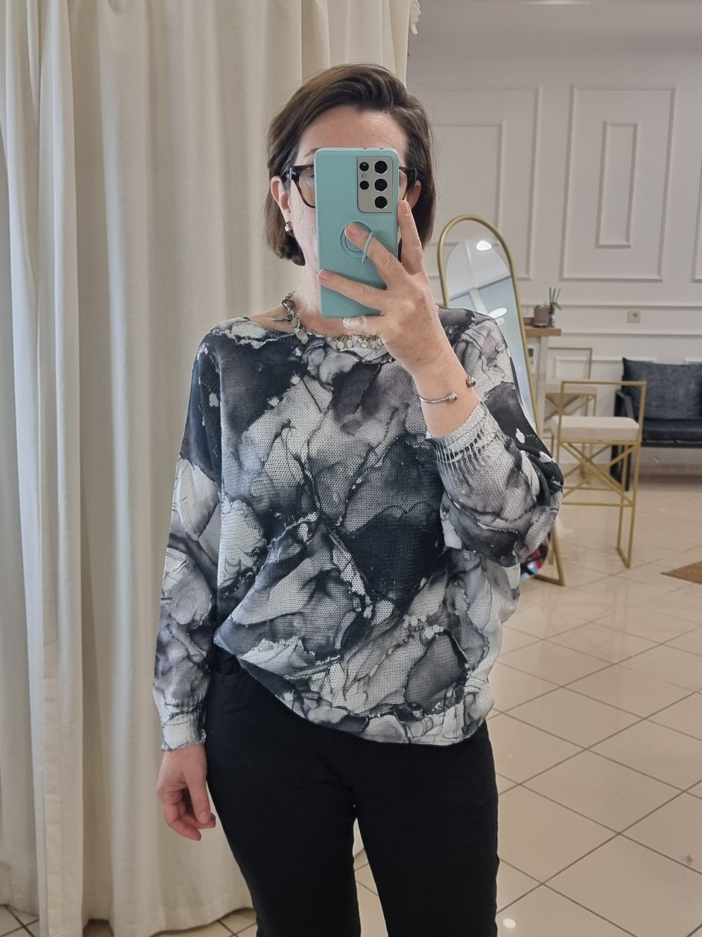 İnce, esnek dokuma İtalyan triko kazak. Kayık yaka. Uzun, yarasa kol. Esnek dokuma. Etek ucuna doğru daralan kesim. Özel yıkamalı bir ürün olduğu için kat yerlerinde beyazlıklar olabilir. Ürüne has bir özelliktir.