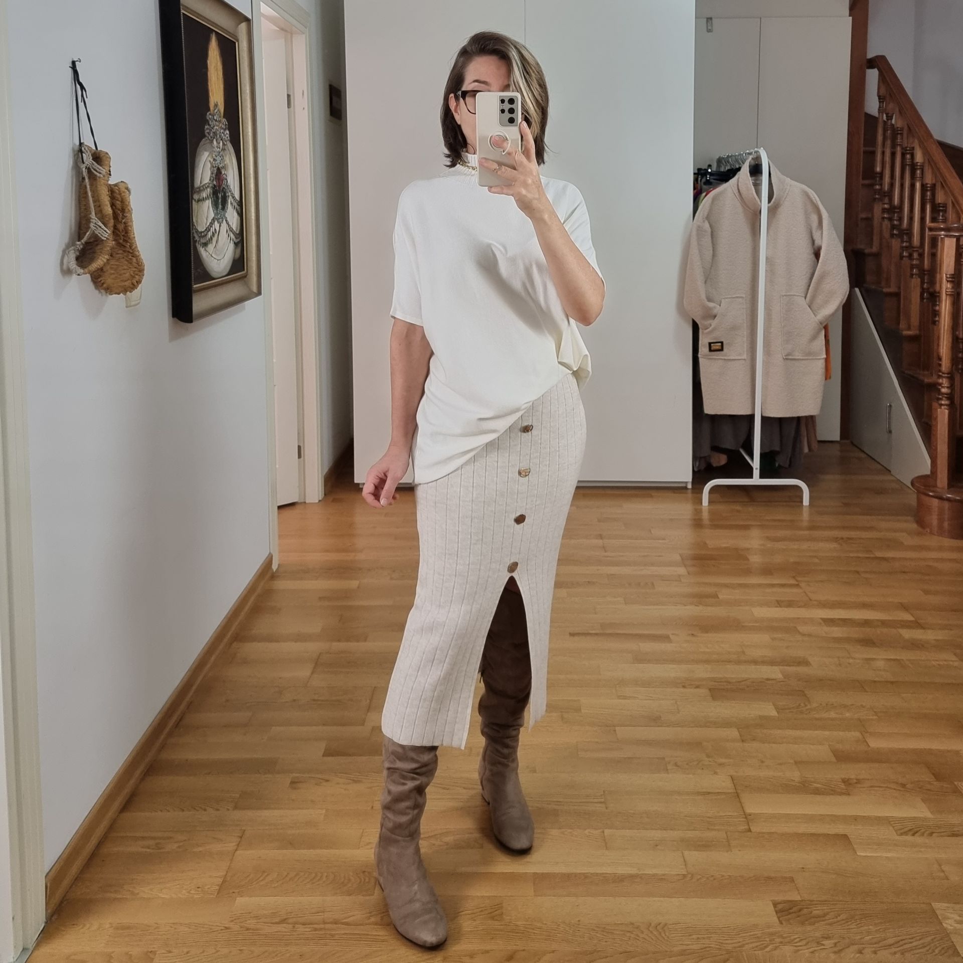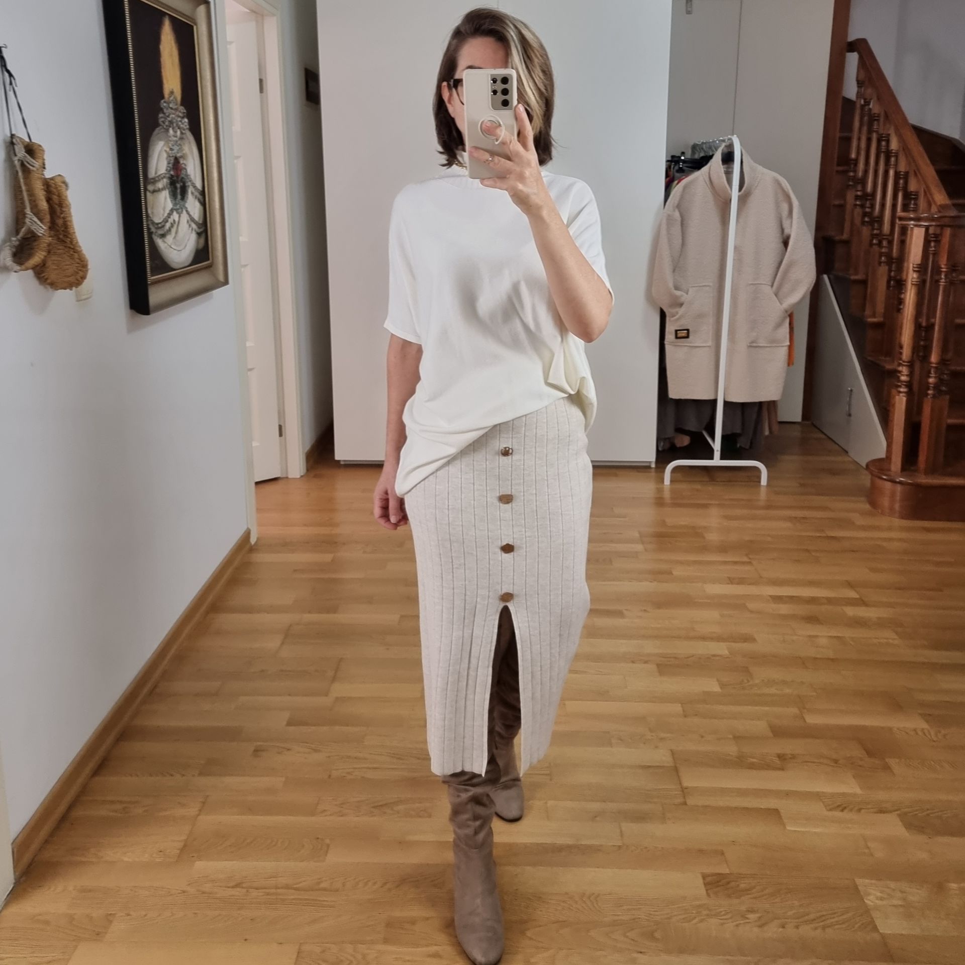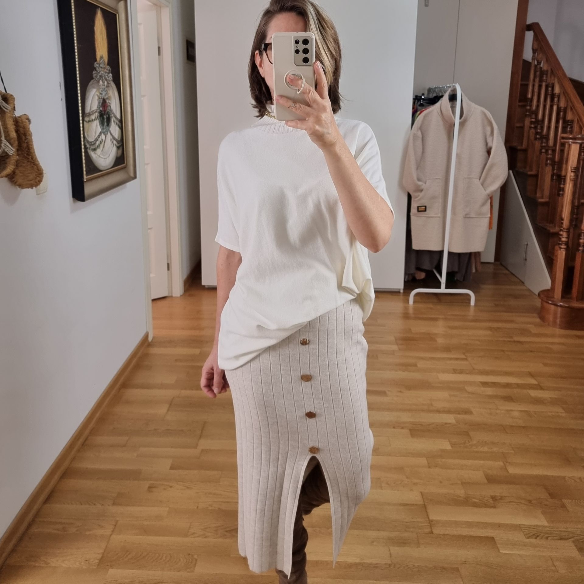 Önü yırtmaçlı, likralı triko etek.
