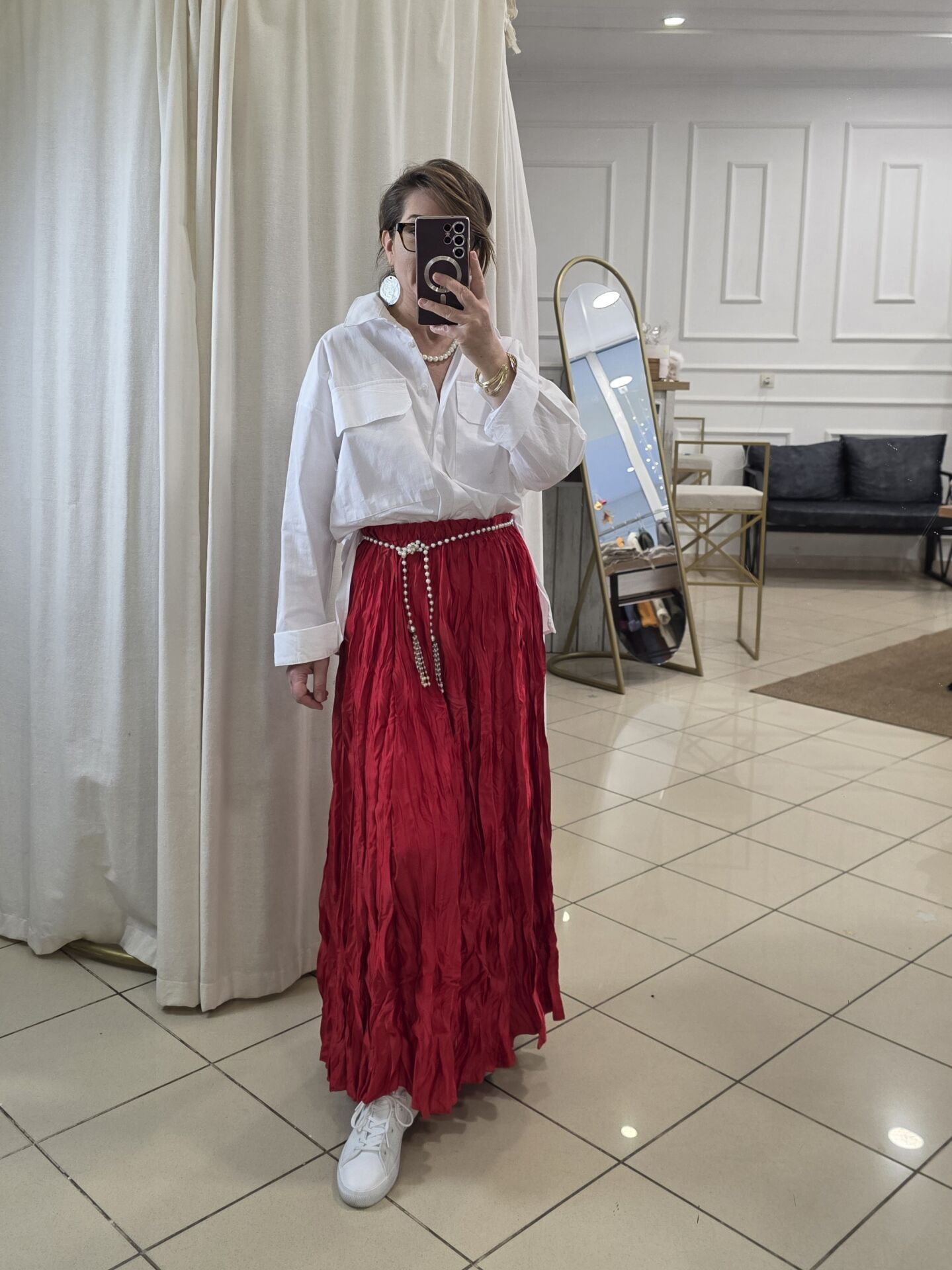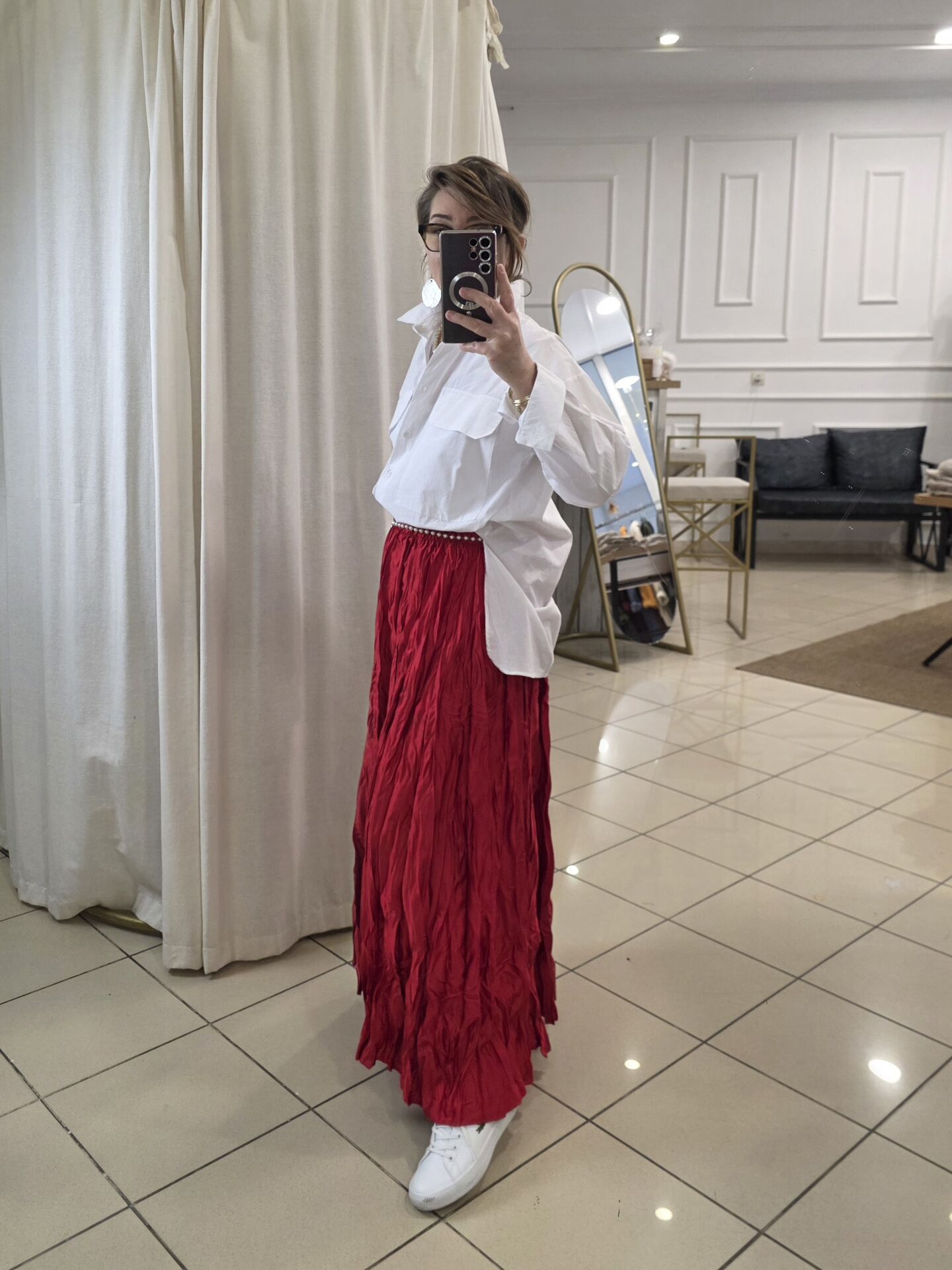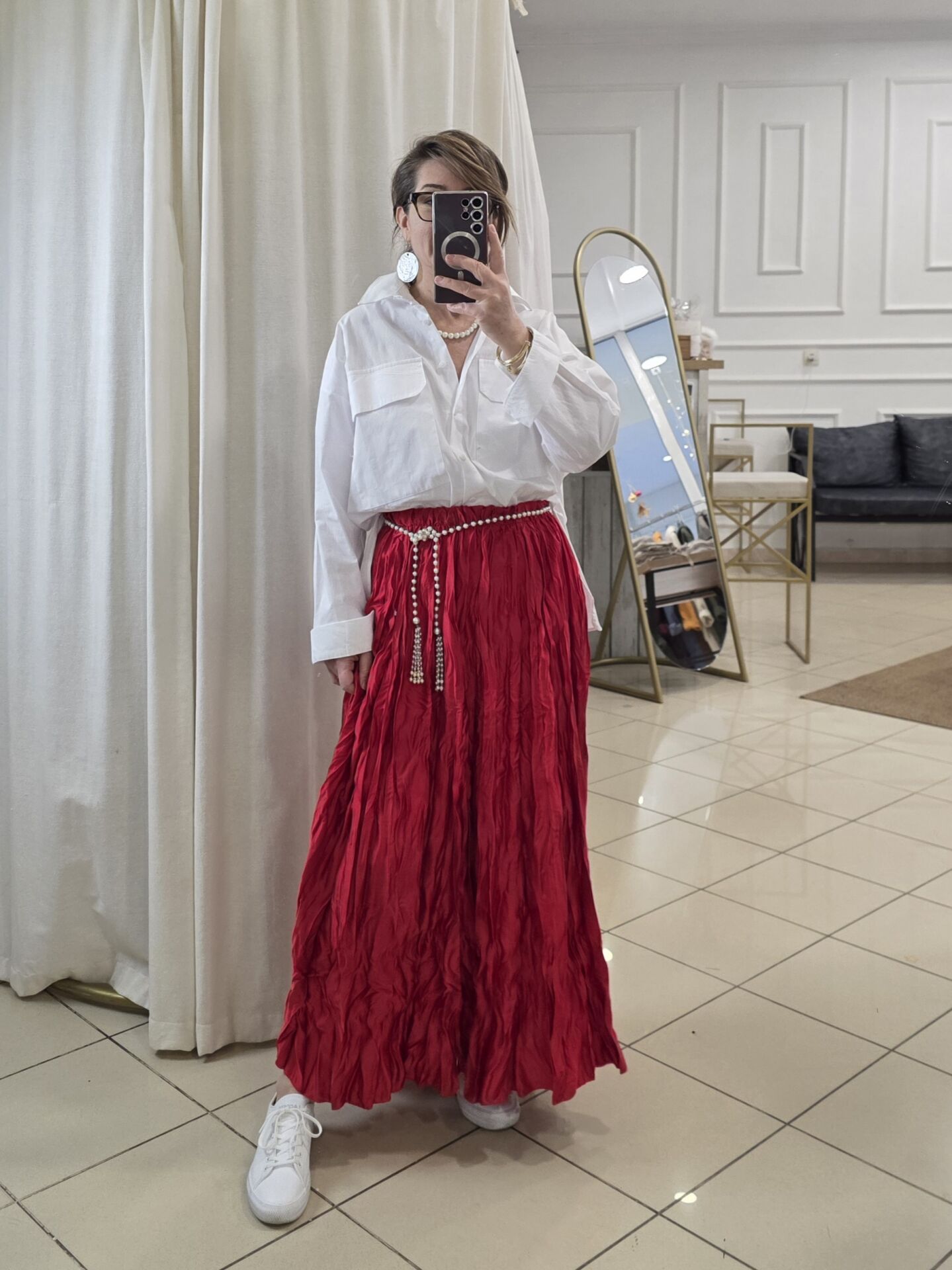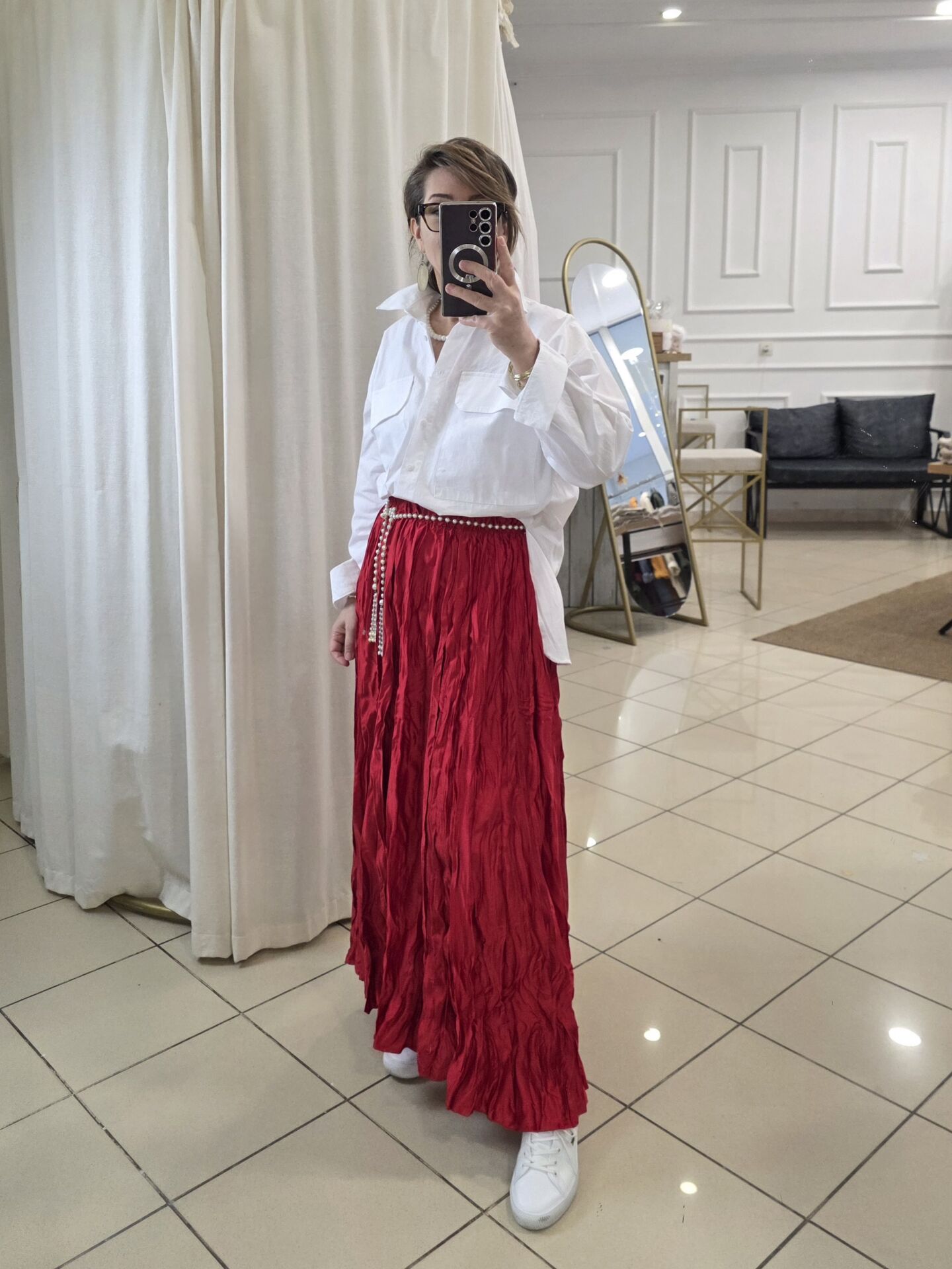 Kırmızı Bürümcük Uzun Saten Etek