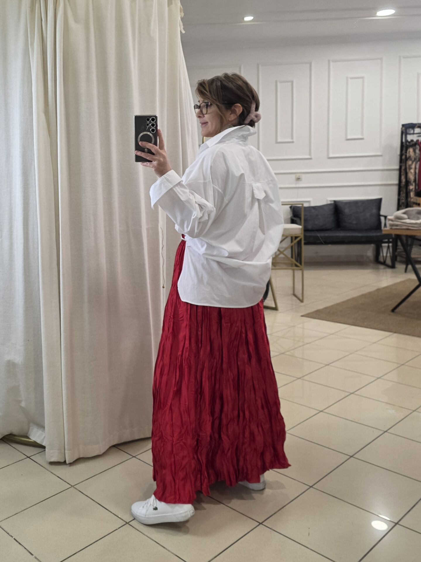 Buruşuk doku, beli lastikli uzun etek.