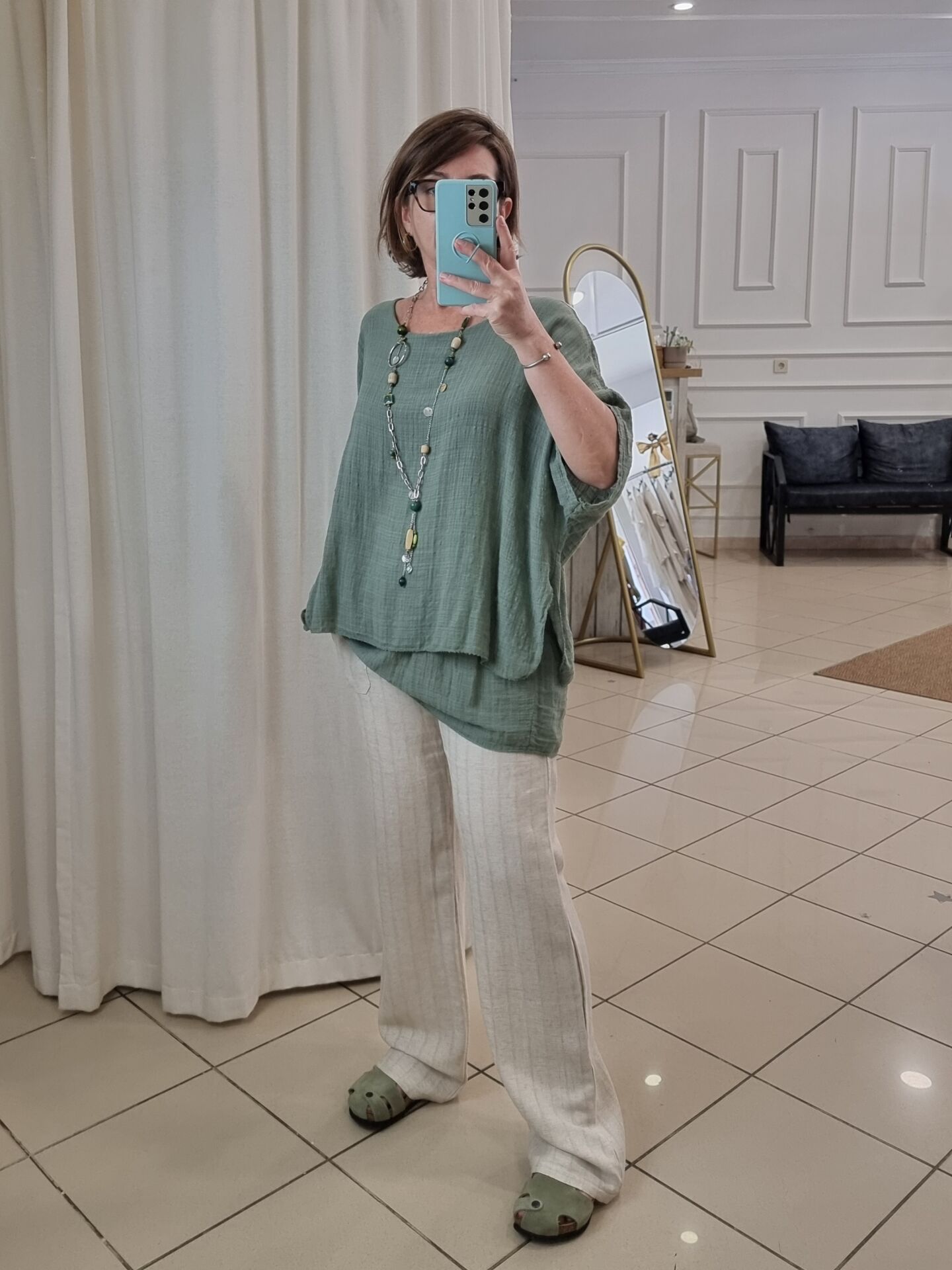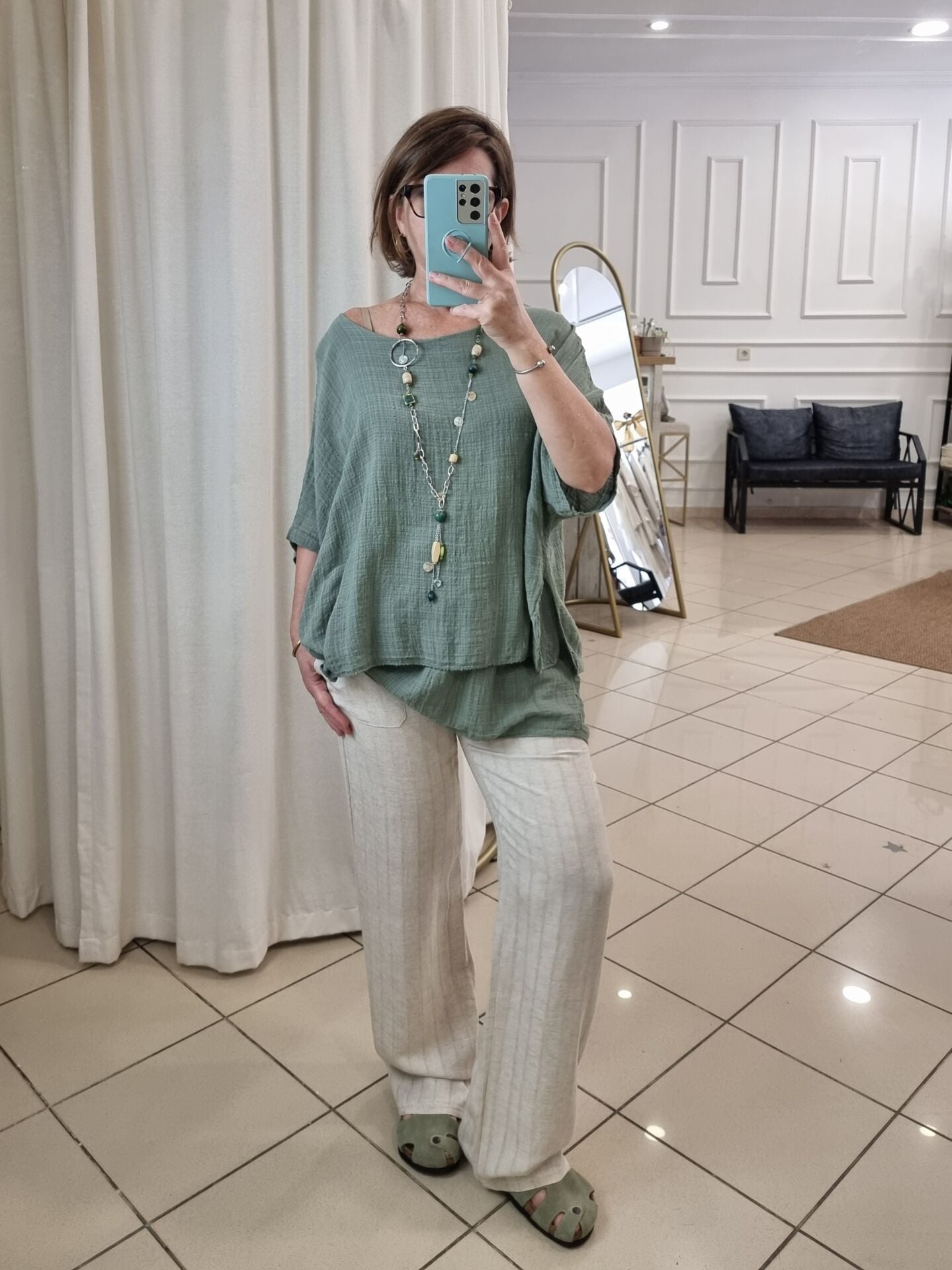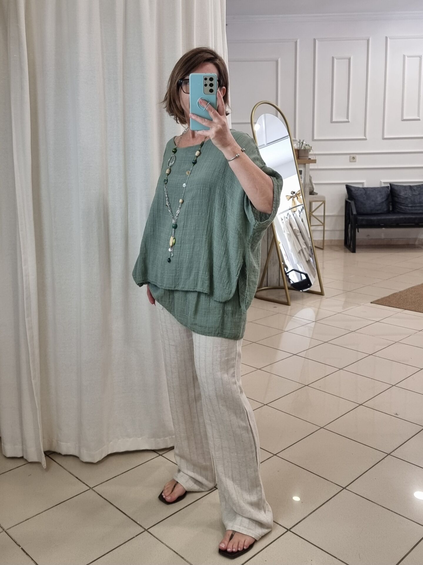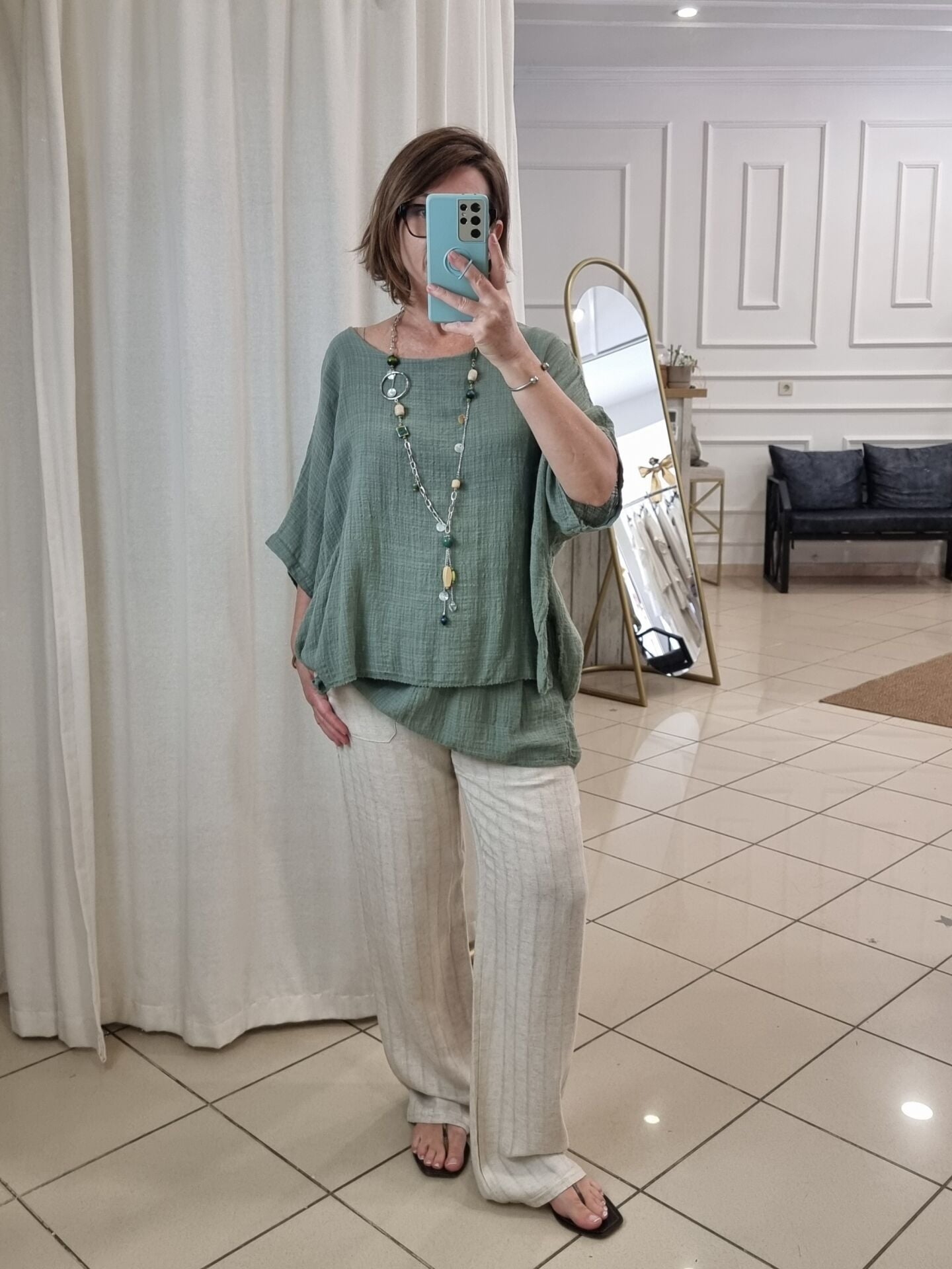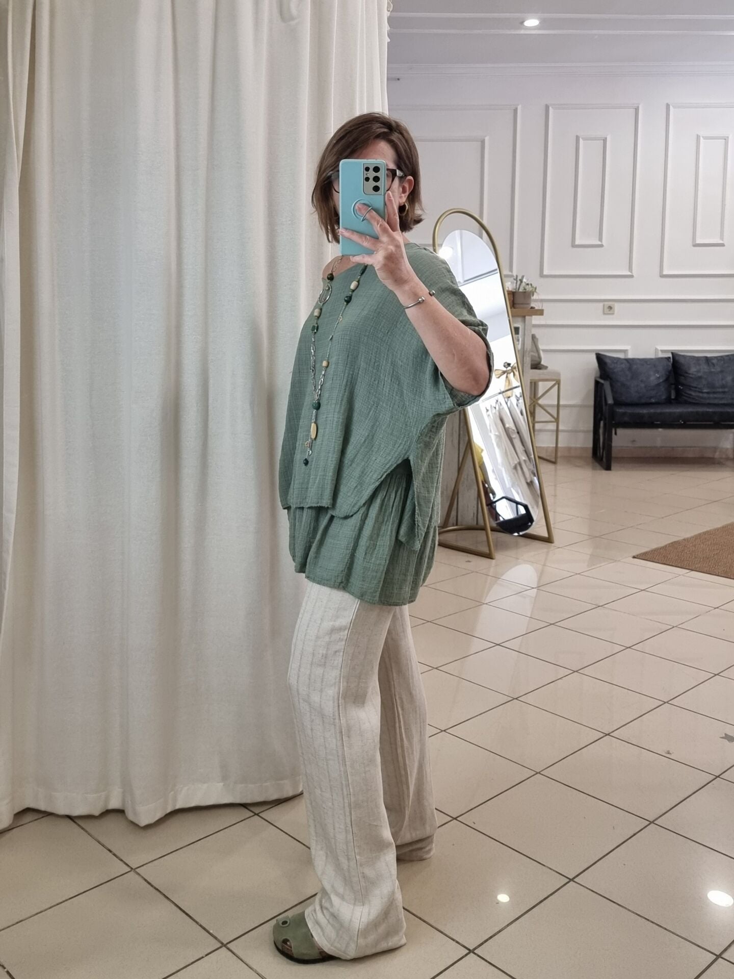 Doğal duruşu ve zamansız şıklığıyla öne çıkan bu beli lastikli keten pantolon bej tonu ile hem klasik hem modern kombinlere uyum sağlar. Kendinden boyuna şeritli dokusu, dikey bir etki yaratarak bacak boyunu uzun gösterir. Yumuşak yapısı ve lastikli beli sayesinde gün boyu rahatlık sunarken; yan ve arka cepleriyle kullanım kolaylığı sağlar. Şıklığından ödün vermek istemeyen, aynı zamanda konforu arayan kadınlar için mükemmel bir yazlık ve mevsimlik alternatif.
