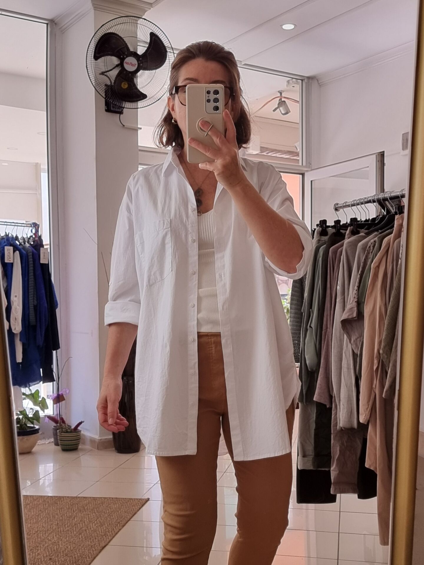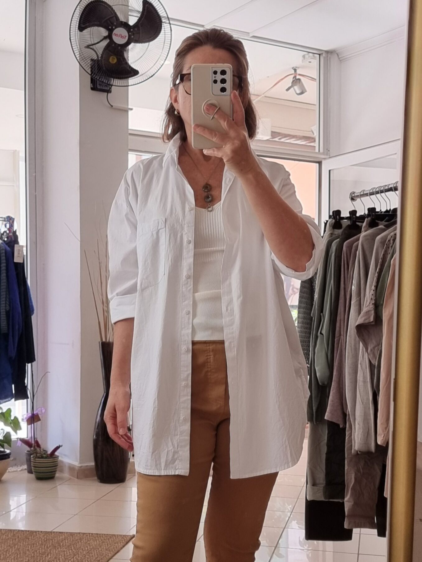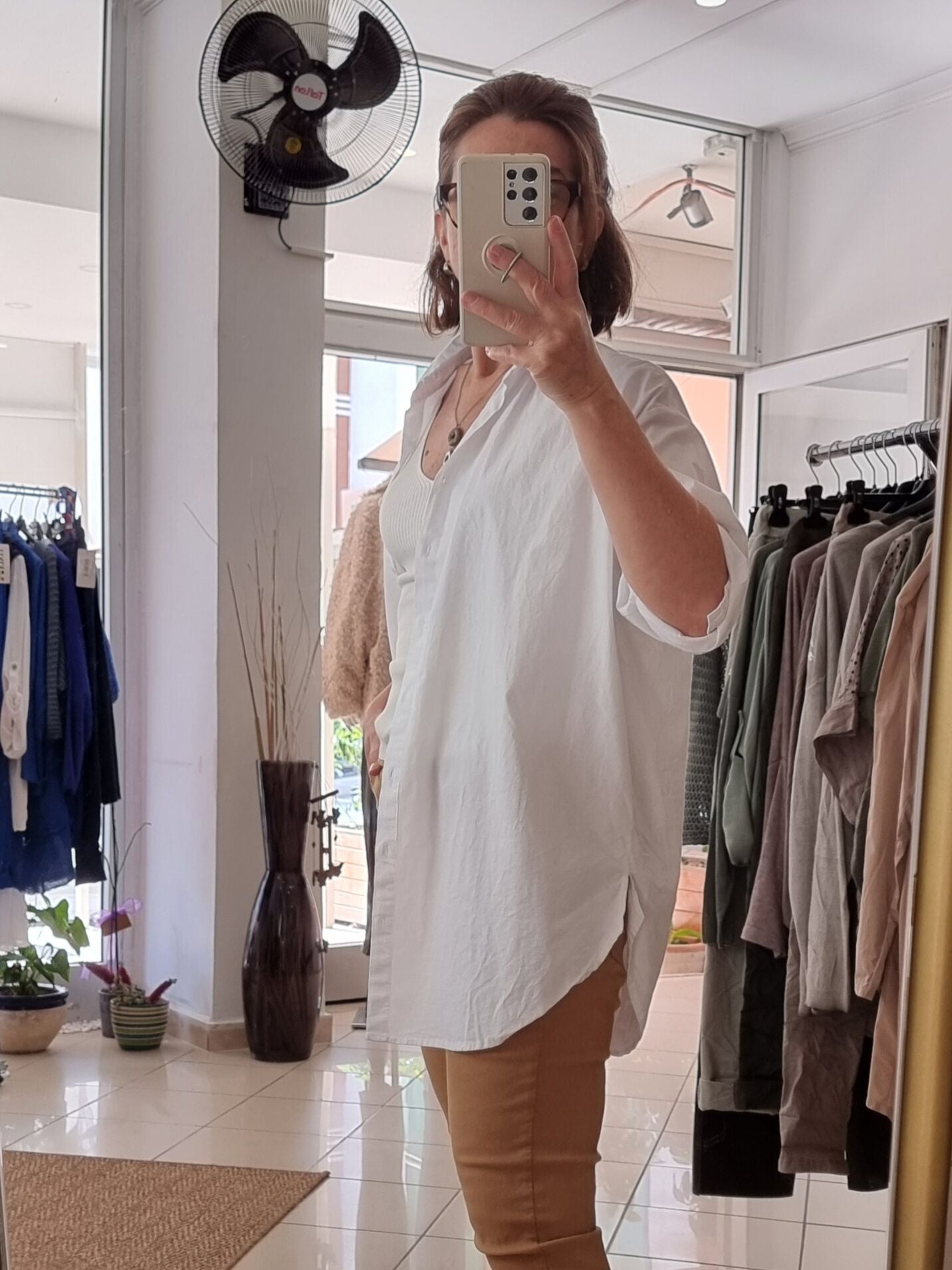 Şıklığın temsilcisi olan beyaz uzun gömlek tunik, bol kesimi ve esnek dokusuyla her bedene konforlu bir kullanım sunar. Oval kesimli etek ucu ve yırtmaç detayları sayesinde hareket özgürlüğü sağlarken, göğüs üstü cep detayıyla sadeliğe işlevsel bir dokunuş katıyor.