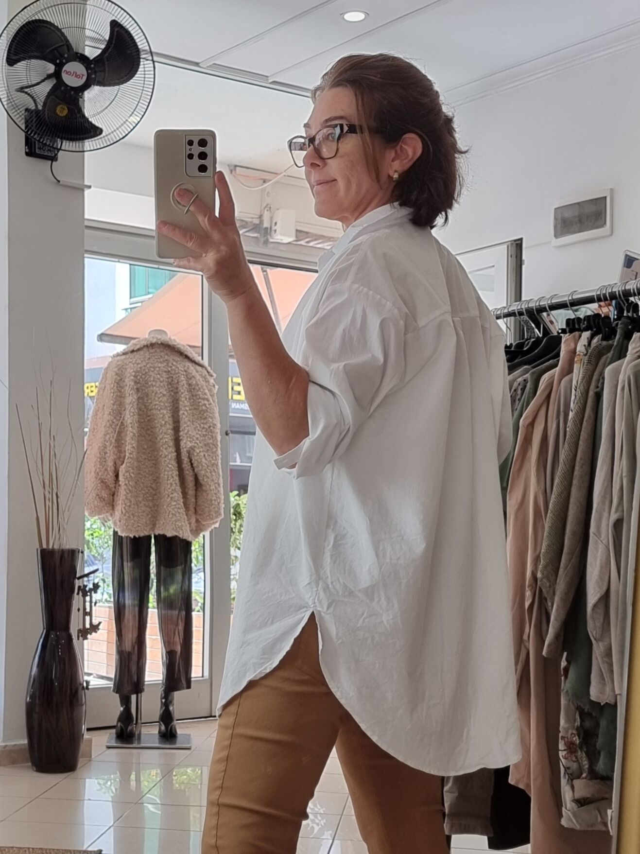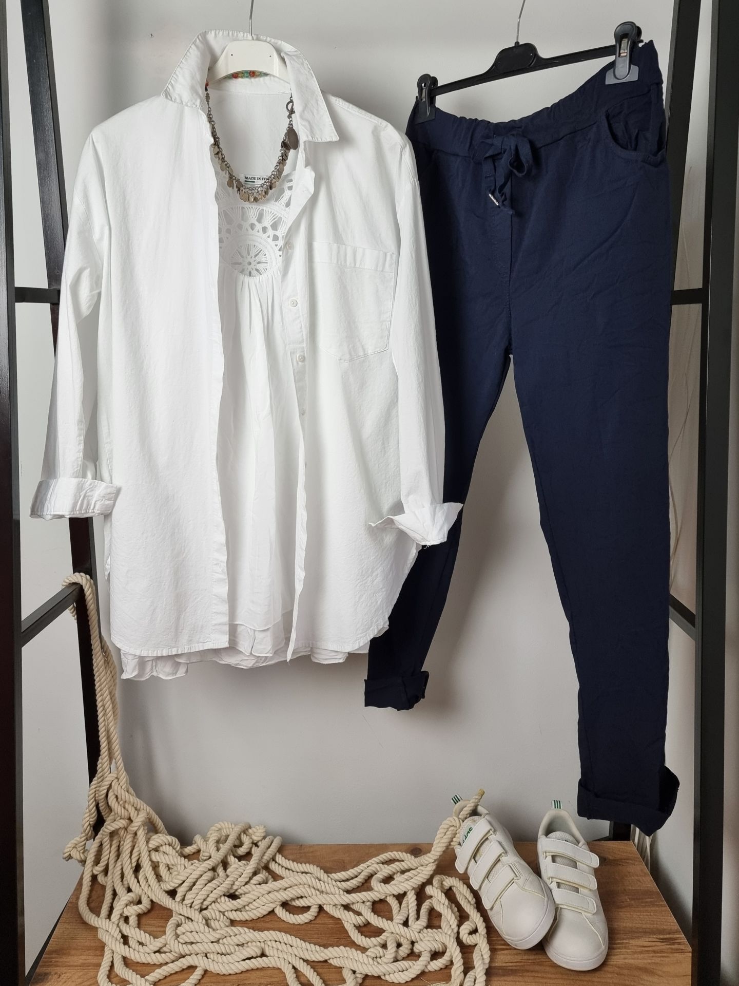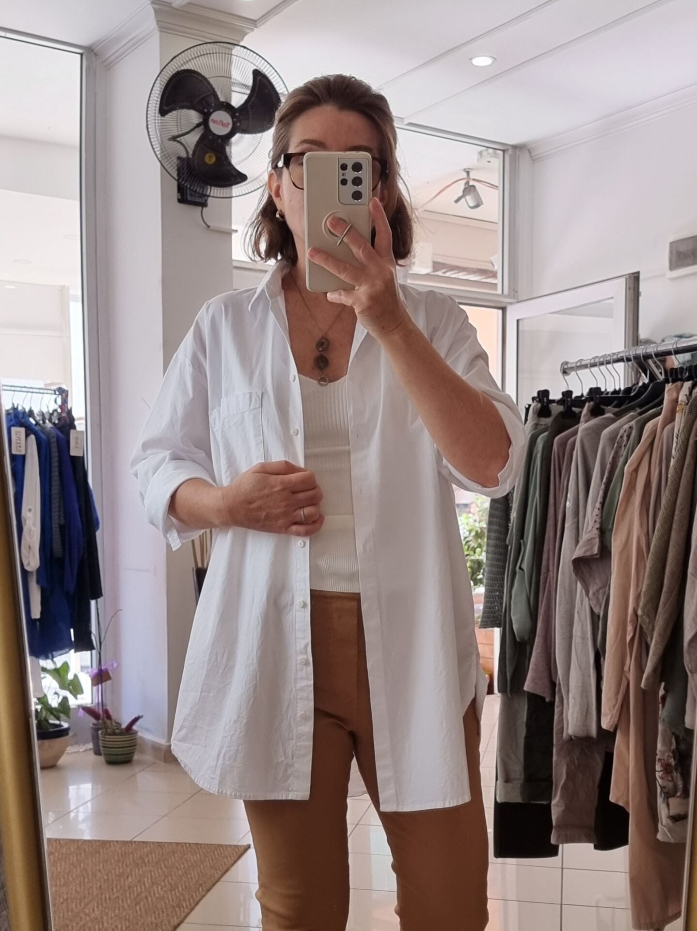 Şıklığın temsilcisi olan beyaz uzun gömlek tunik, bol kesimi ve esnek dokusuyla her bedene konforlu bir kullanım sunar. Oval kesimli etek ucu ve yırtmaç detayları sayesinde hareket özgürlüğü sağlarken, göğüs üstü cep detayıyla sadeliğe işlevsel bir dokunuş katıyor.