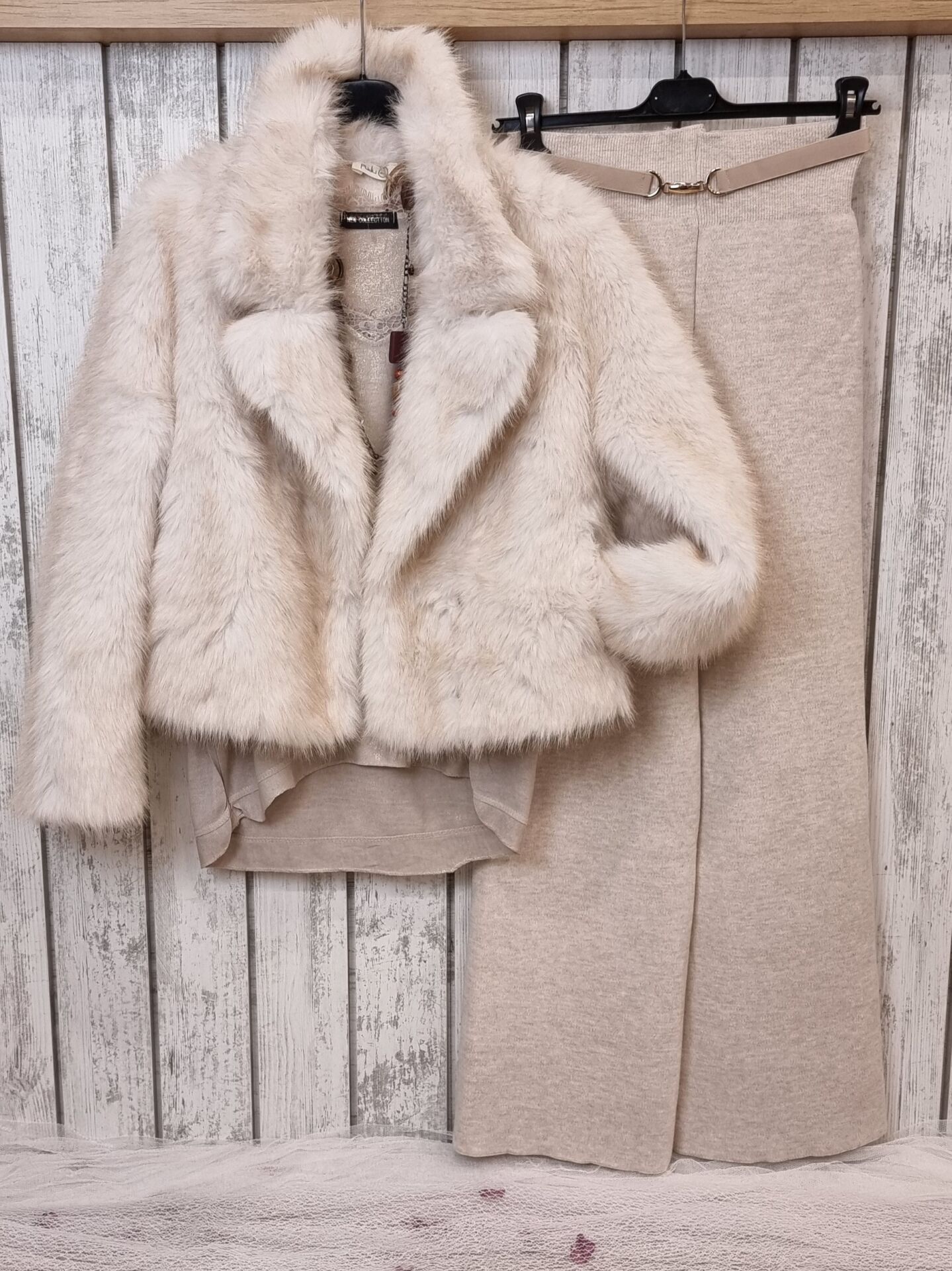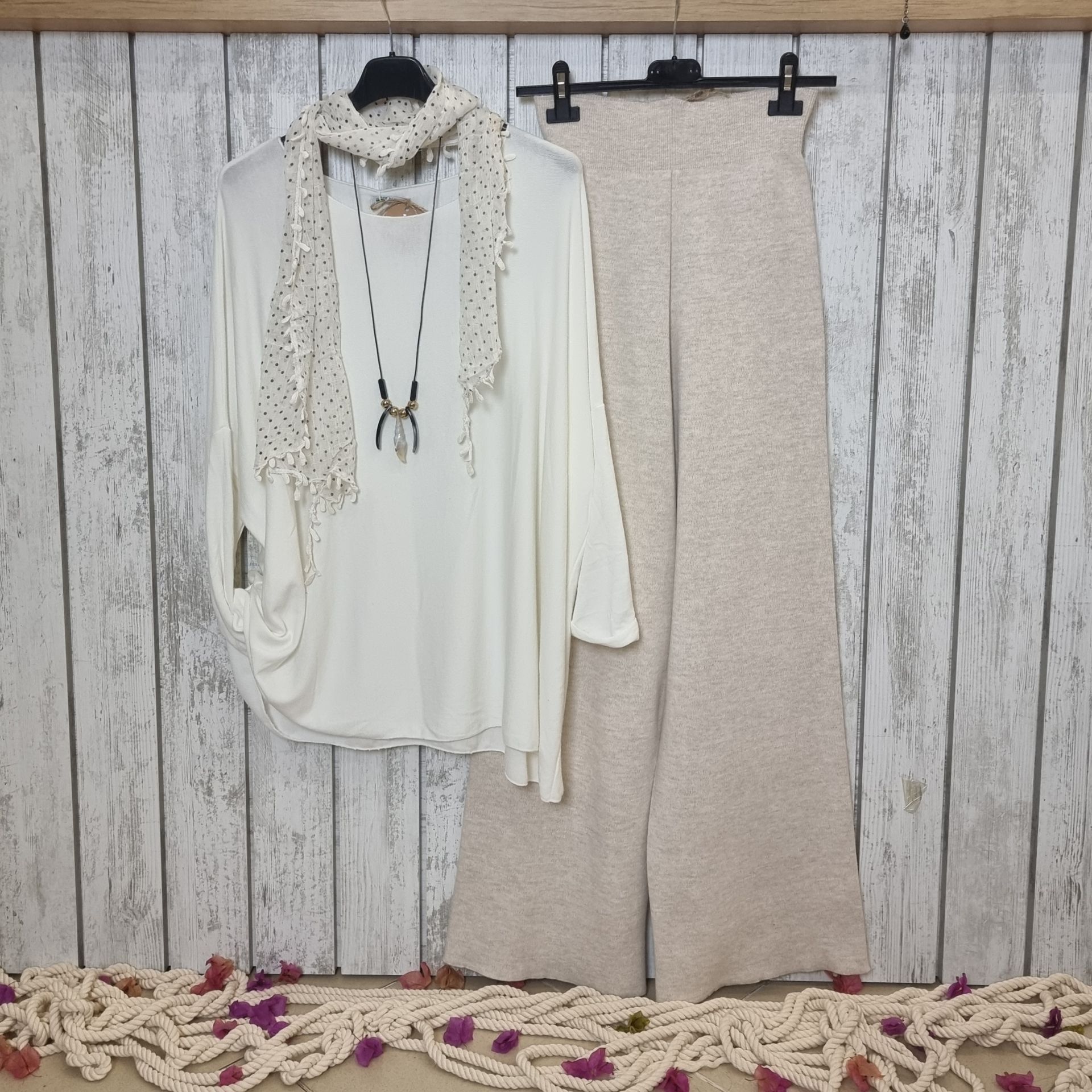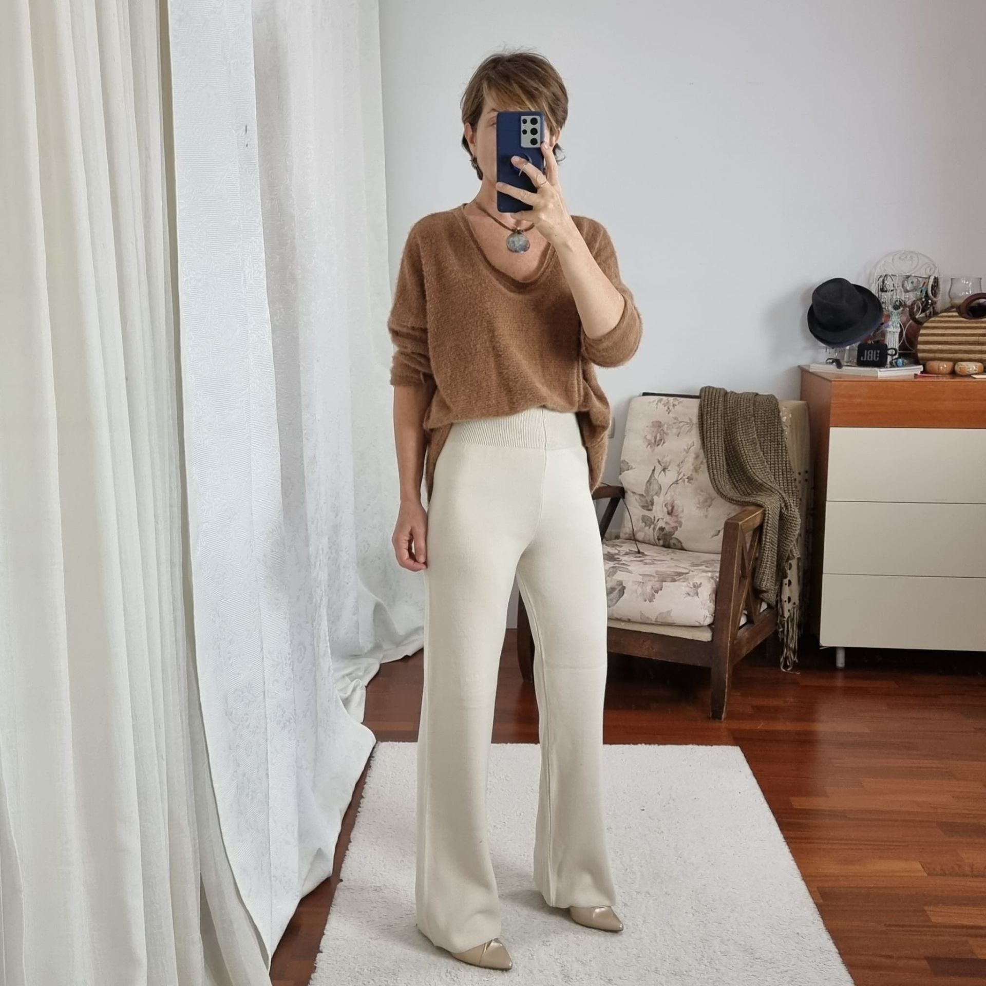 Yüksek bel, beli kavrayan geniş lastikli ve esneyen dokusuyla 46 bedene kadar uyumlu bol paça triko pantolon.
