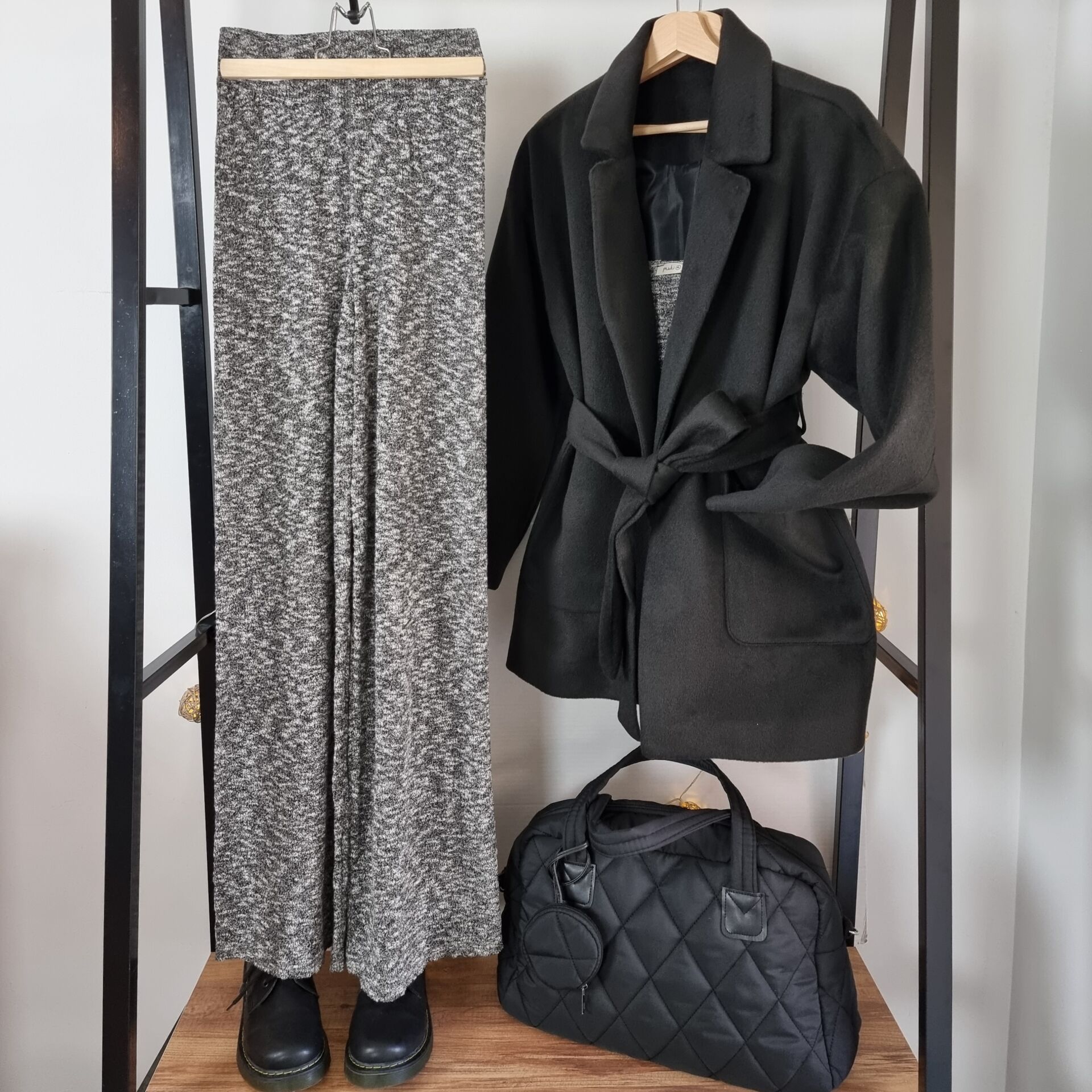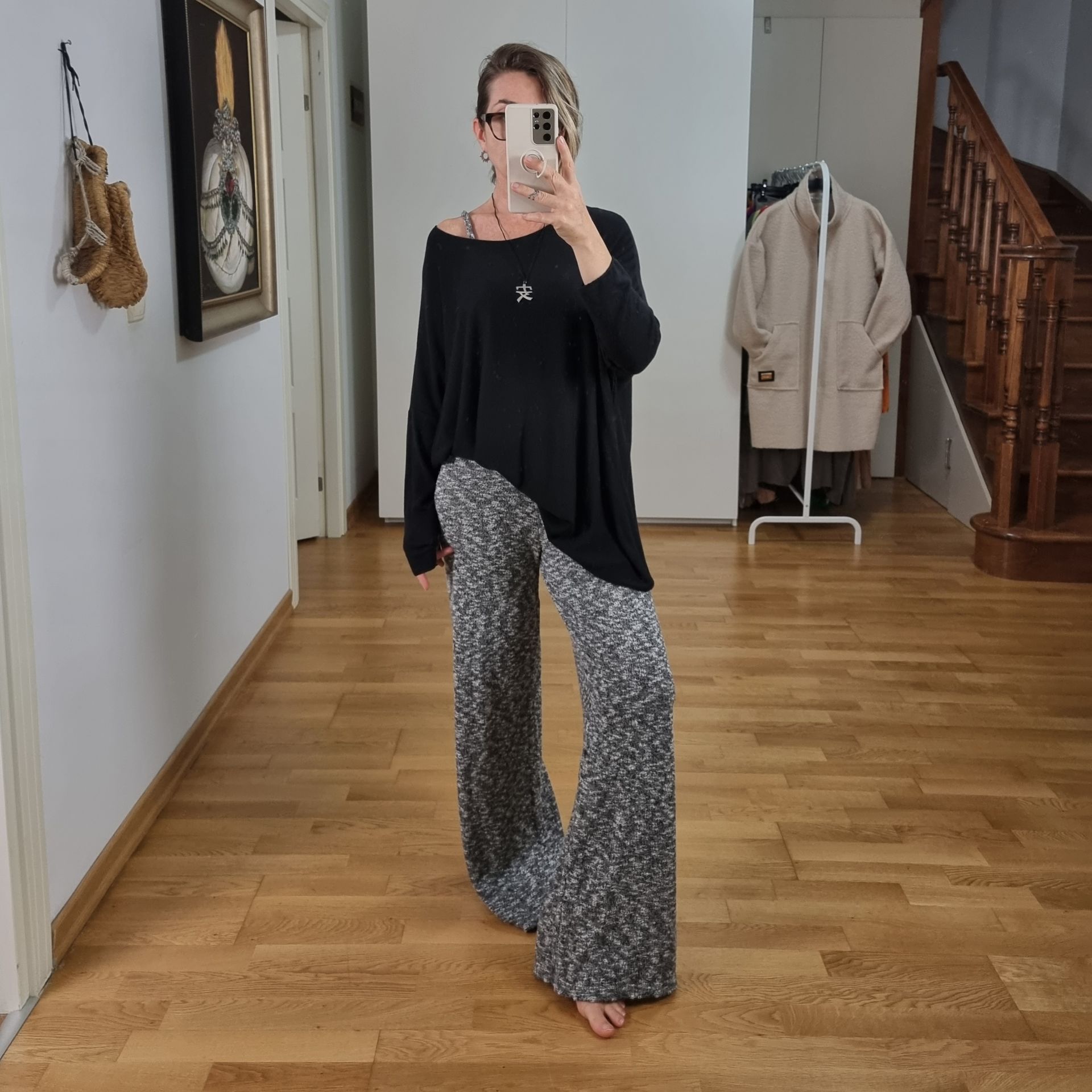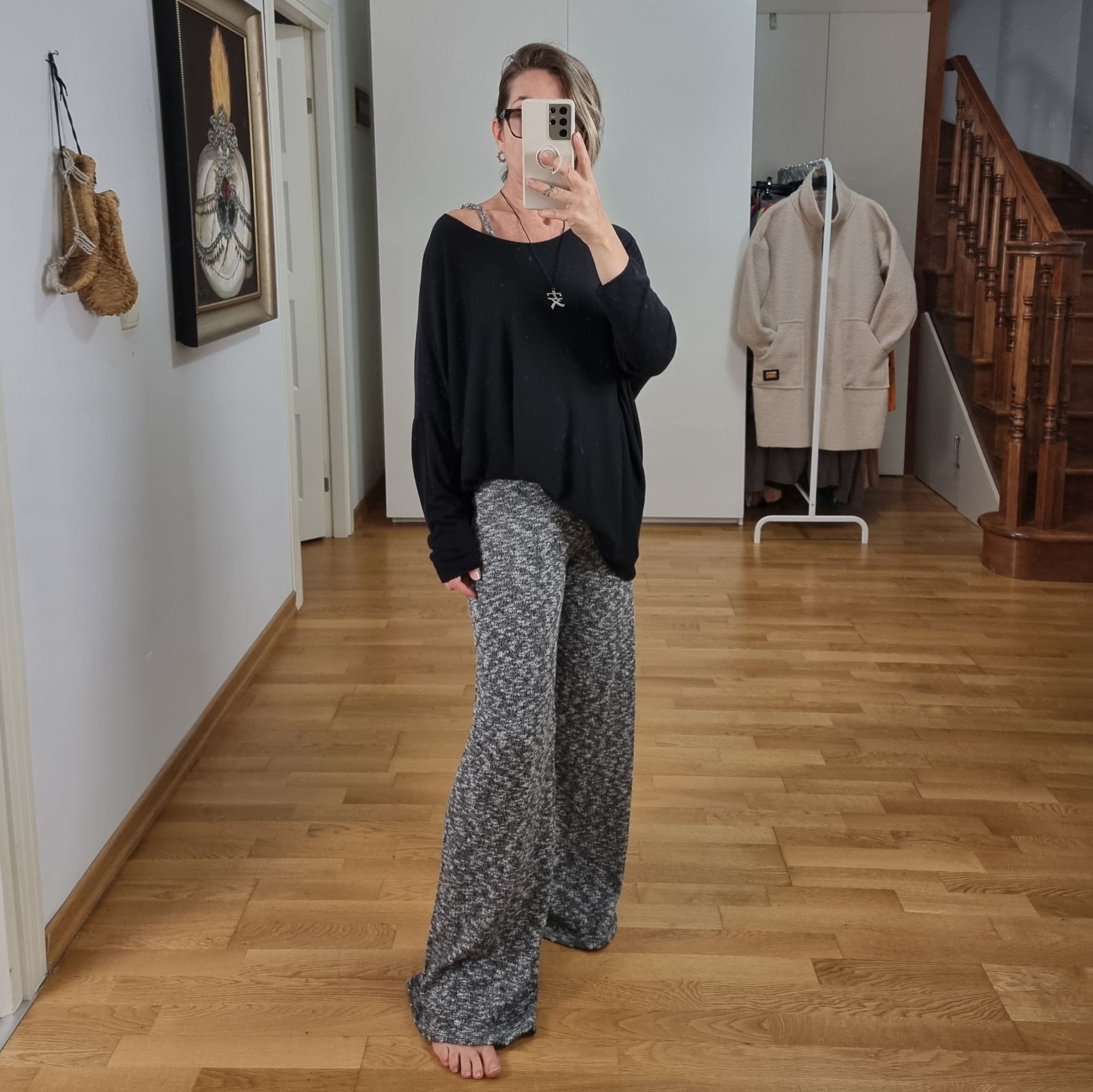 Yüksek bel bol paça triko palazzo pantolon. Beli lastikli. Mevsimlik.