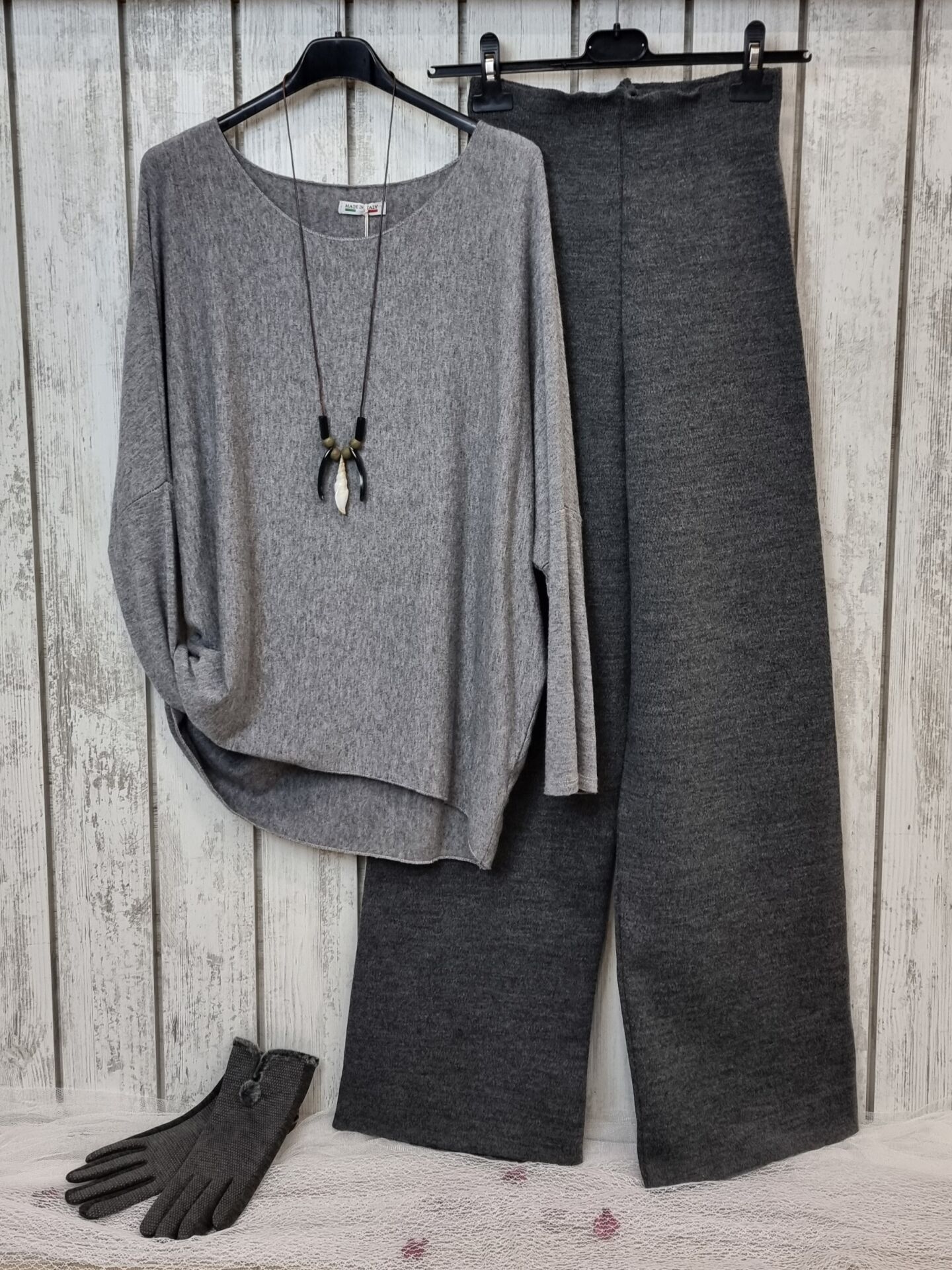 Yüksek bel, beli kavrayan geniş lastikli ve esneyen dokusuyla 46 bedene kadar uyumlu bol paça triko pantolon.