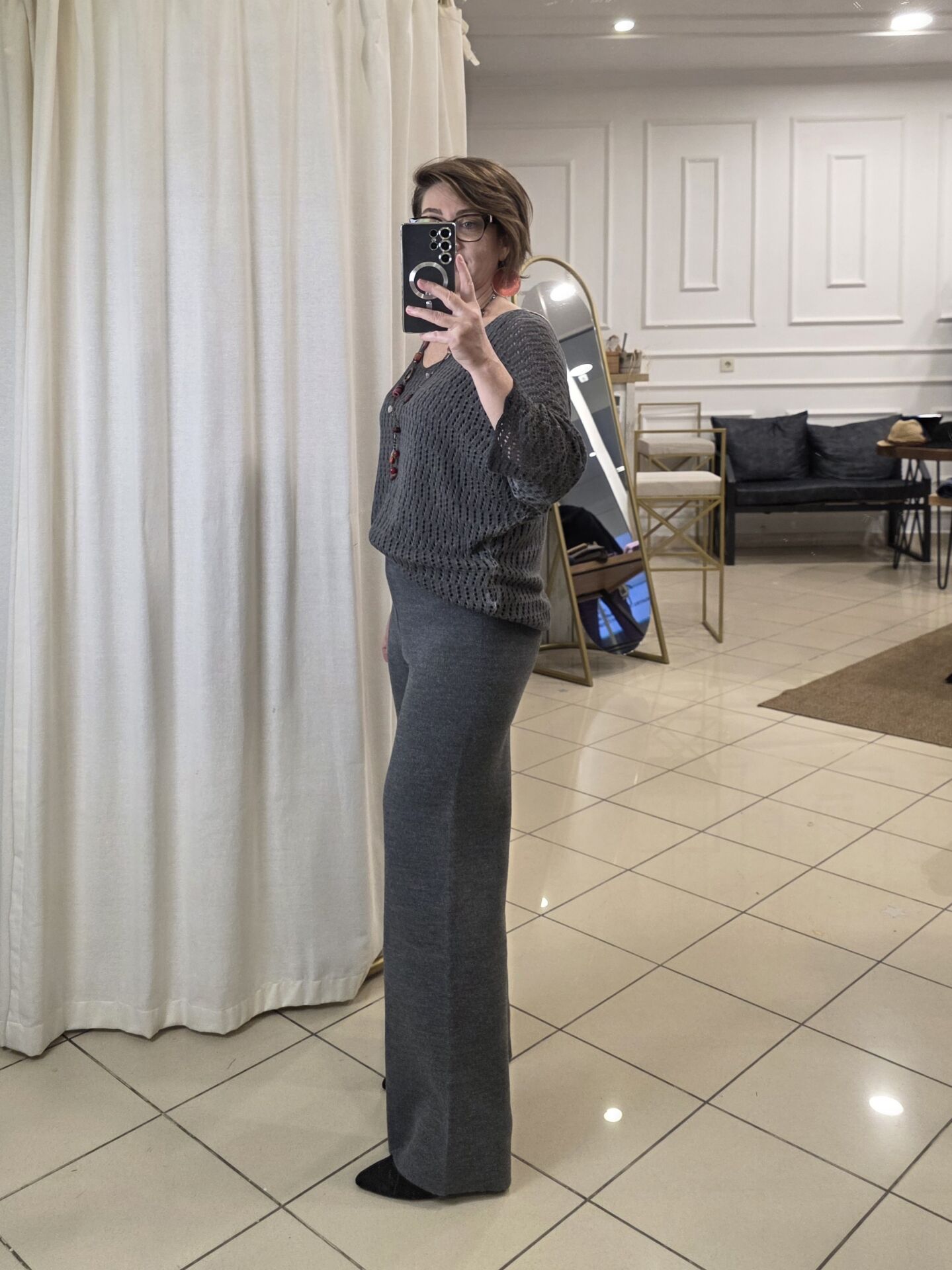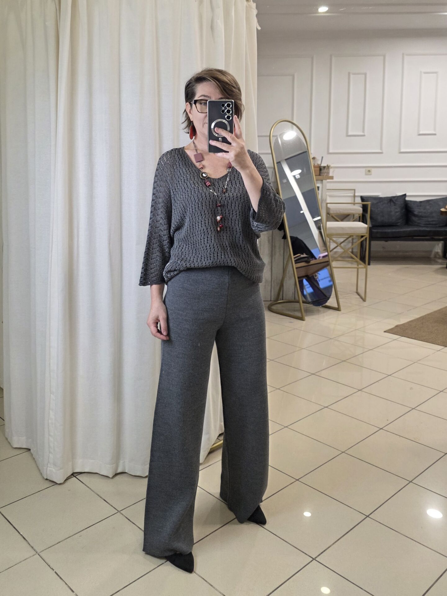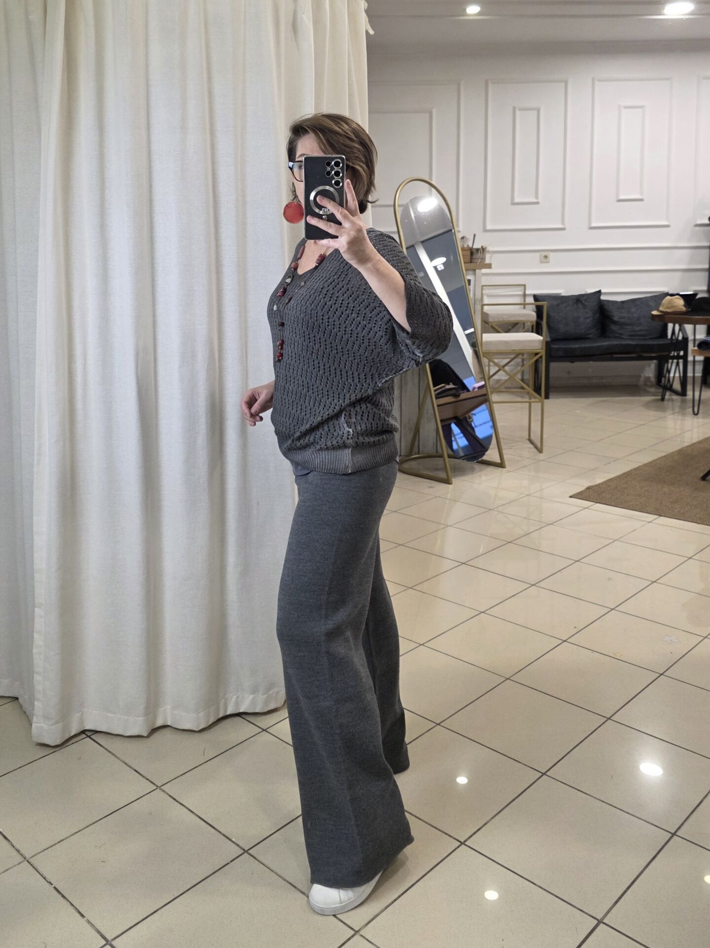 Kadınlar için tasarlanan antrasit bol paça triko pantolon, şıklığı ve rahatlığı bir araya getiriyor. Yüksek bel tasarımı ve beli kavrayan geniş lastikli yapısı sayesinde konforlu bir kullanım sunar. Esnek dokusu, 44/46 bedene kadar uyum sağlar ve vücudu zarif bir şekilde sarar. Kışlık kullanım için ideal olan bu pantolon, palazzo kesimiyle modern ve sofistike bir görünüm yaratır. Hem günlük kombinlerinizde hem de özel davetlerde rahatlıkla tercih edebilirsiniz. %70 akrilik ve %30 yün karışımından oluşan dokusuyla soğuk havalarda sıcak tutarken, tarzınıza ince bir dokunuş katar. Antrasit rengiyle her dolabın vazgeçilmezi olacak bu triko pantolon, kadınların kış gardırobunda mutlaka bulunmalı.