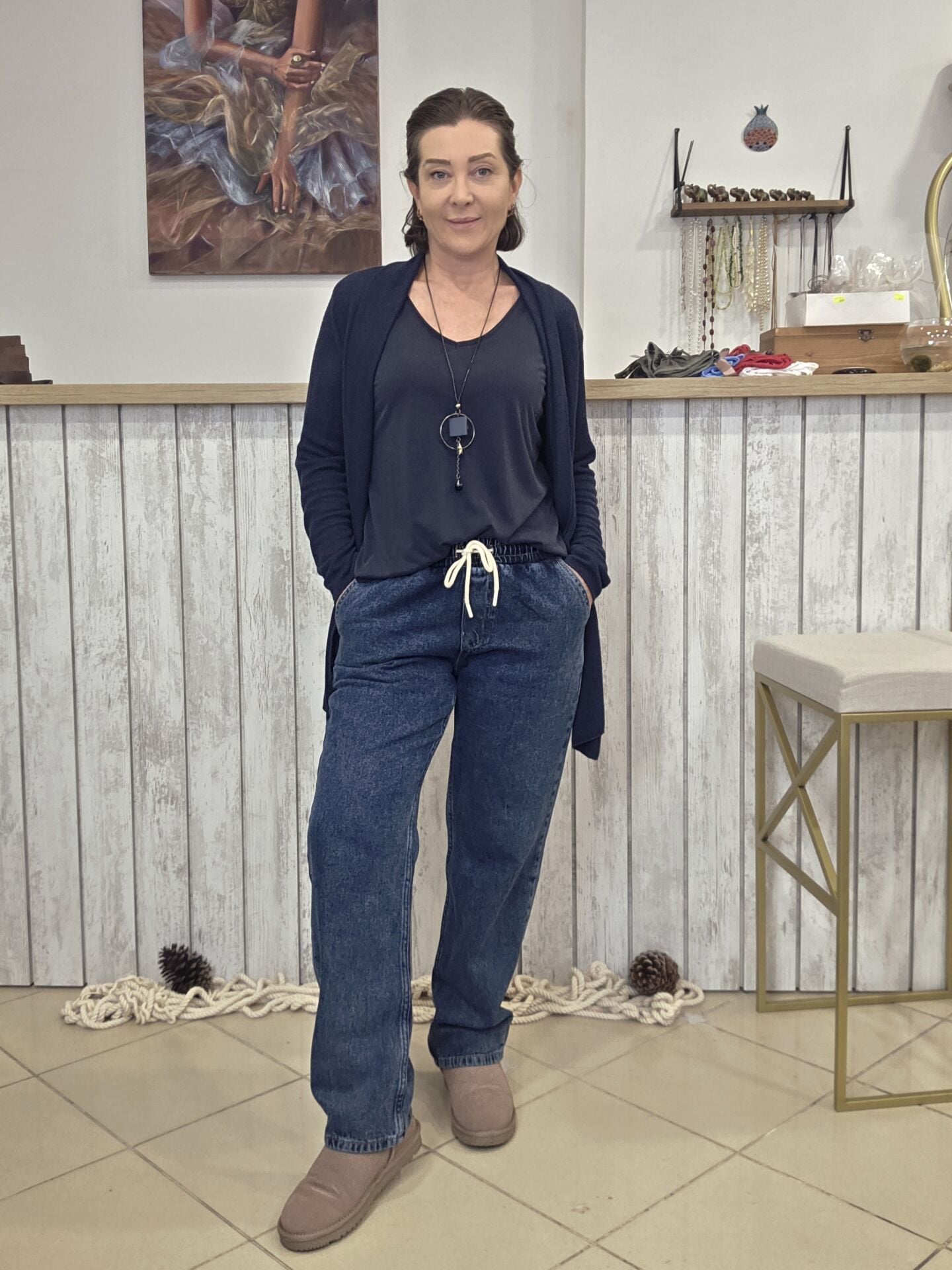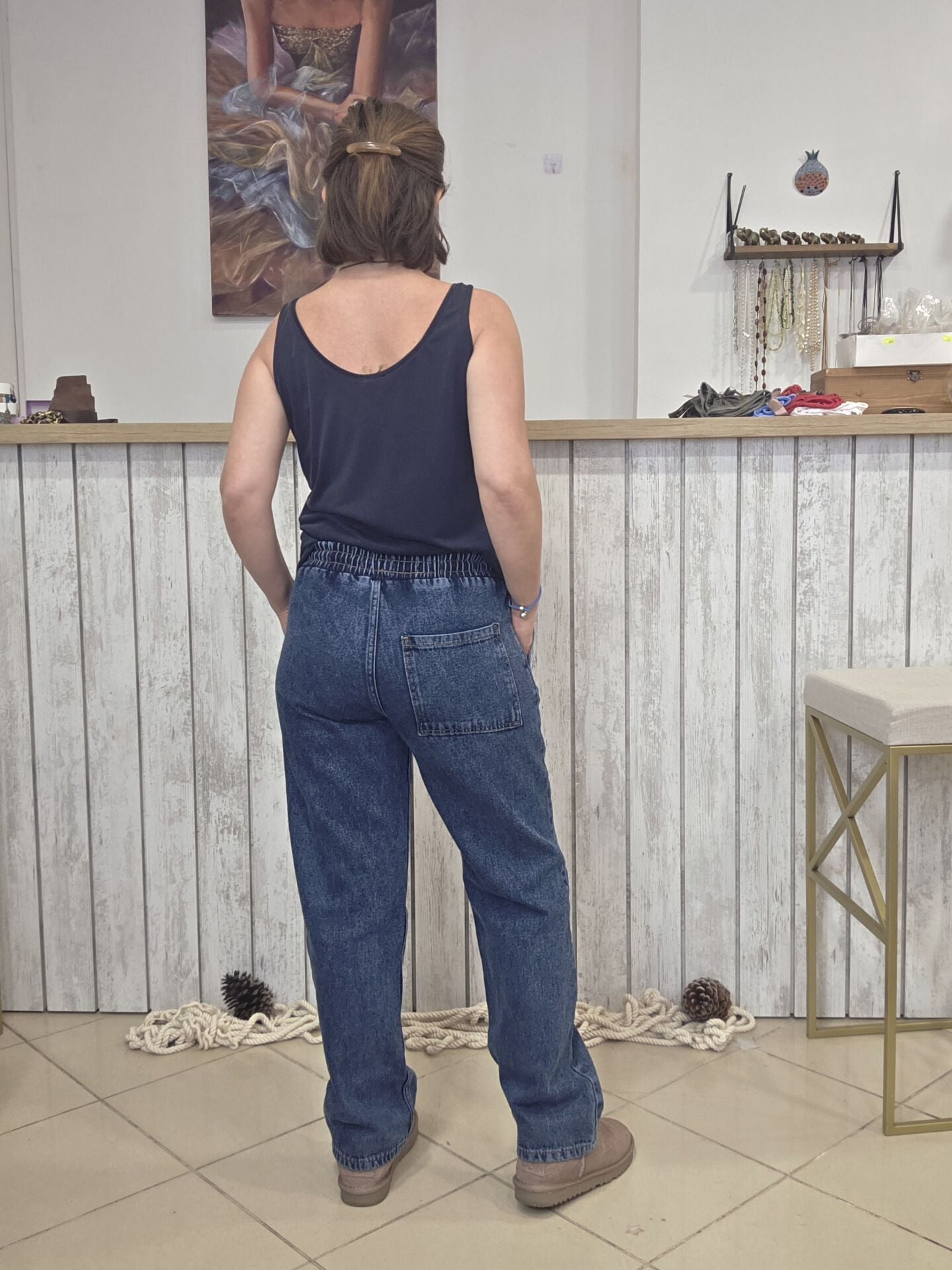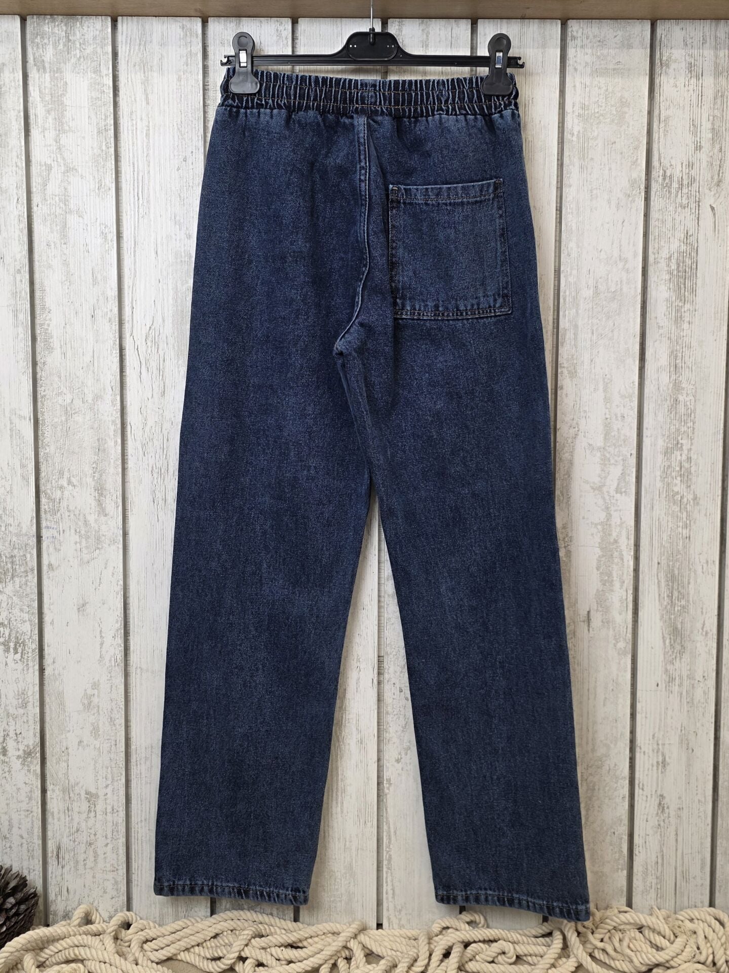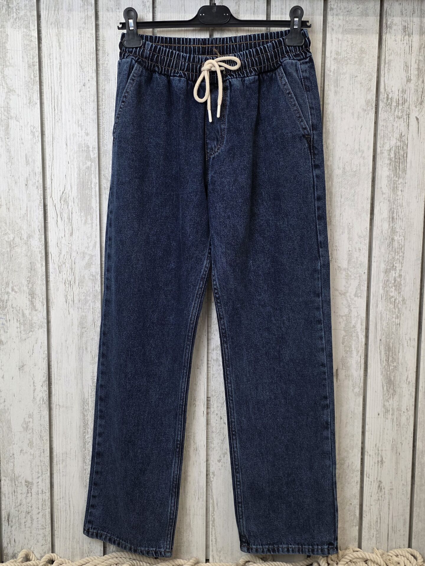 Beli lastikli ve bağcıklı boru paça kot pantolon.