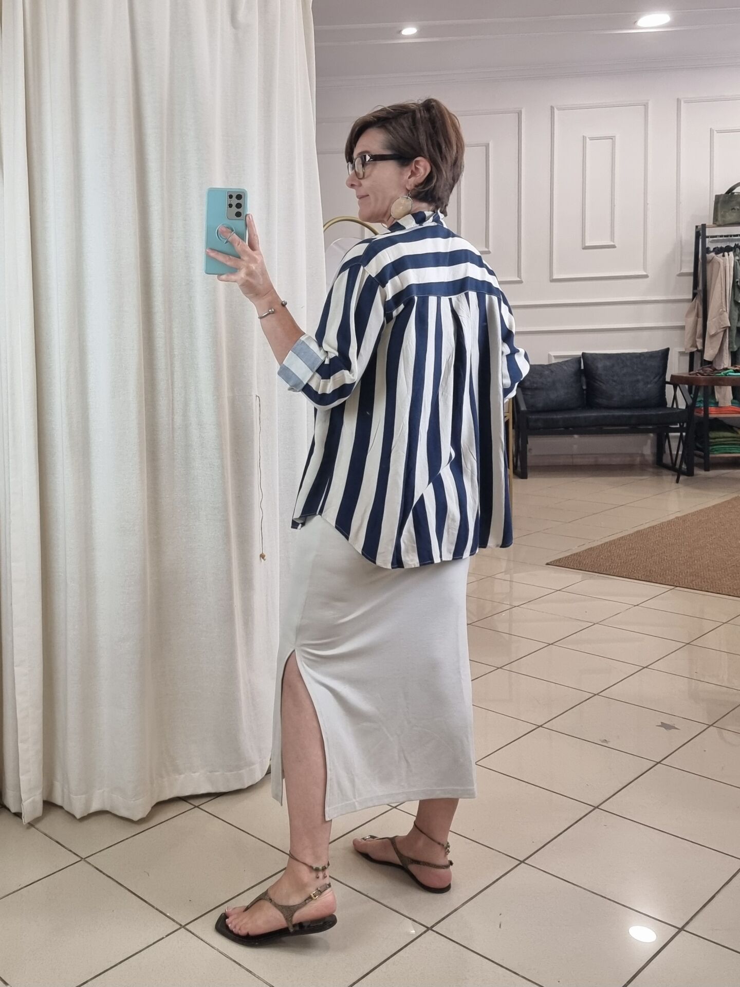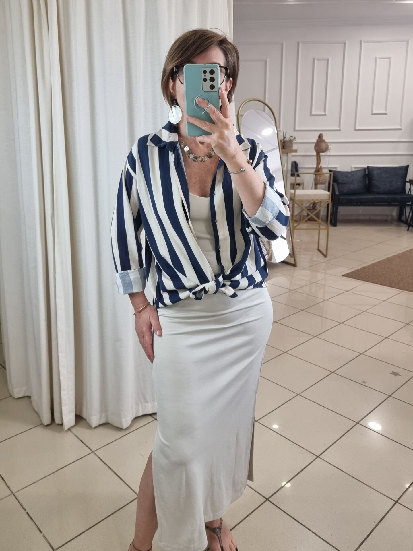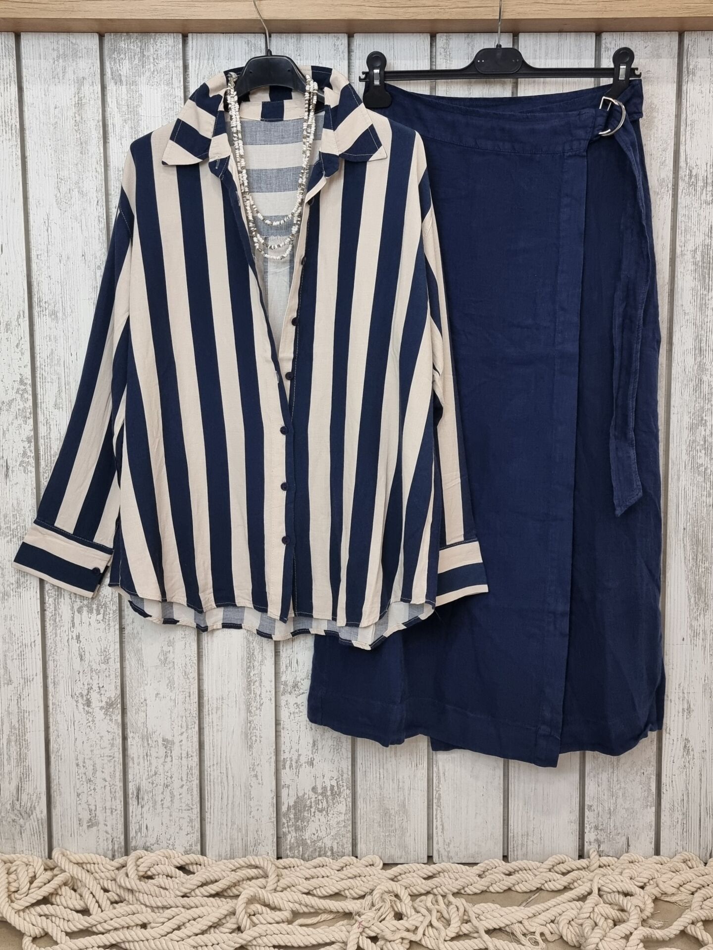 Lacivert bej cizgili keten gömlek.