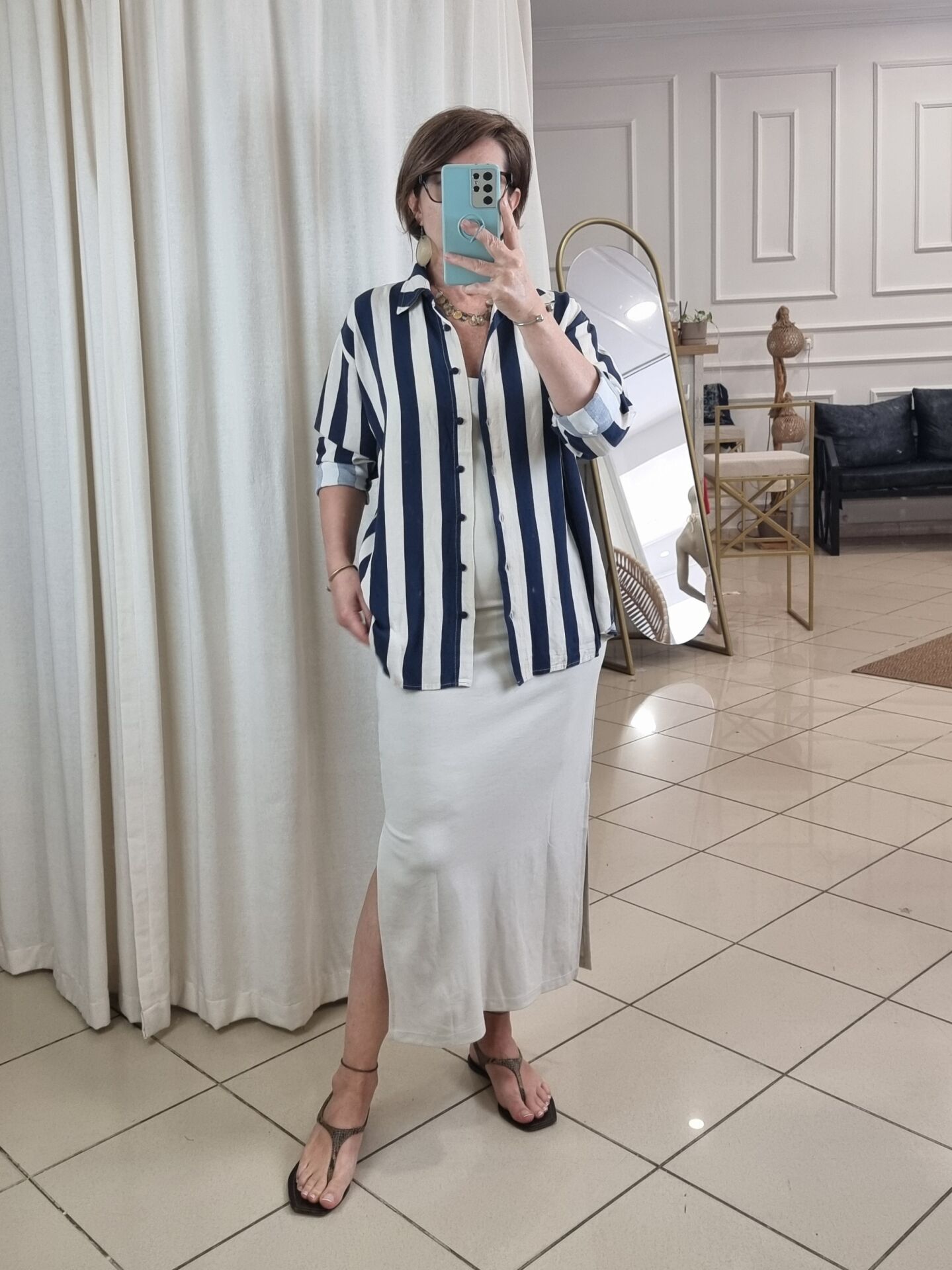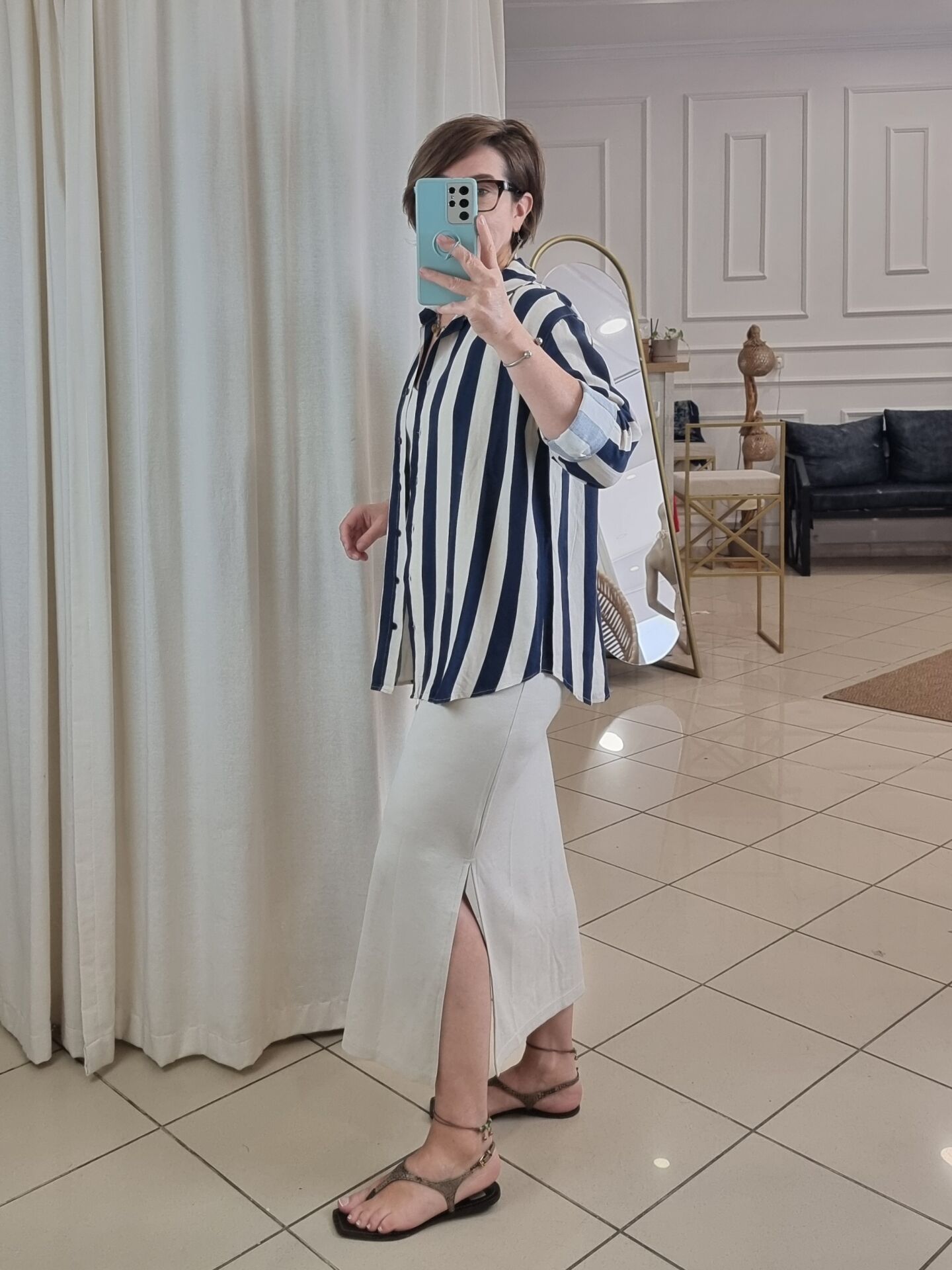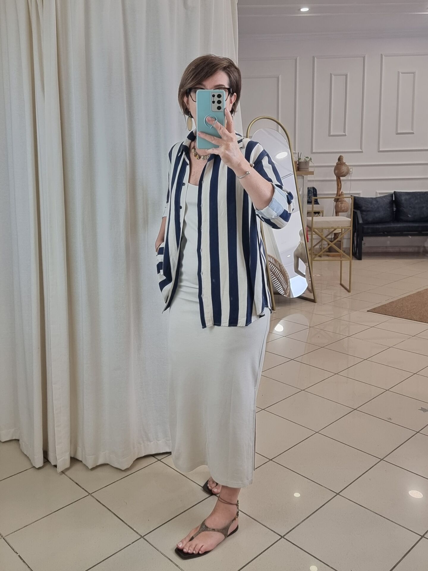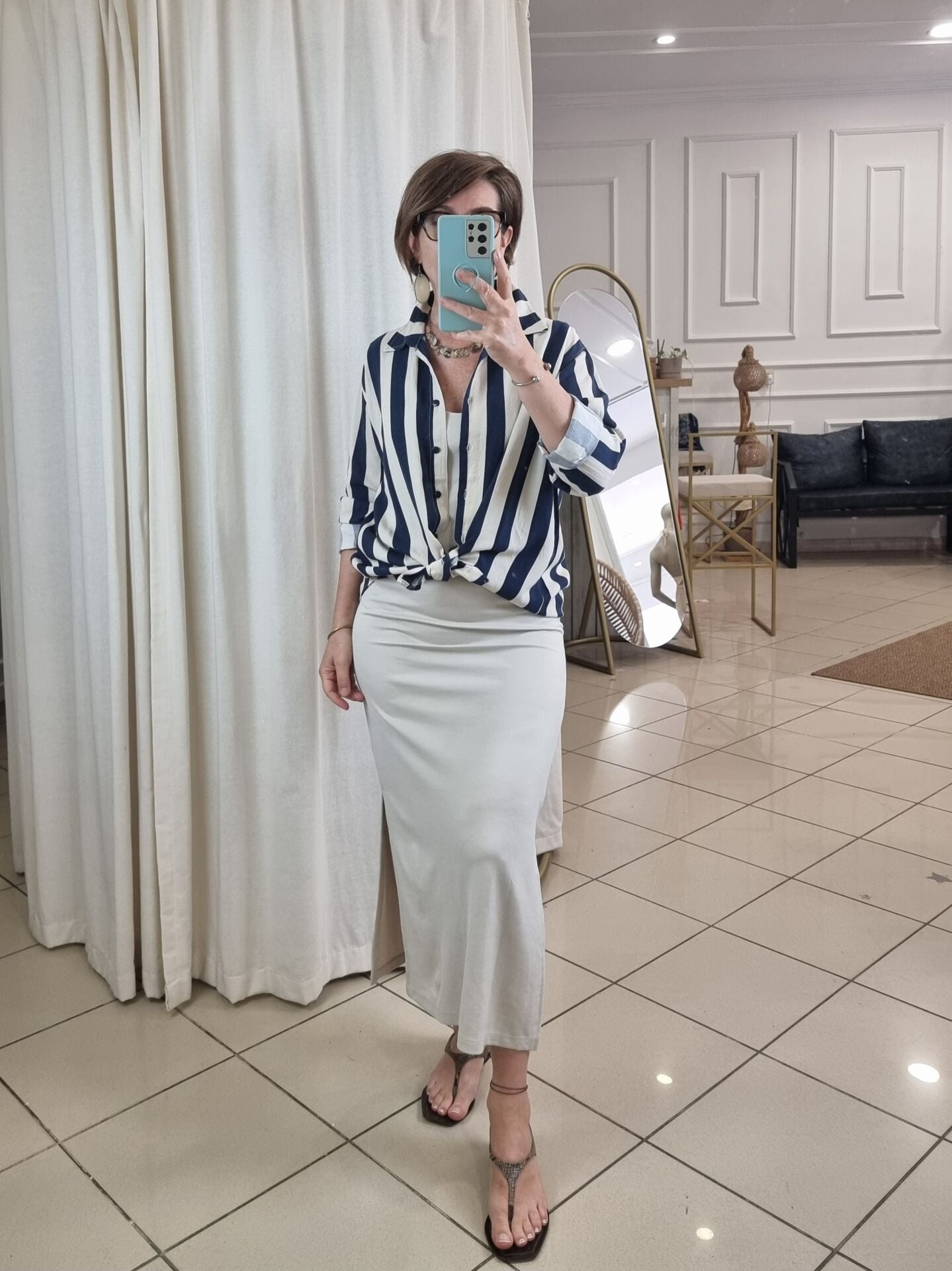 Lacivert bej cizgili keten gömlek.
