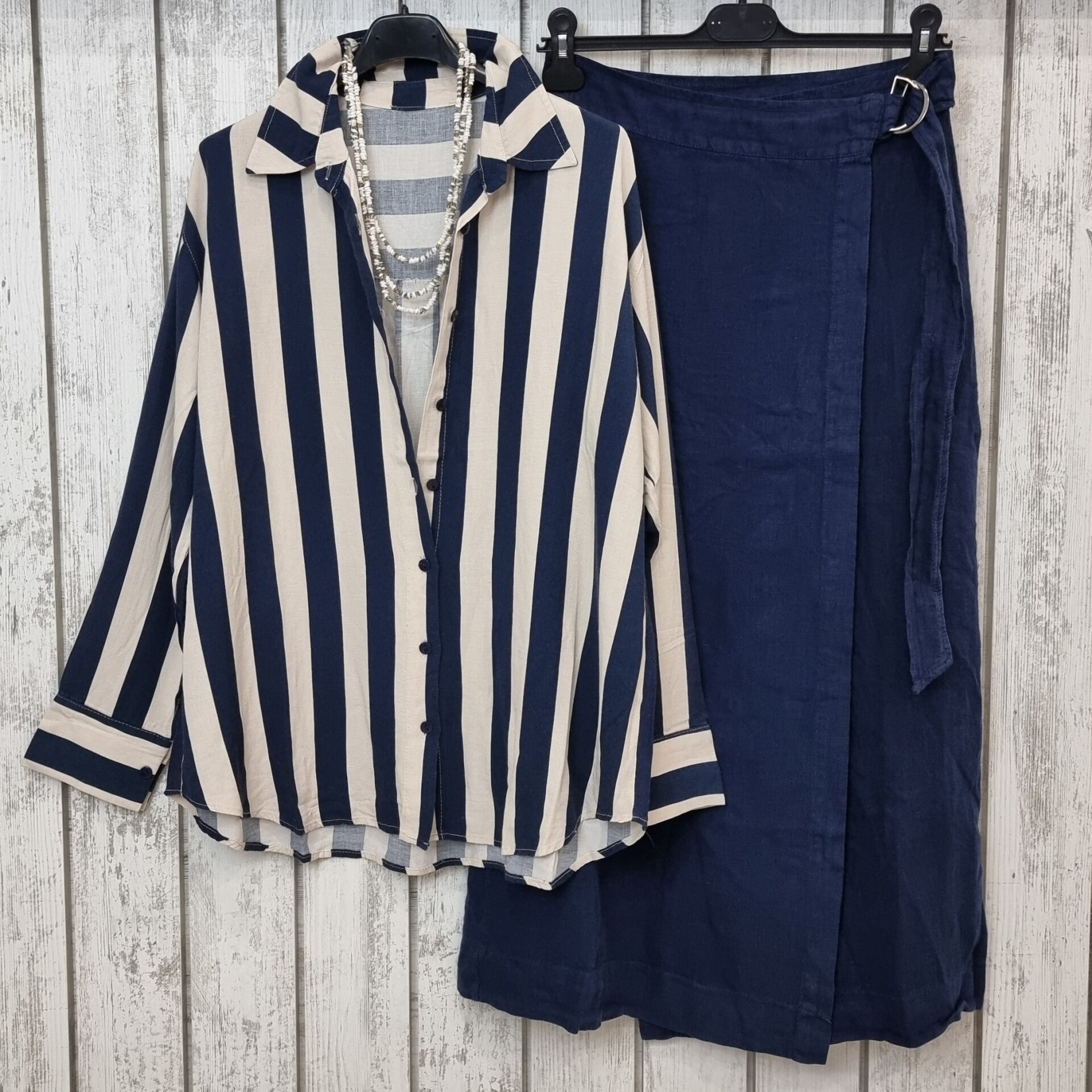 Çizgili Uzun Kollu Keten Gömlek Lacivert