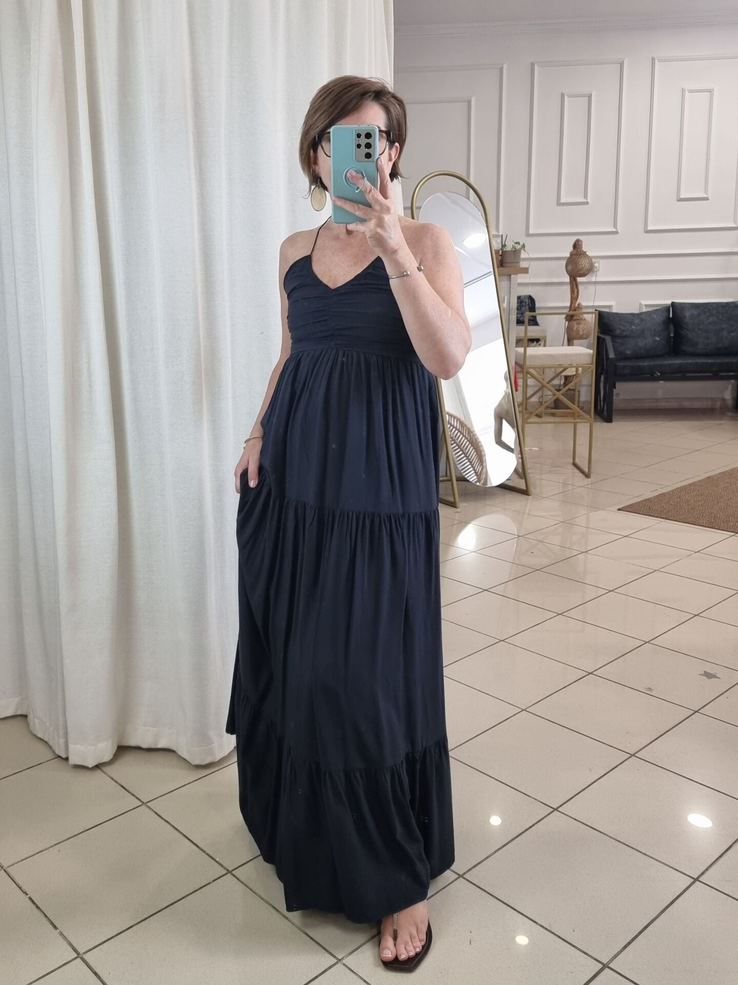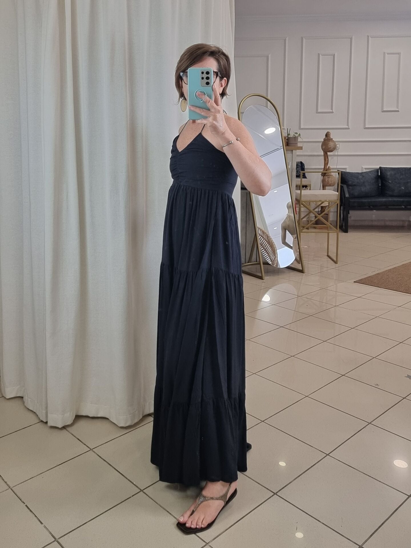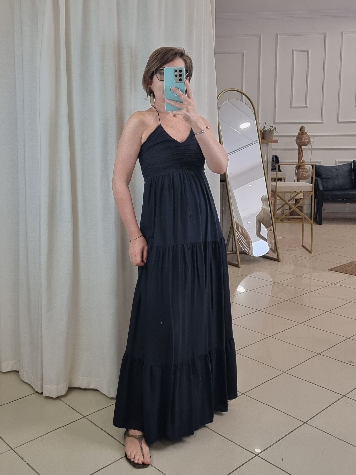 Slim fit göğüs detayı büzgülü, ip askılı uzun elbise.