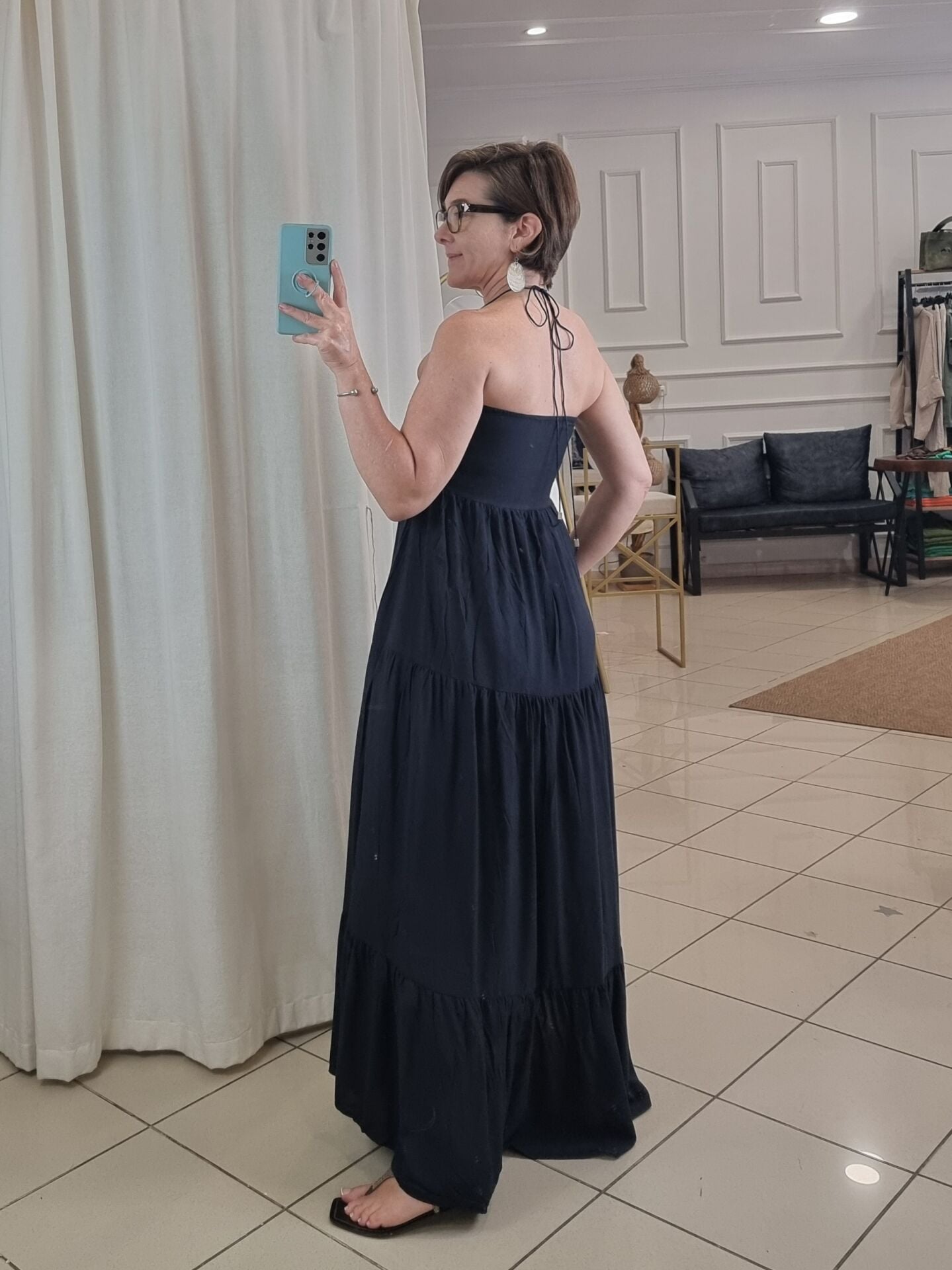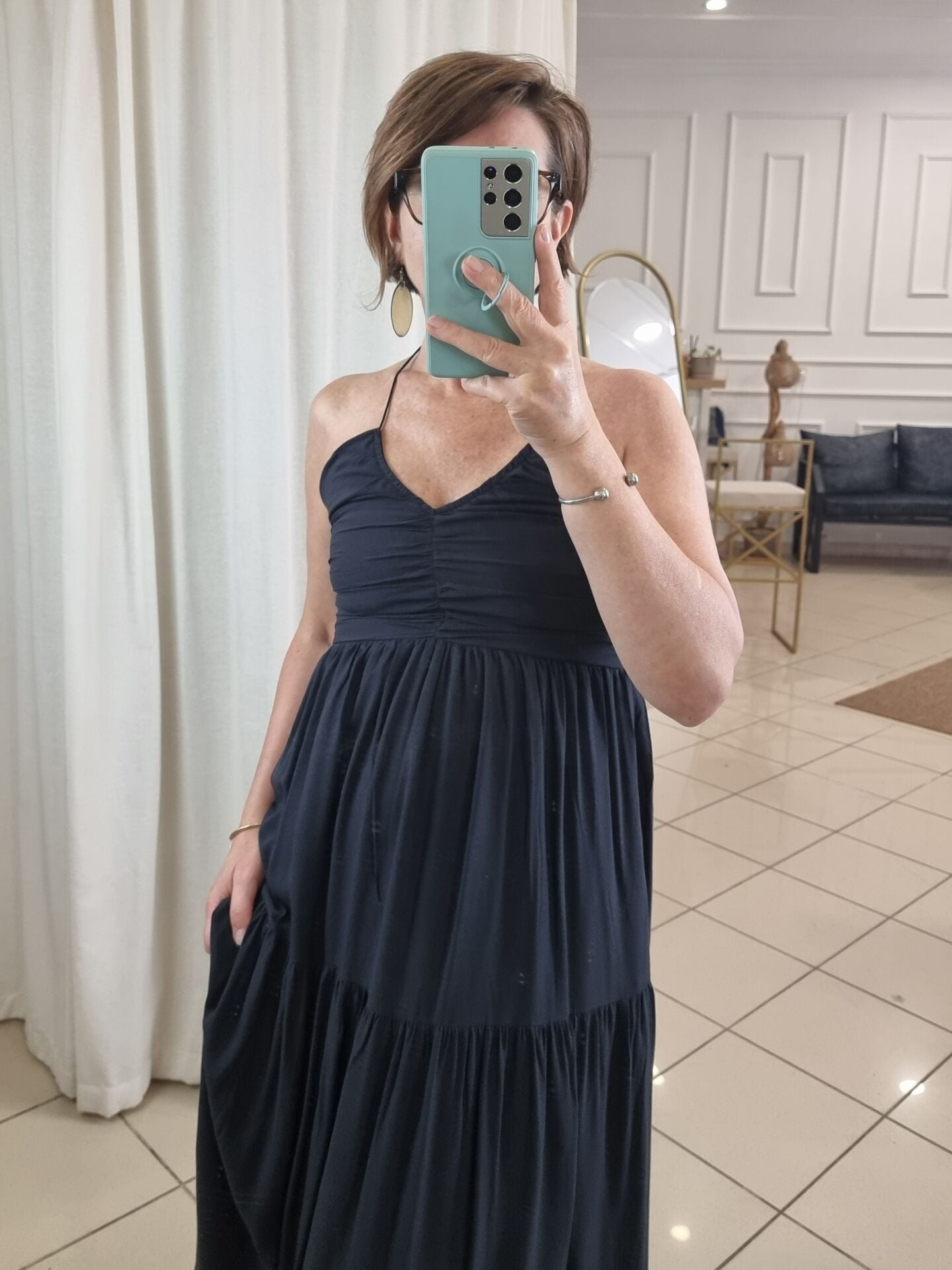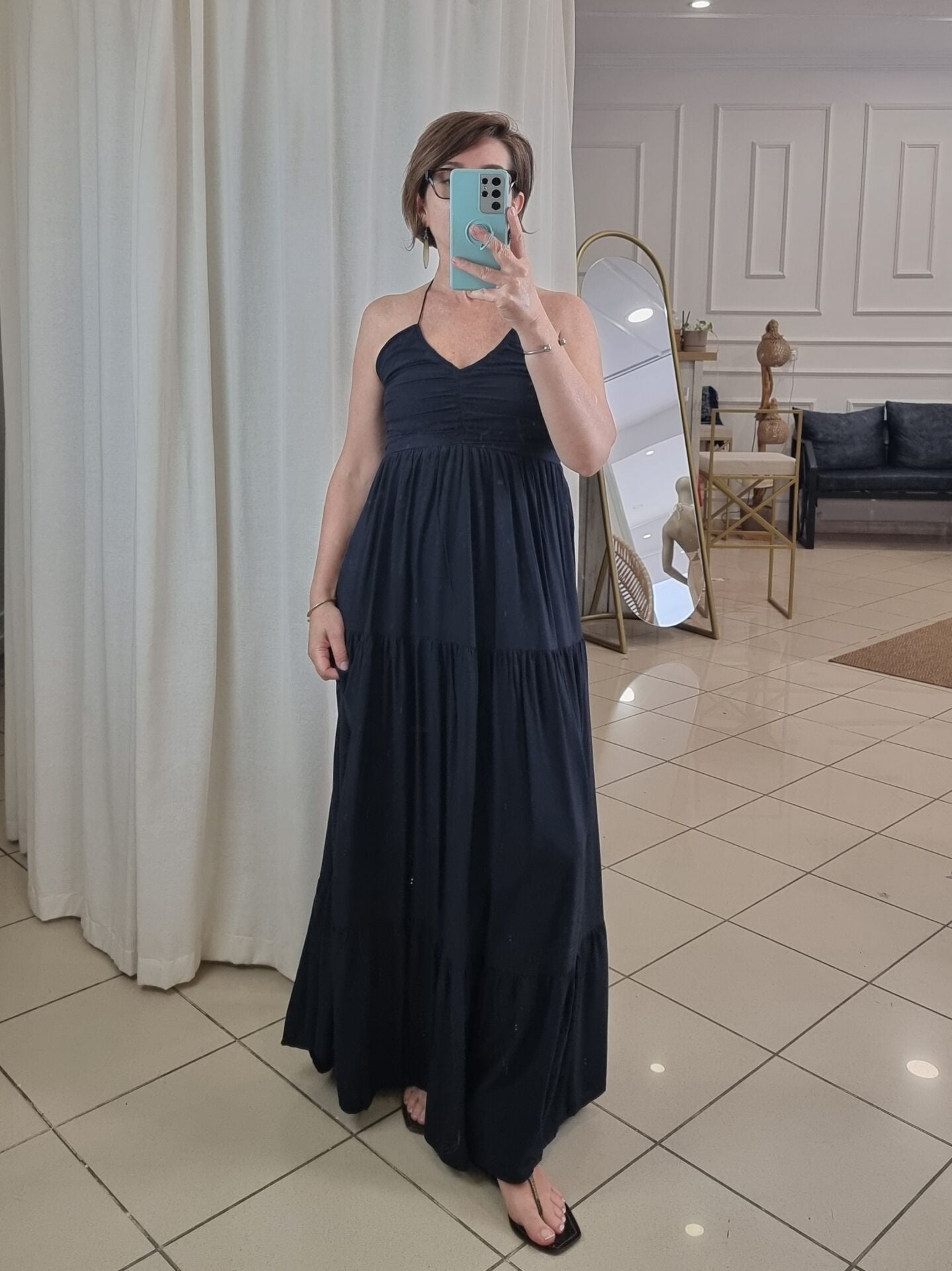 Slim fit göğüs detayı büzgülü, ip askılı uzun elbise.
