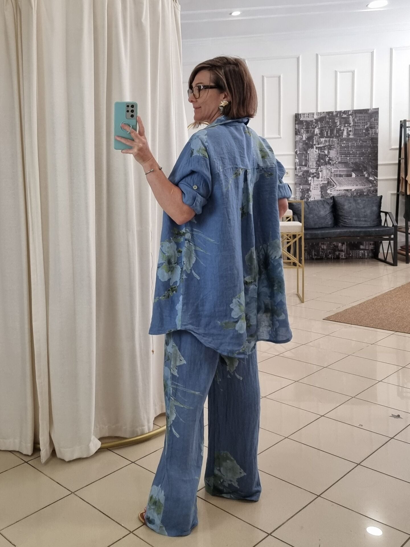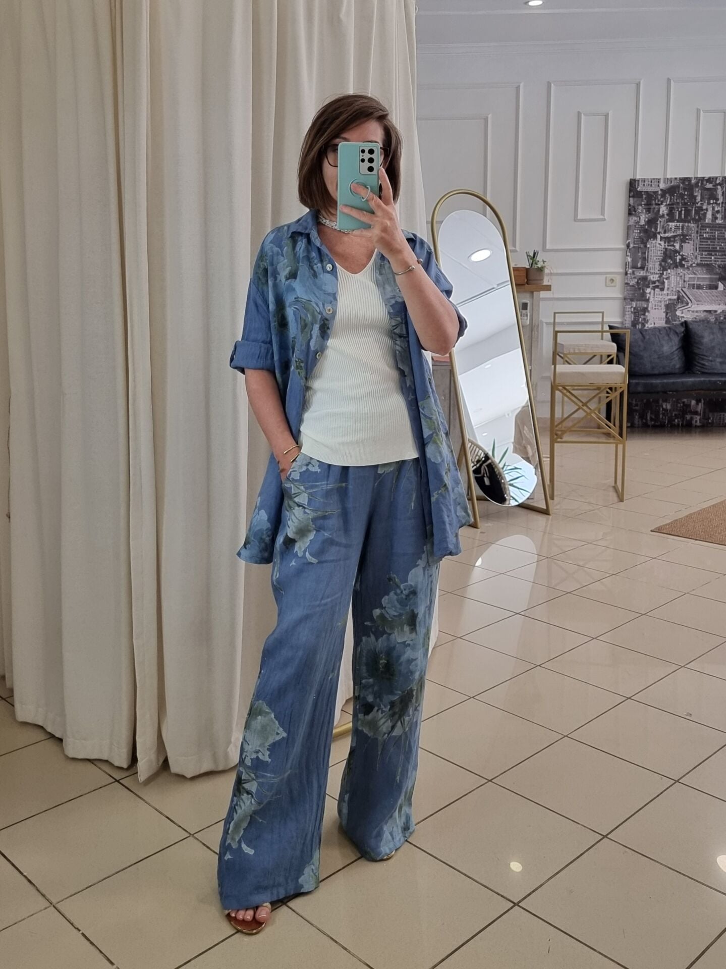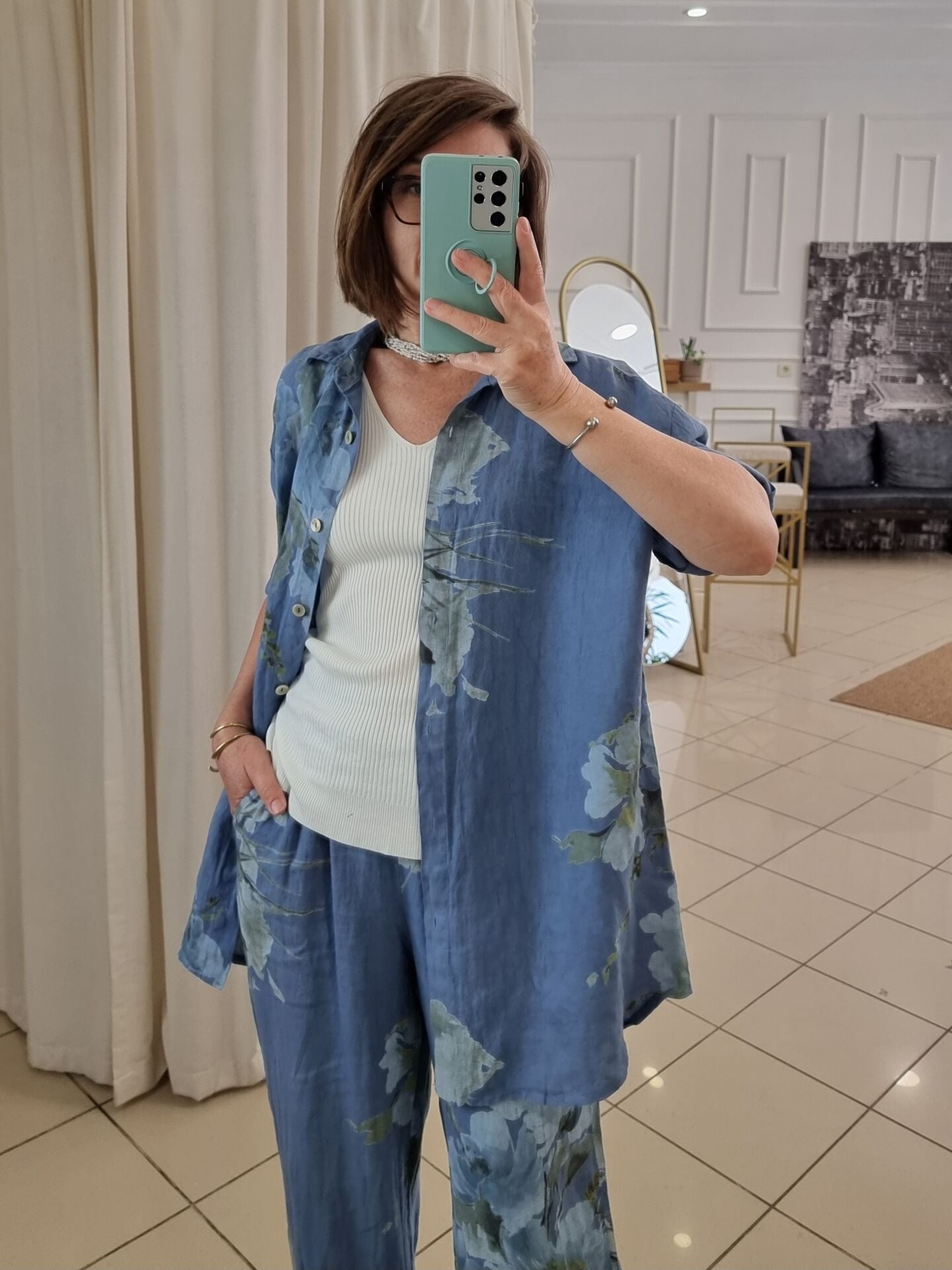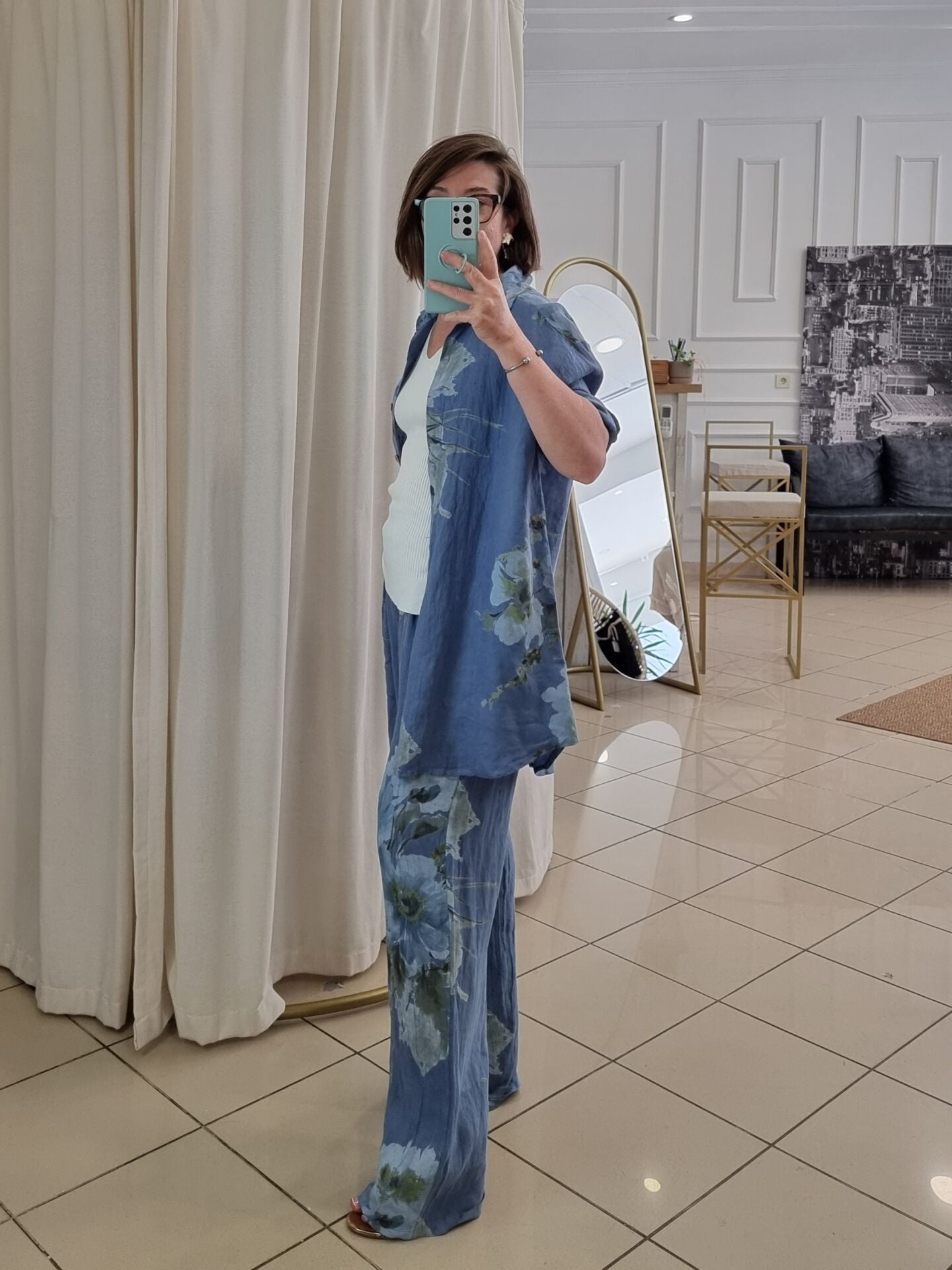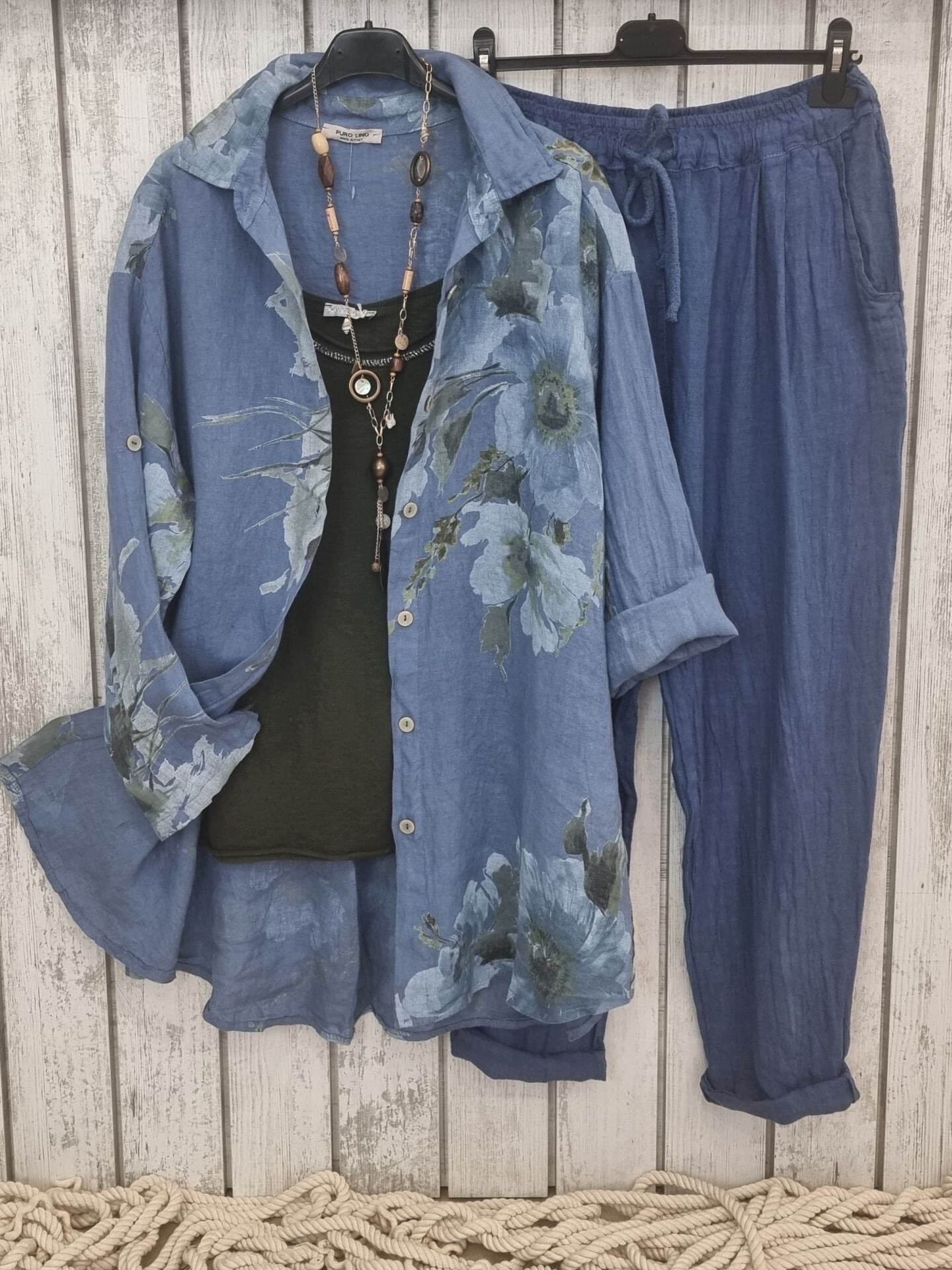 Uzun Kol Desenli Keten Gömlek Denim İtalyan