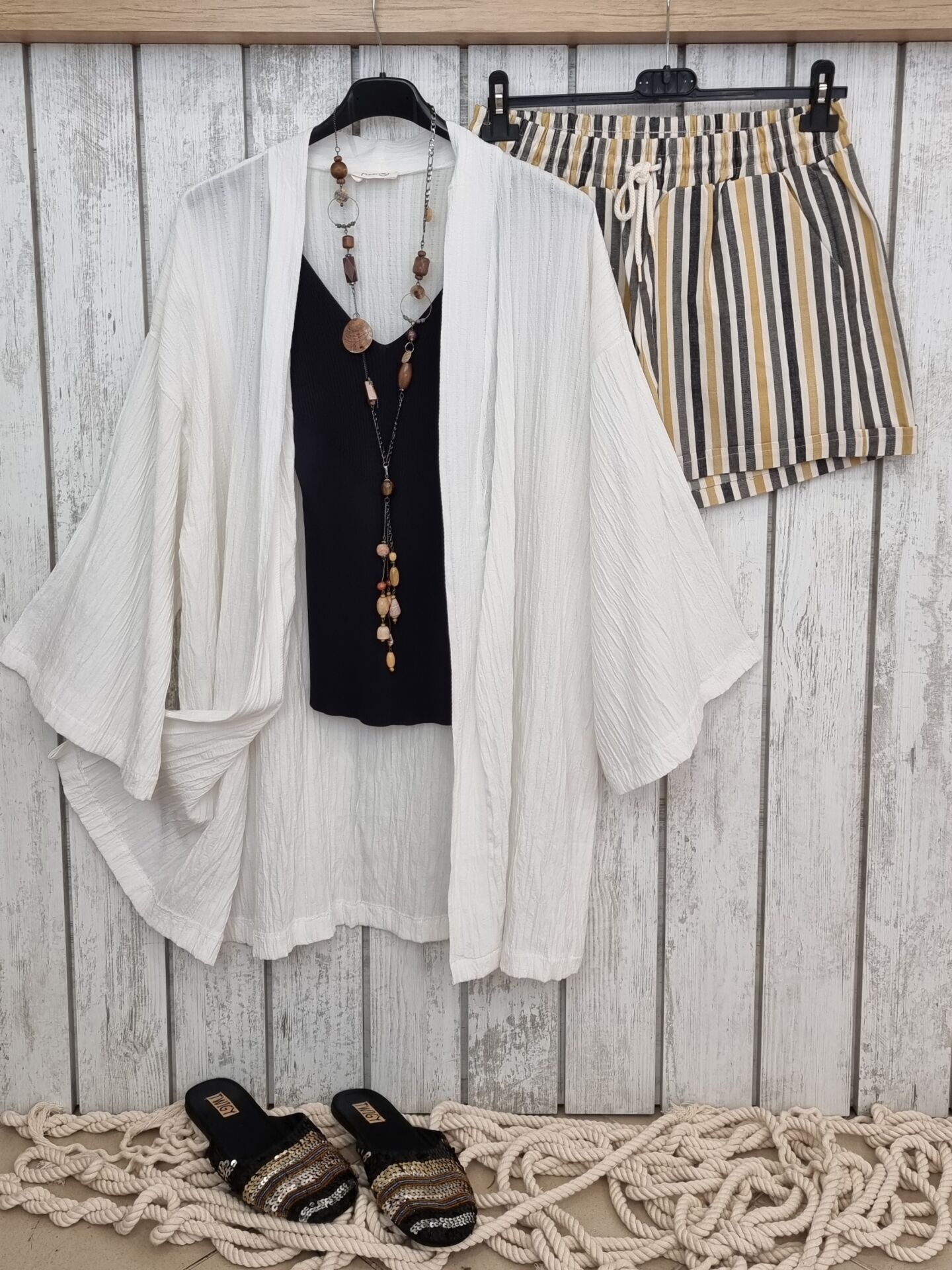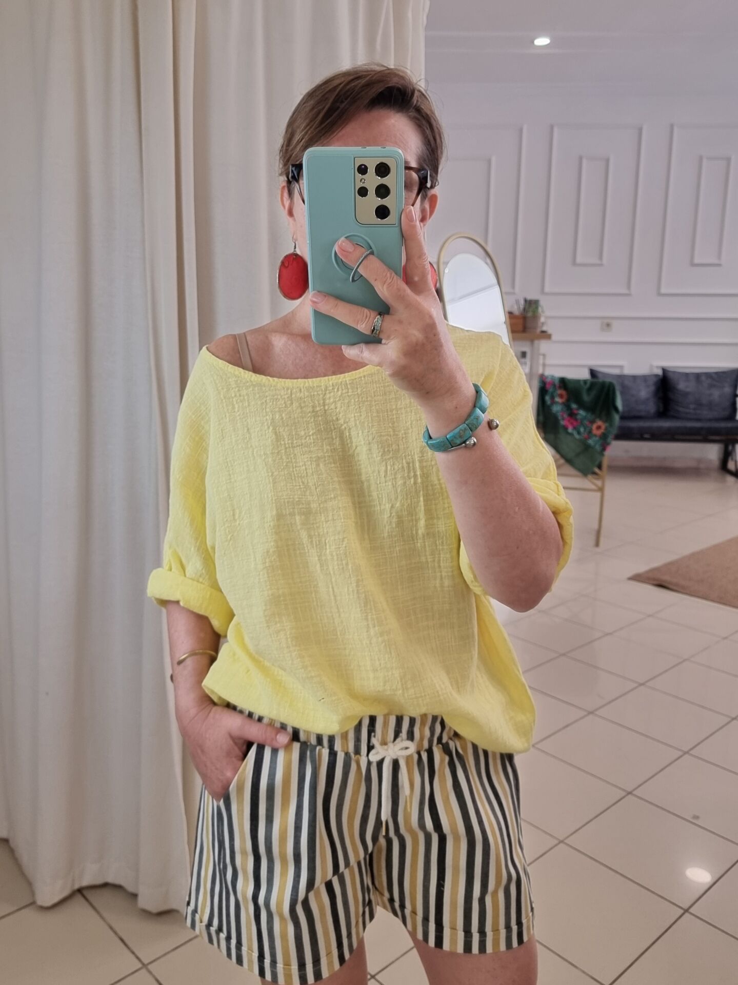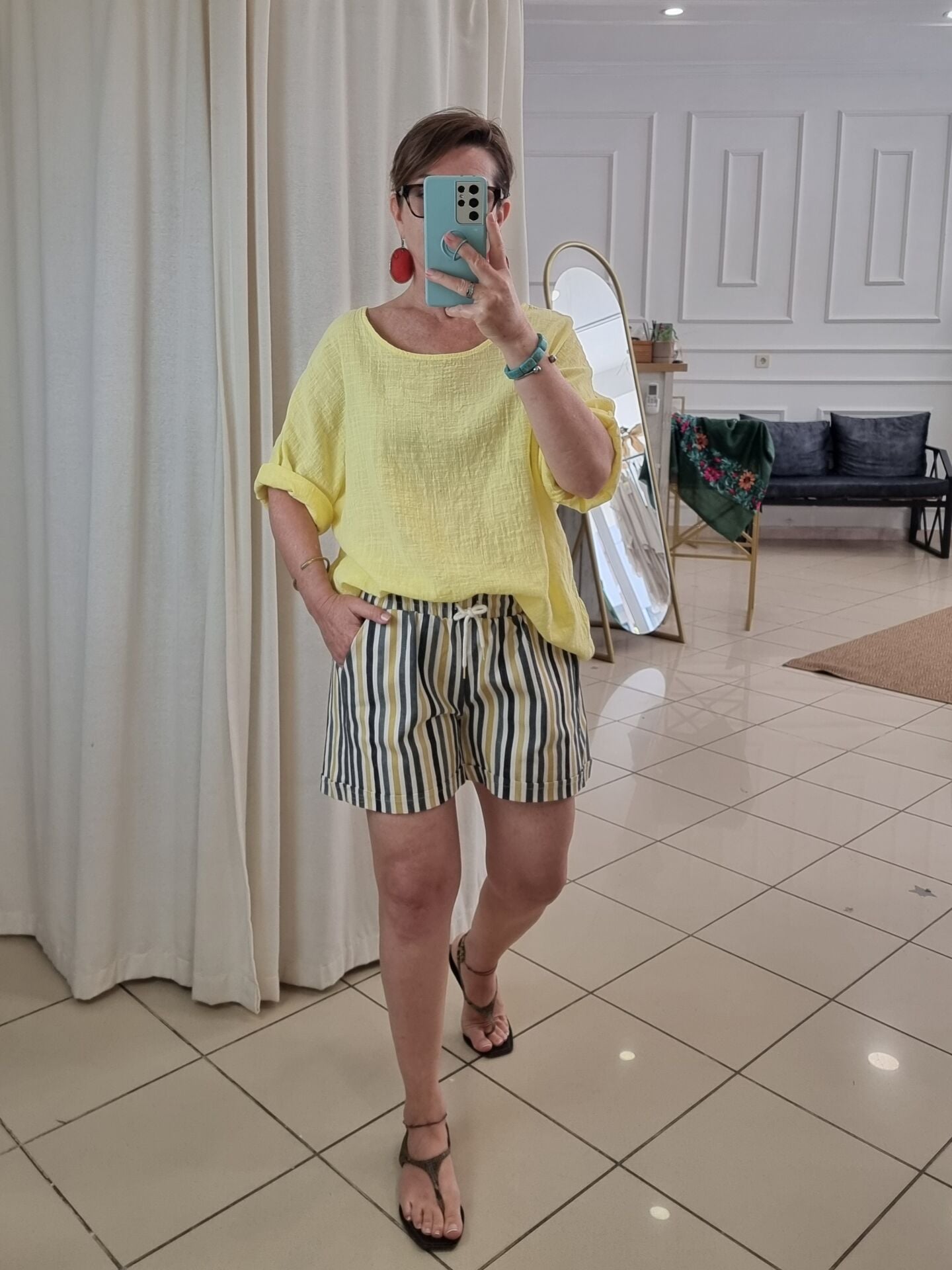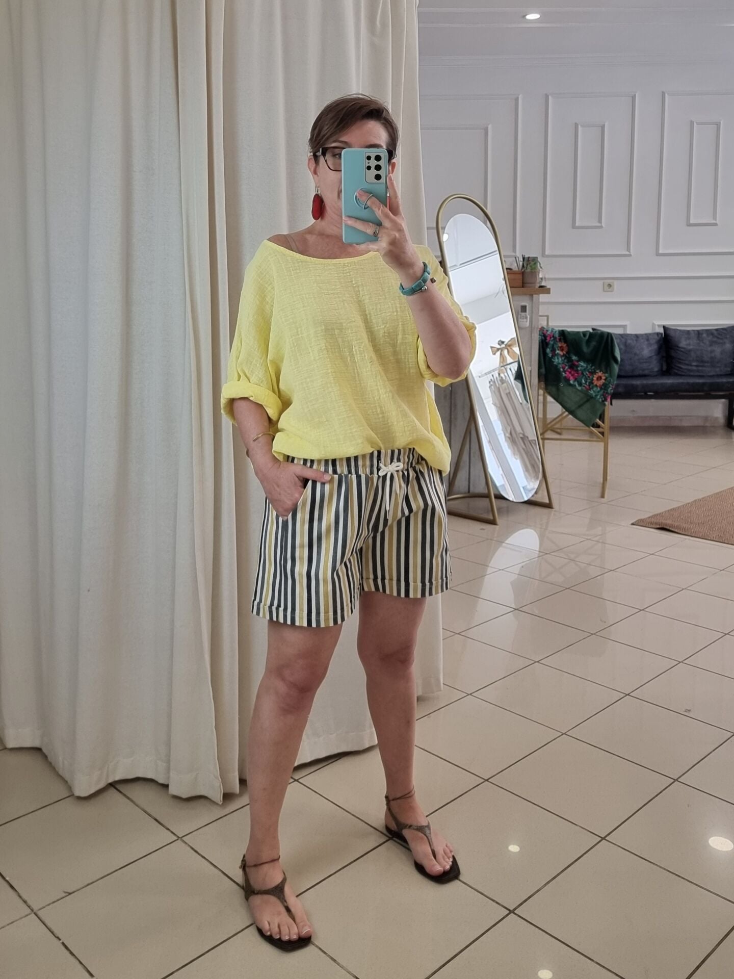 Beli lastikli, bağcıklı gabardin şort.