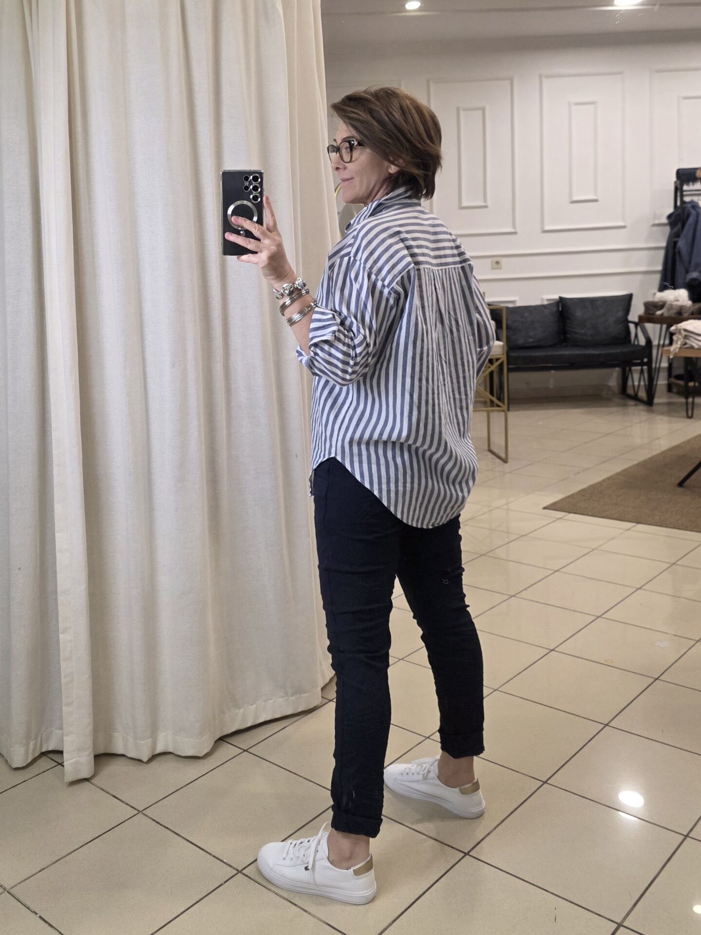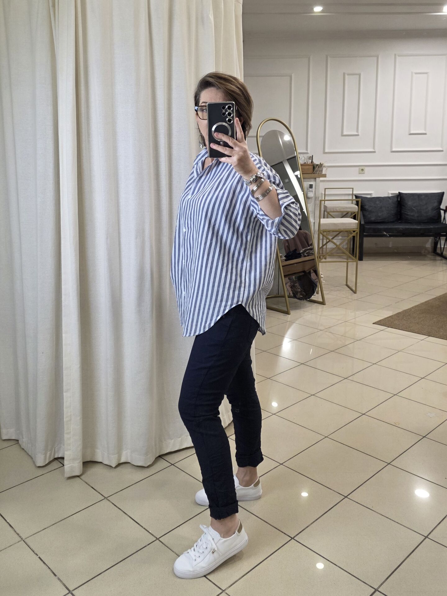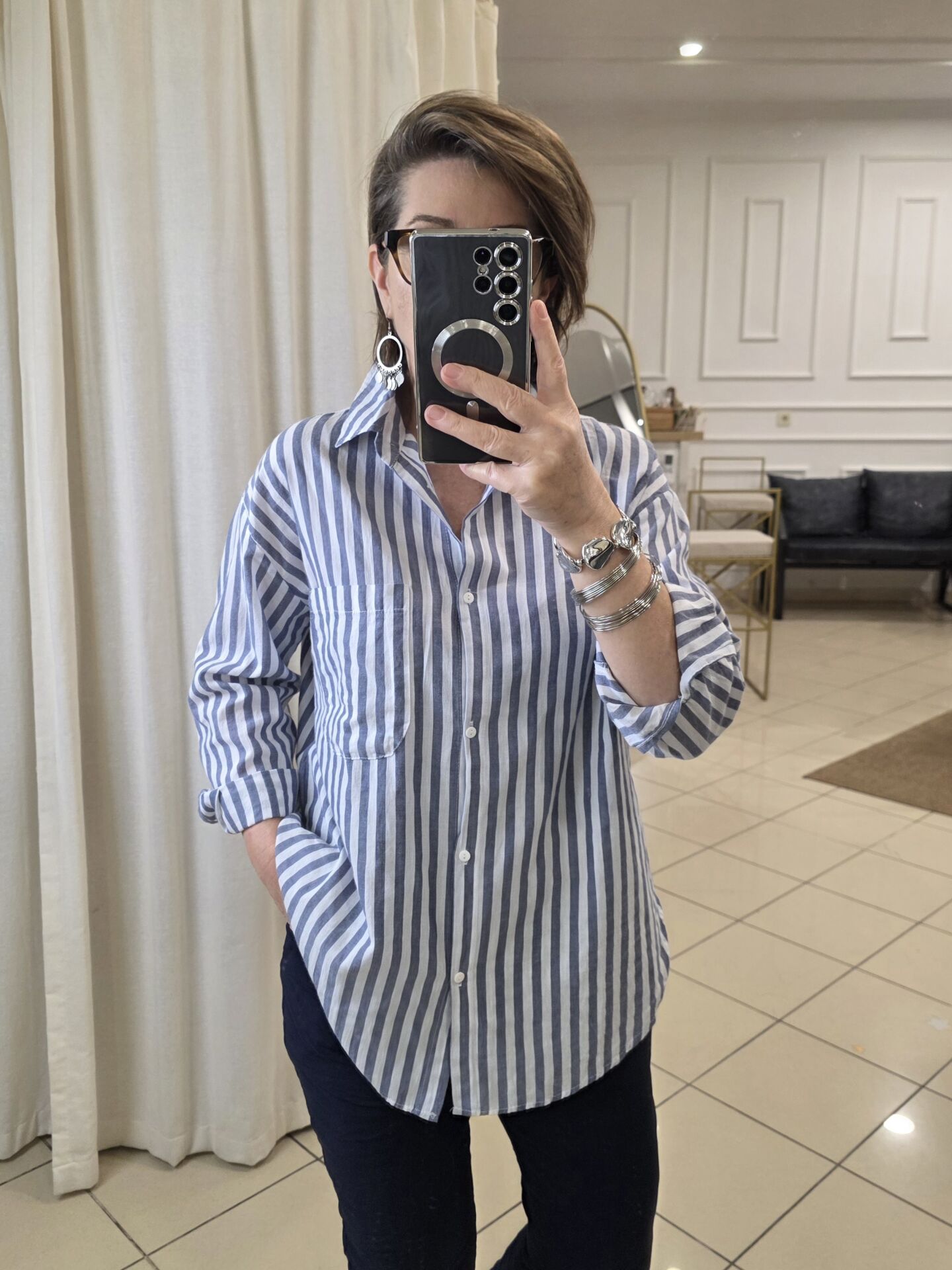 Mavi/ beyaz çizgili gömlek.