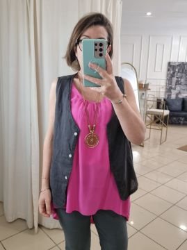 Canlı fuşya tonuyla enerjiyi, dantel sırt detayıyla zarafeti bir araya getiren bu İtalyan fuşya atlet, yaz gardırobuna karakter katmak isteyen kadınlar için harika bir tercih. Ön kısmındaki plise detayı, bluzun akışkan yapısını vurgularken çift katlı kumaşı ile iç göstermeyen bir konfor sunar. Esnek yapısı 48/50 bedene kadar uyum sağlarken, hem gündüz hem akşam kombinlerinde şıklığıyla öne çıkar.