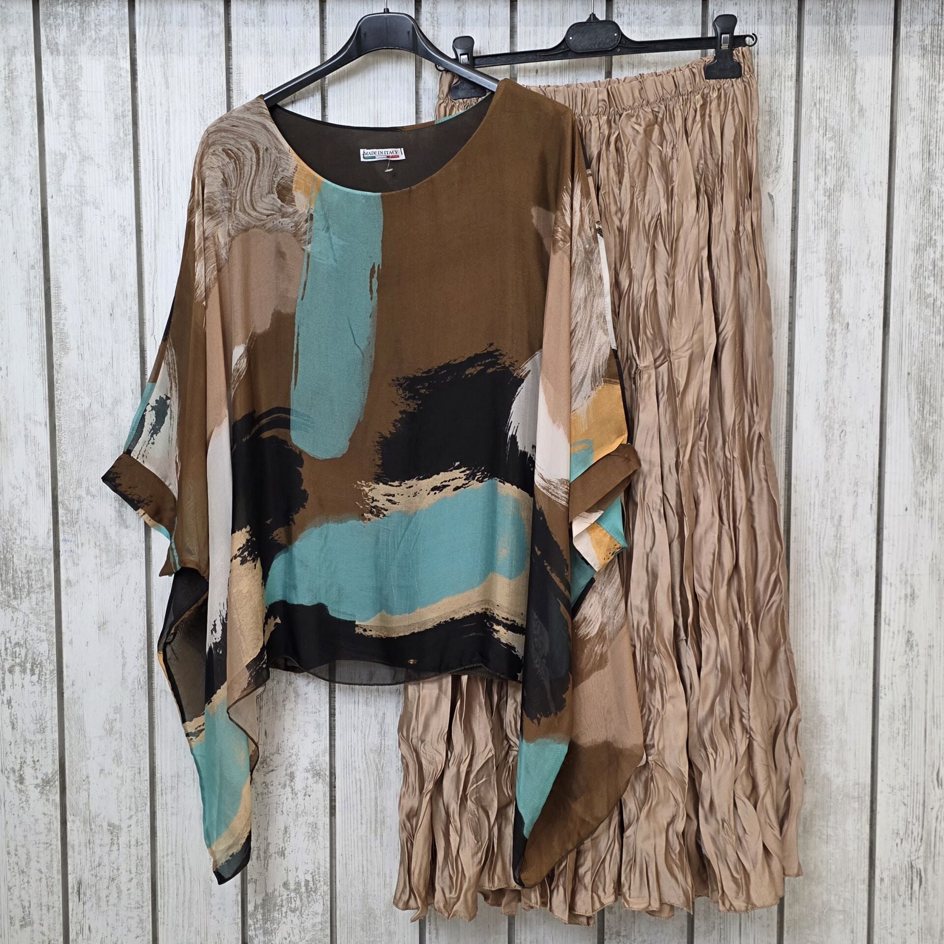 Oversize desenli ipek şifon İtalyan kahverengi bluz.