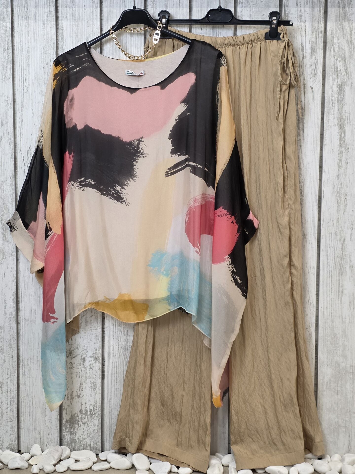 Oversize desenli ipek şifon bej İtalyan bluz.