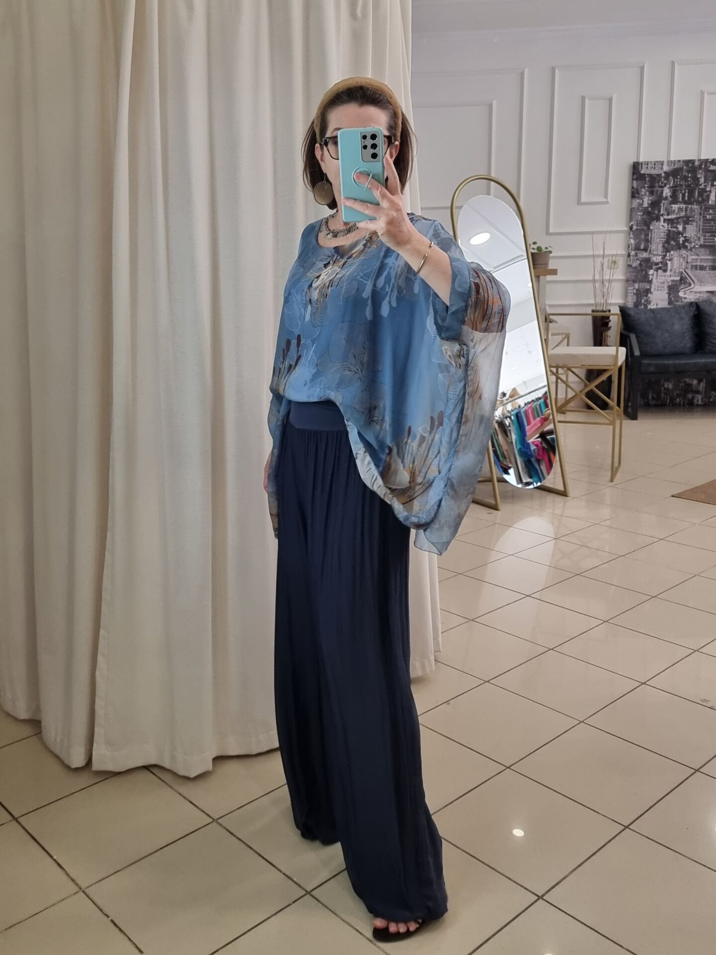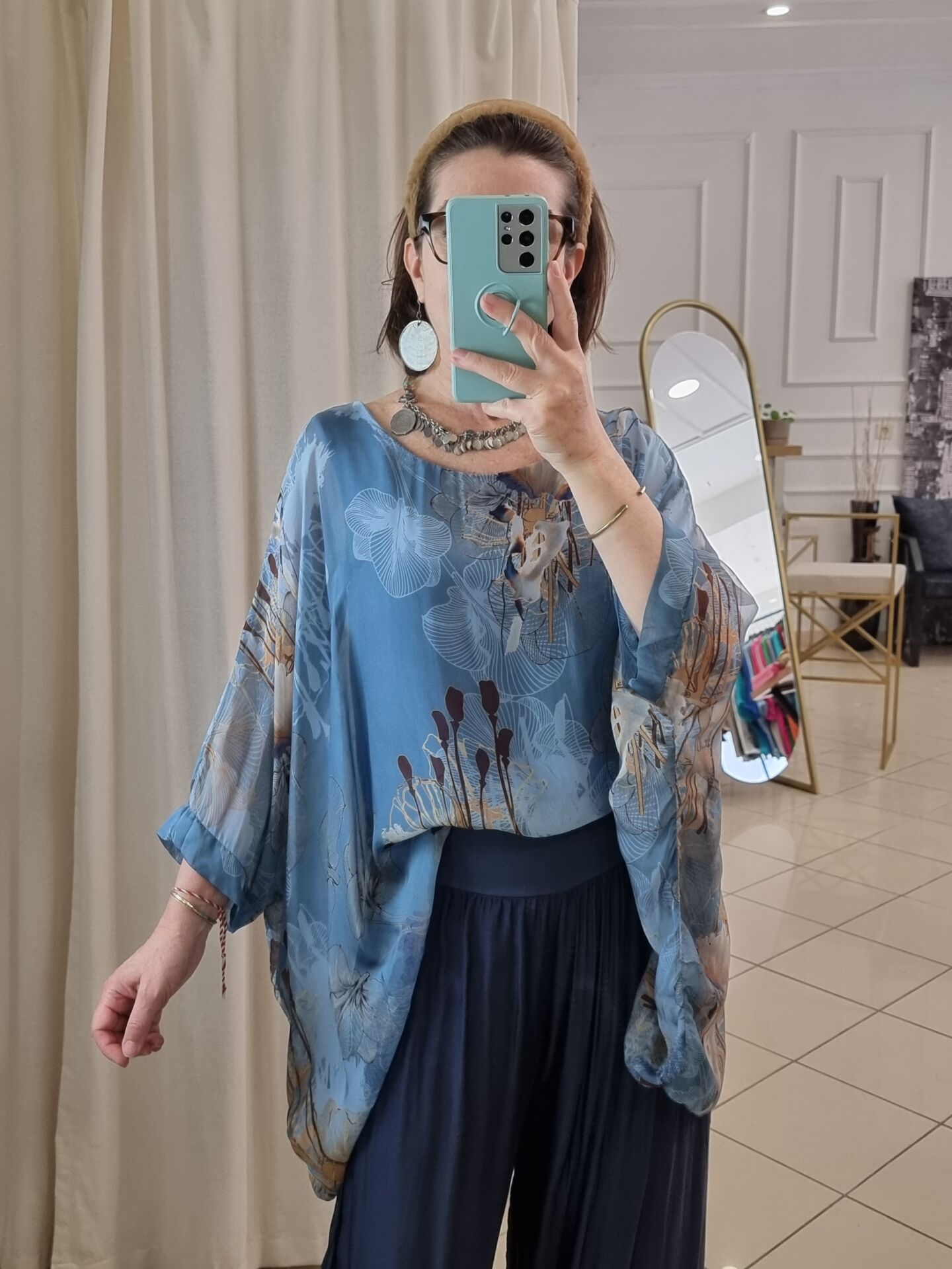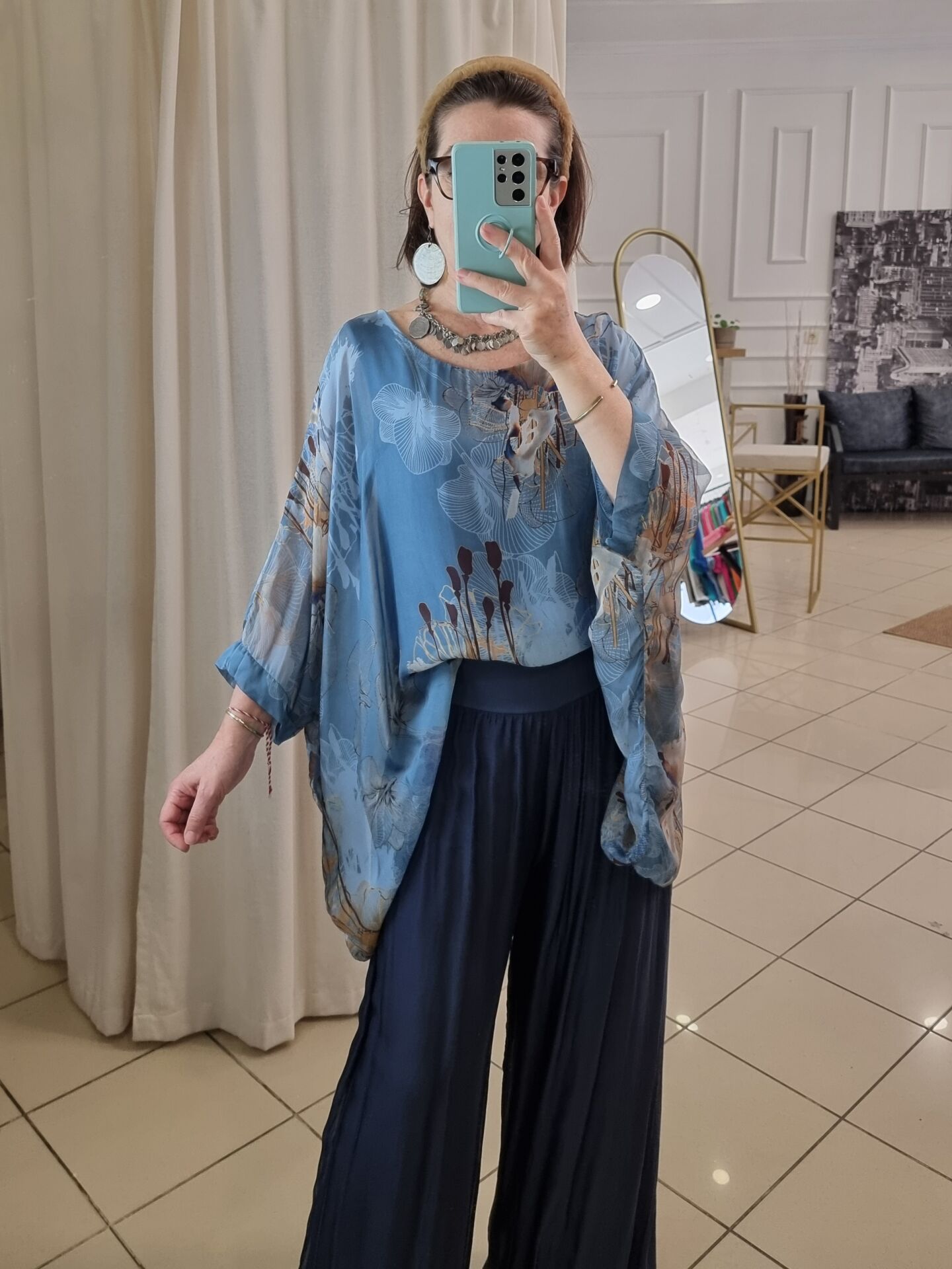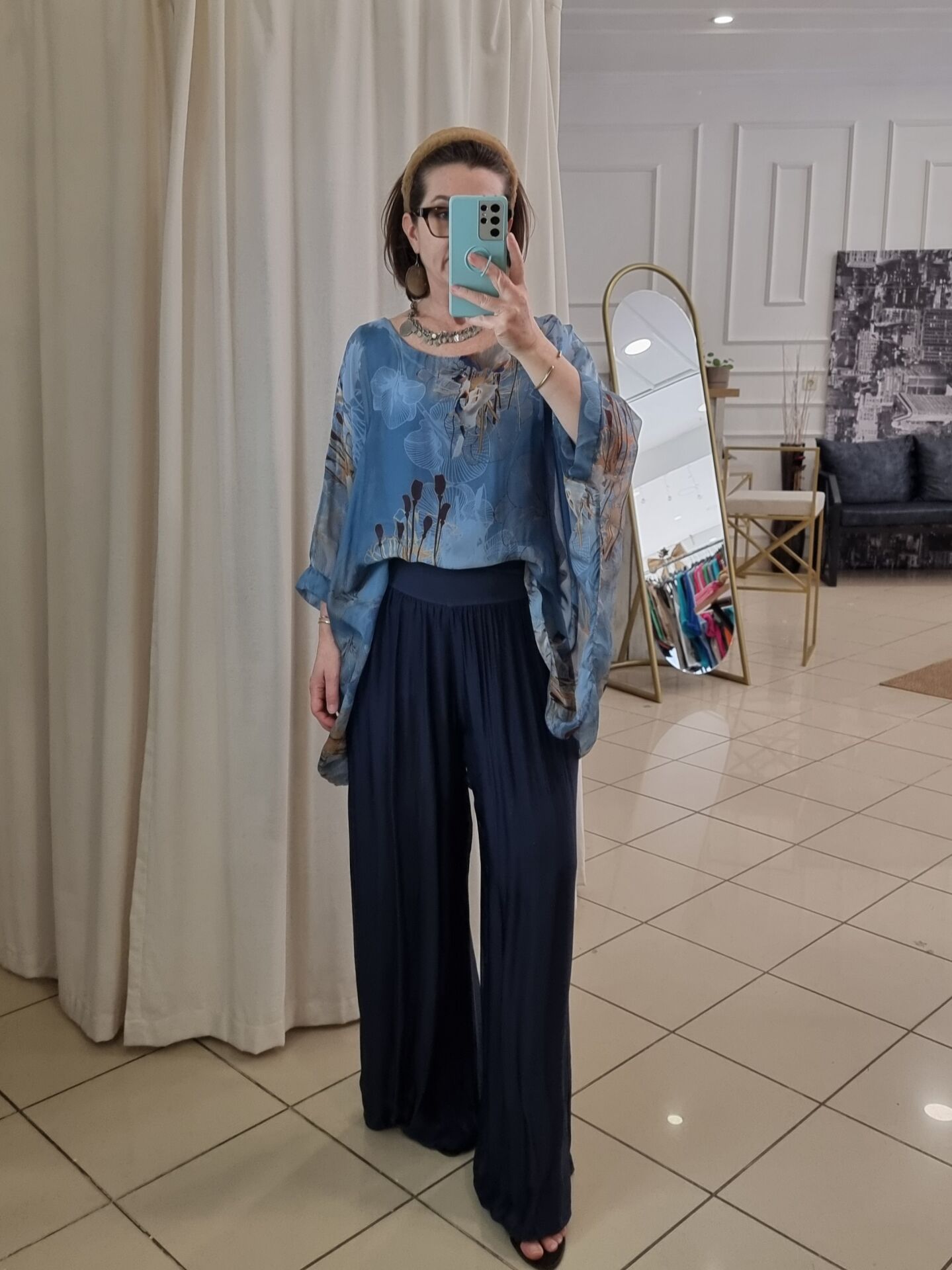 Desenli ipek bluz mavi tonu ile ferahlığı, ipeksi dokusuyla zarafeti bir araya getiriyor. Viskon astarlı yapısı sayesinde rahat bir kullanım sunarken, oversize kesimiyle her bedene uyum sağlar. Uzun kollu ve dökümlü yapısıyla hem günlük hem özel gün kombinlerinde tercih edilebilecek bir tasarımdır. Mavinin dinginliğiyle desenin enerjisi birleşince, sade parçalarla bile etkileyici bir stil oluşturmak mümkün. Gardırobunuzda yer açmanız gereken, sezonun yıldız parçalarından biri olacak.