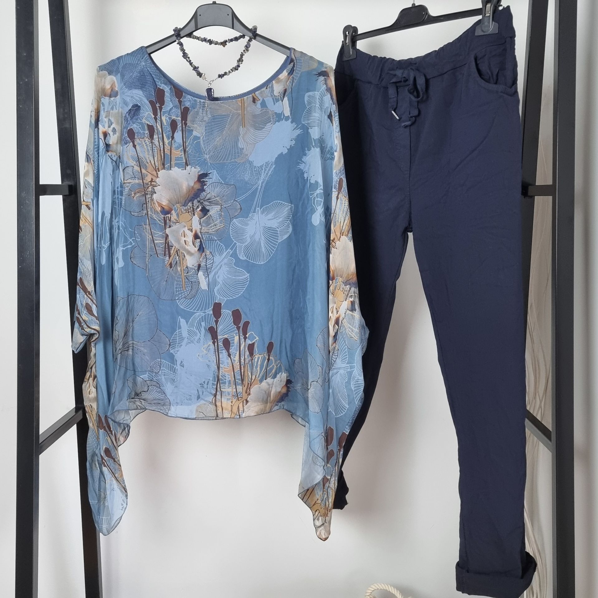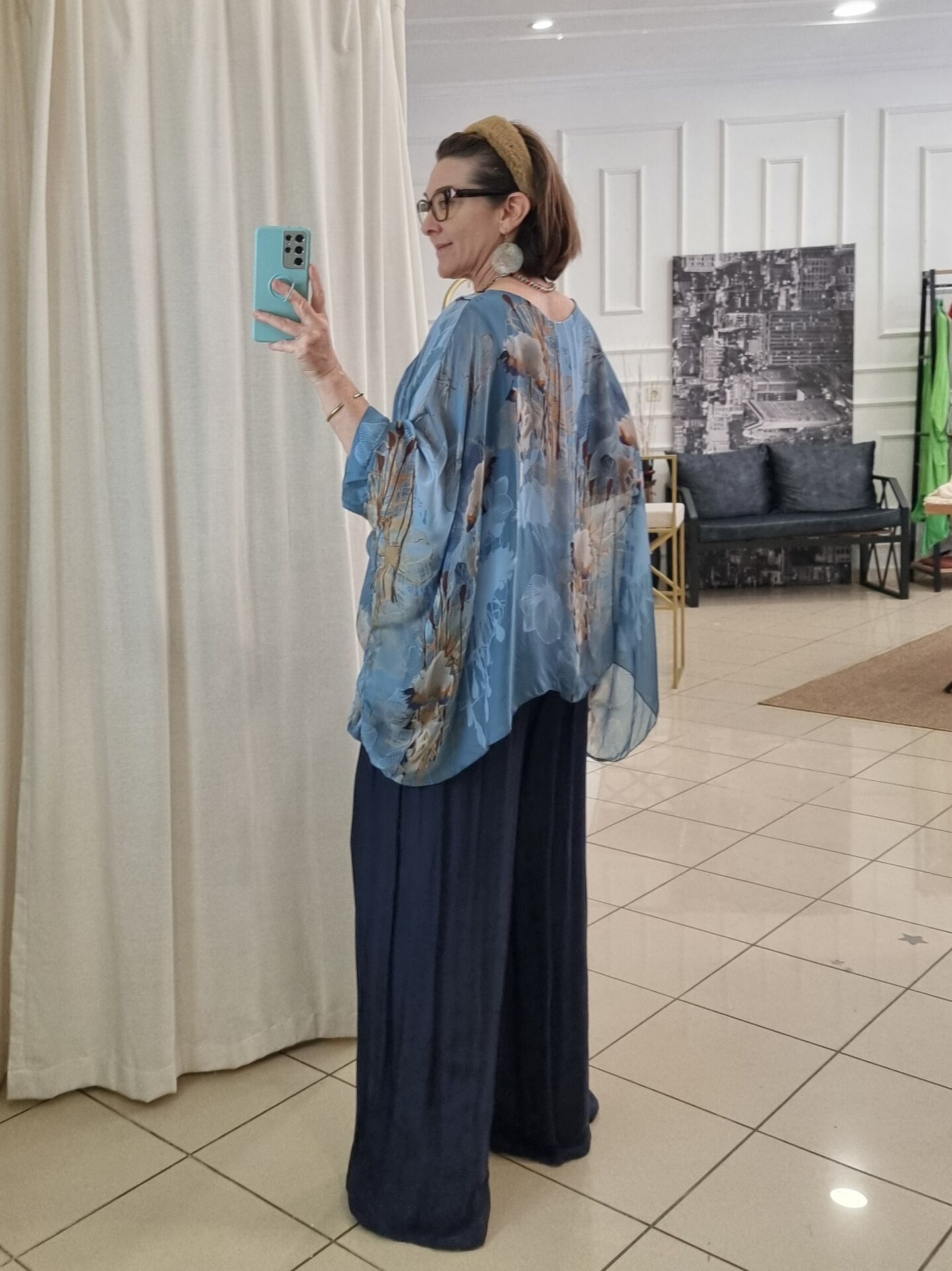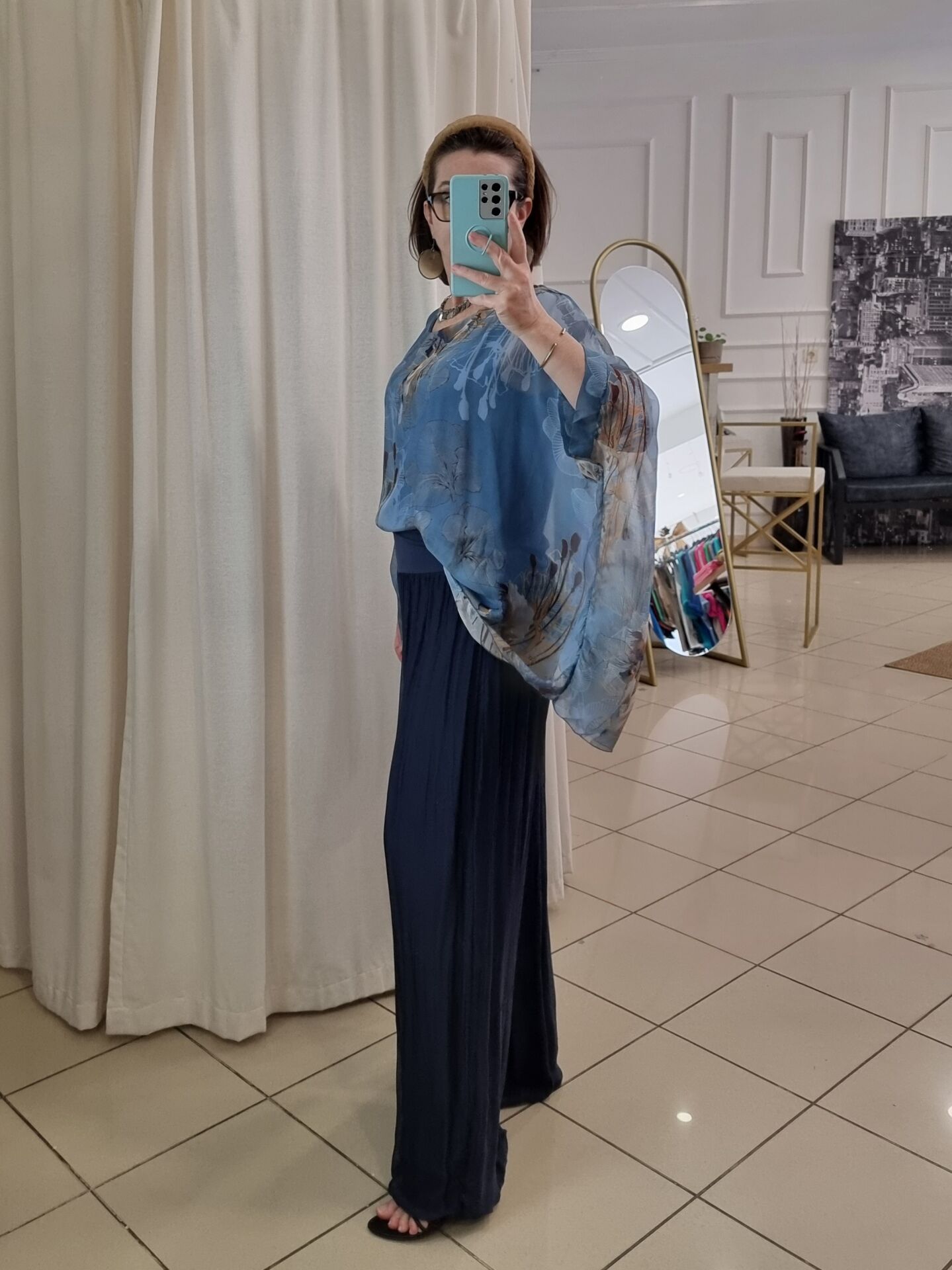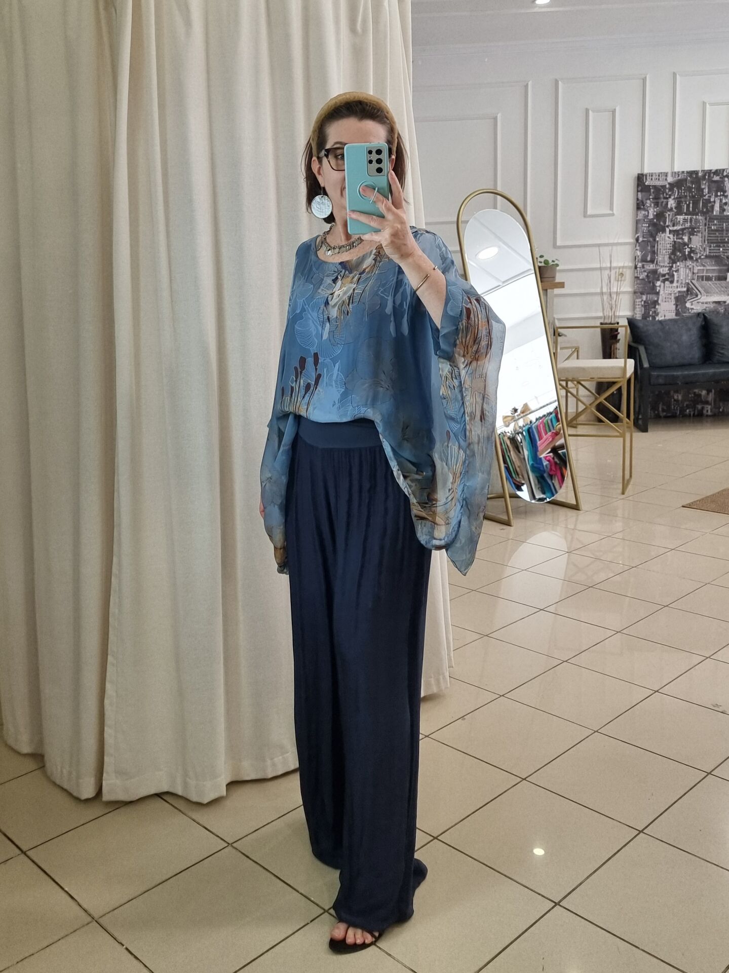 Desenli ipek bluz mavi tonu ile ferahlığı, ipeksi dokusuyla zarafeti bir araya getiriyor. Viskon astarlı yapısı sayesinde rahat bir kullanım sunarken, oversize kesimiyle her bedene uyum sağlar. Uzun kollu ve dökümlü yapısıyla hem günlük hem özel gün kombinlerinde tercih edilebilecek bir tasarımdır. Mavinin dinginliğiyle desenin enerjisi birleşince, sade parçalarla bile etkileyici bir stil oluşturmak mümkün. Gardırobunuzda yer açmanız gereken, sezonun yıldız parçalarından biri olacak.