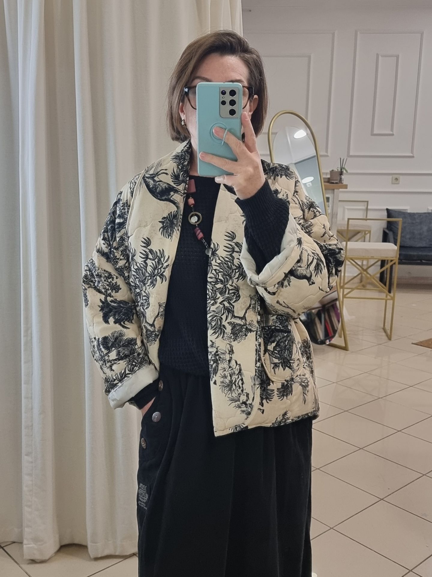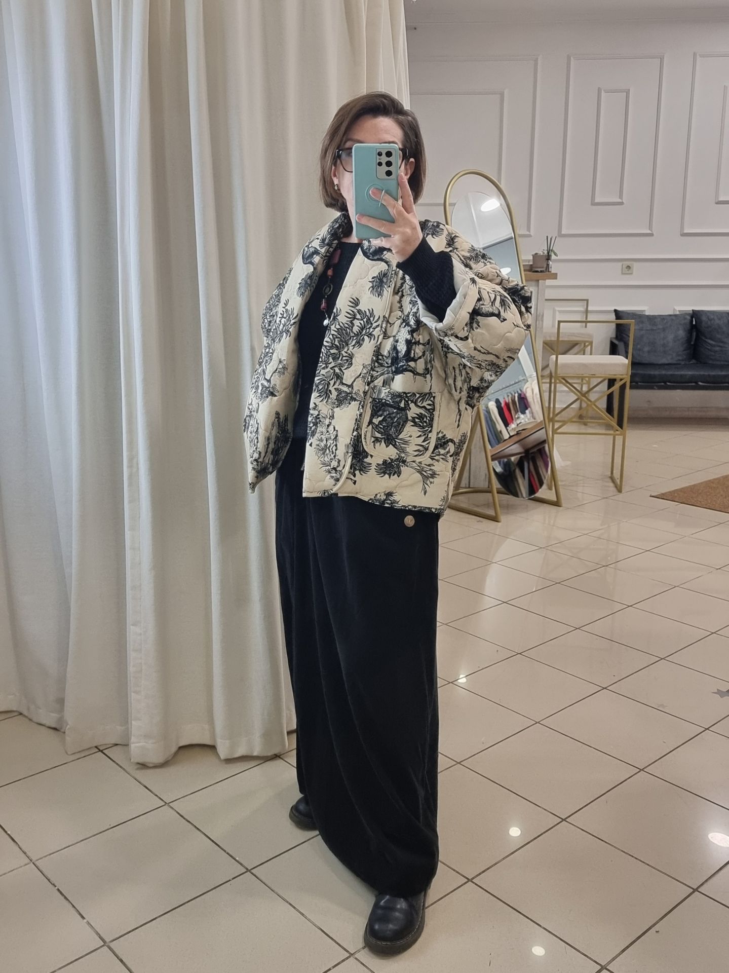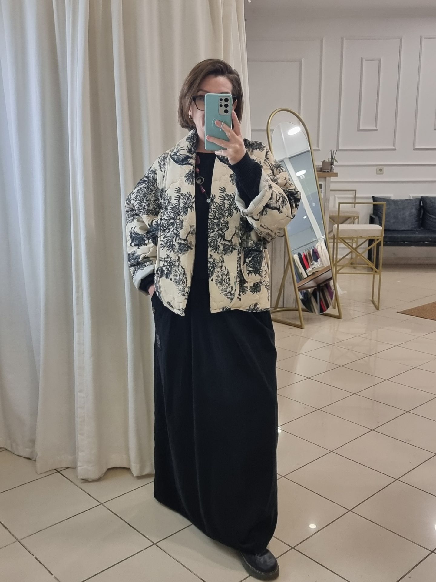 Bu bej kimono mont, kadınlar için mevsimlik bir şıklık sunar. Bu harika tasarım Kimono modeli, astarlı ve içi dolgulu yapısıyla hem ceket tarzında hem de mont olarak kullanılabilir. Desenli ve oversize kesimi sayesinde rahatlığı ve tarzı bir araya getiren bu kimono mont, günlük kombinlerde şıklığınıza zarif bir dokunuş katacak.