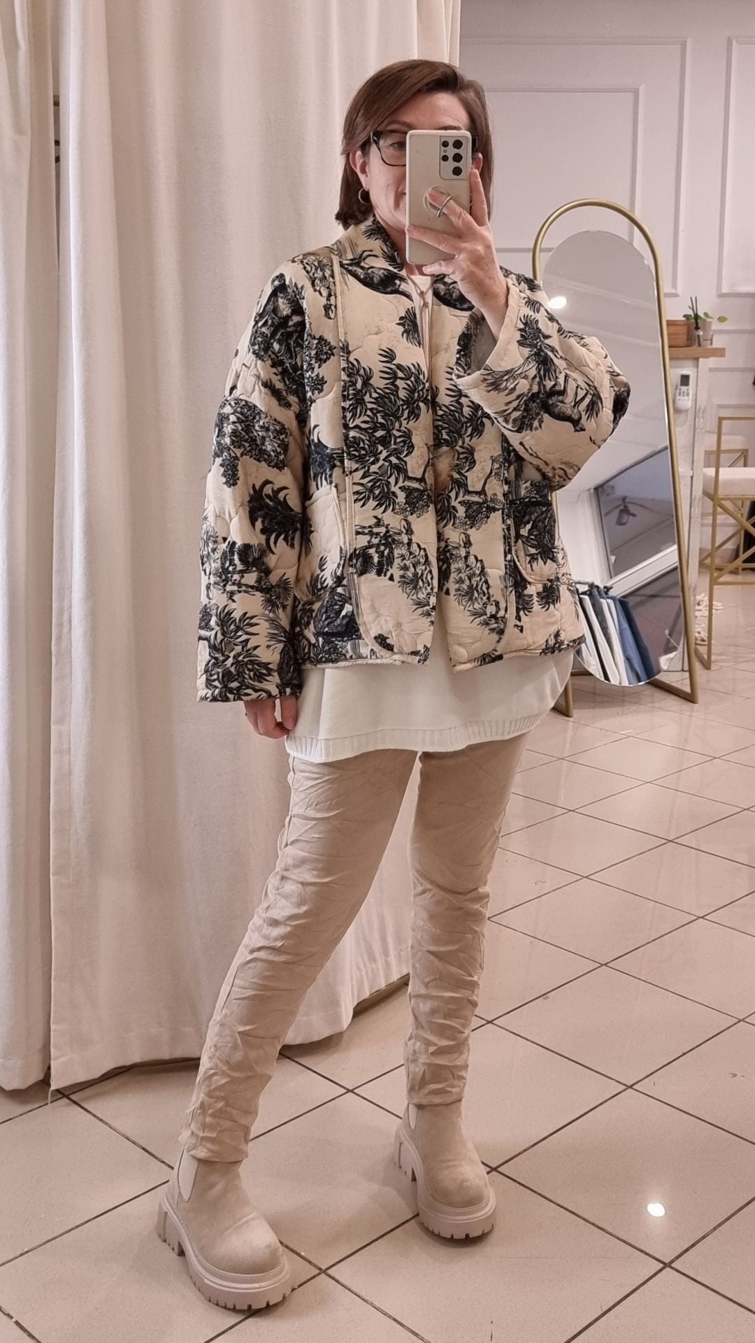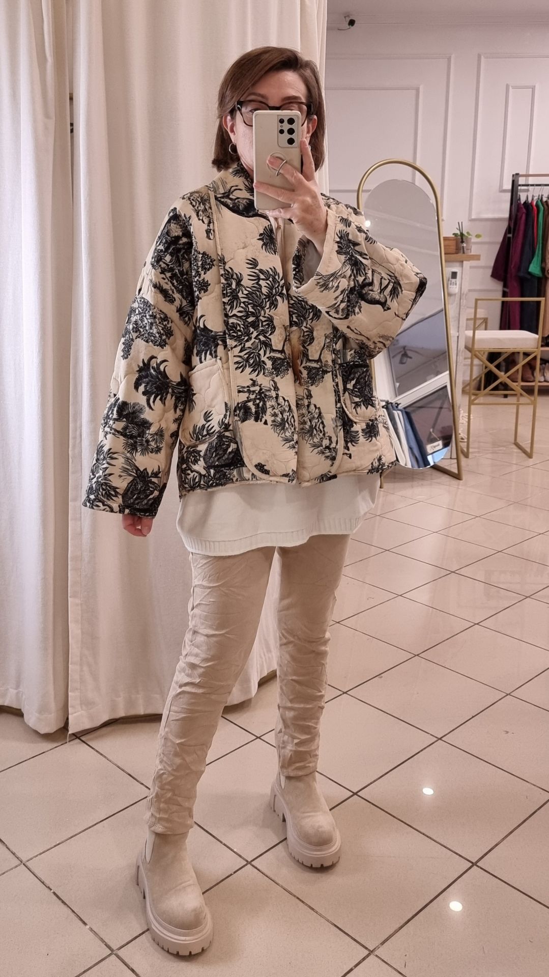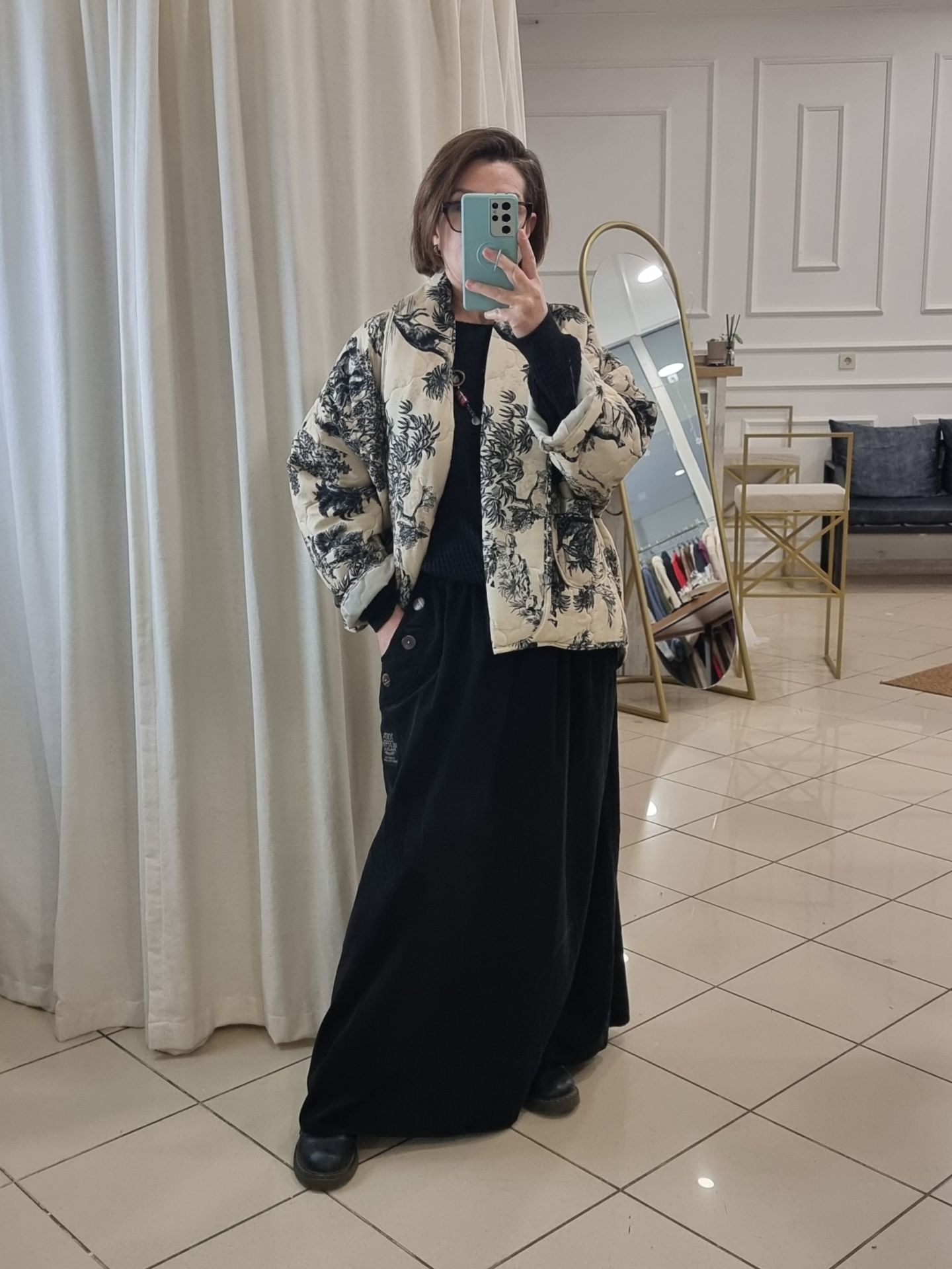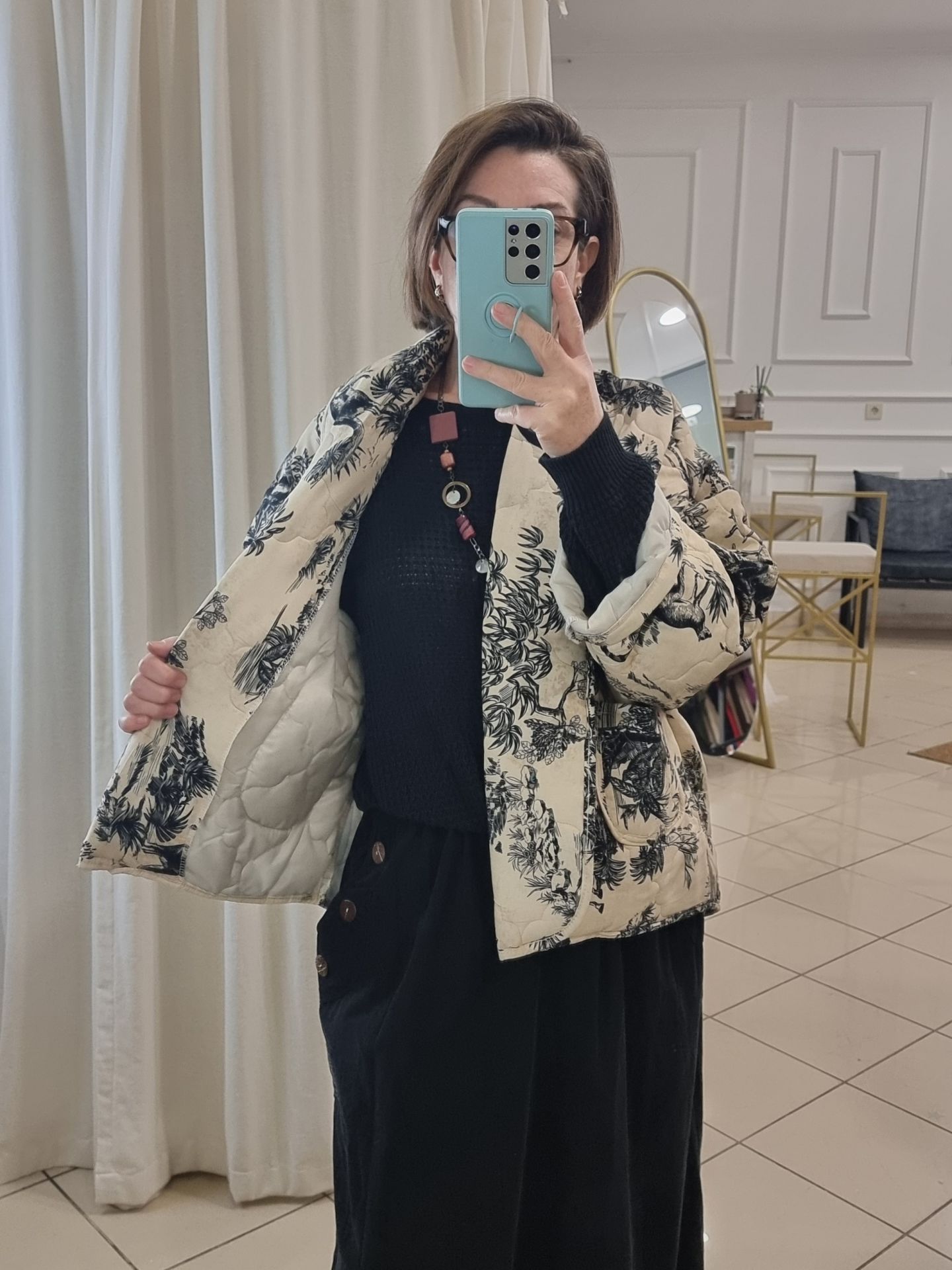 Bu bej kimono mont, kadınlar için mevsimlik bir şıklık sunar. Bu harika tasarım Kimono modeli, astarlı ve içi dolgulu yapısıyla hem ceket tarzında hem de mont olarak kullanılabilir. Desenli ve oversize kesimi sayesinde rahatlığı ve tarzı bir araya getiren bu kimono mont, günlük kombinlerde şıklığınıza zarif bir dokunuş katacak.
