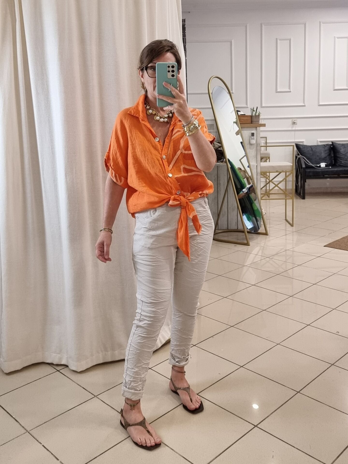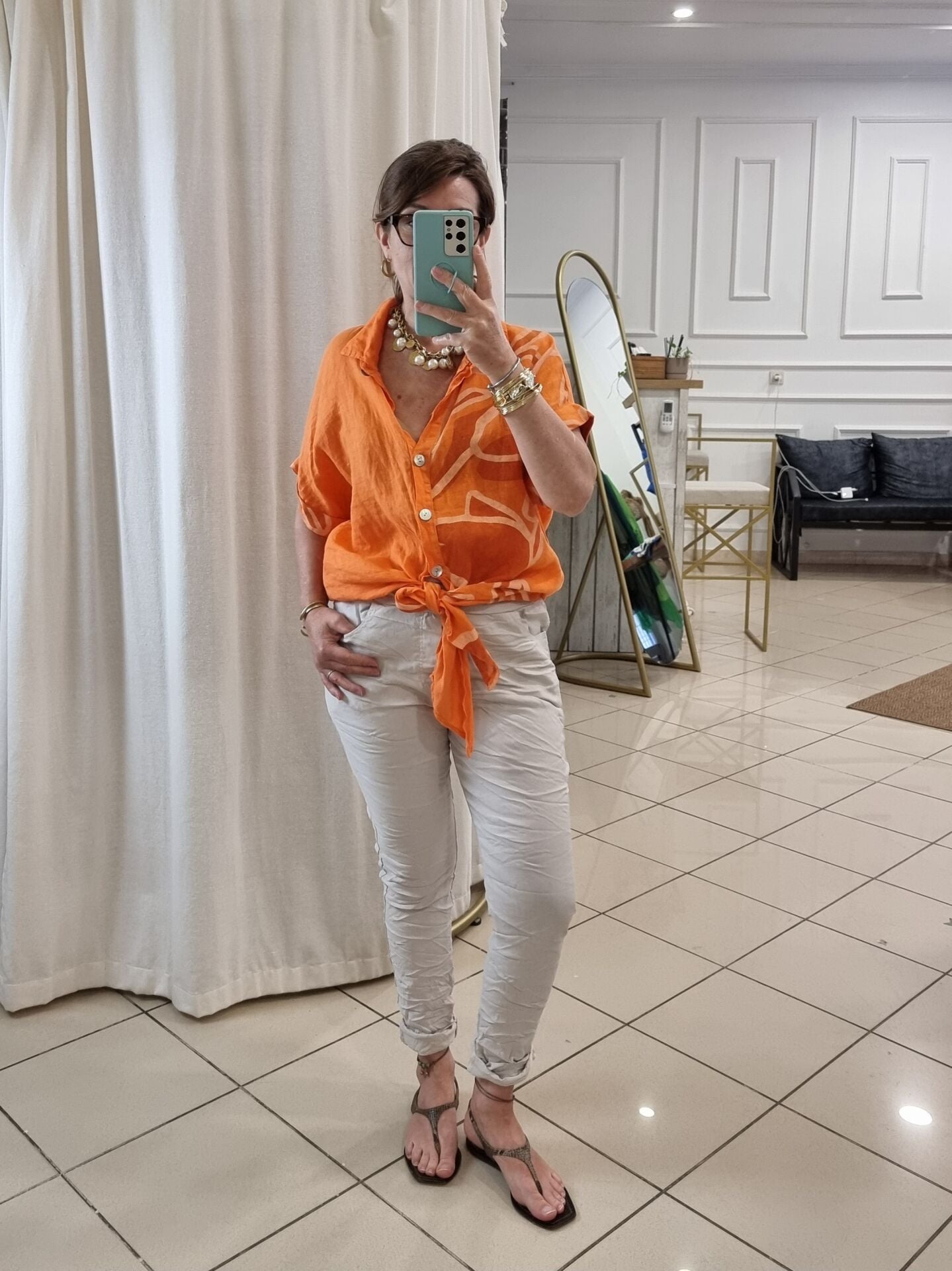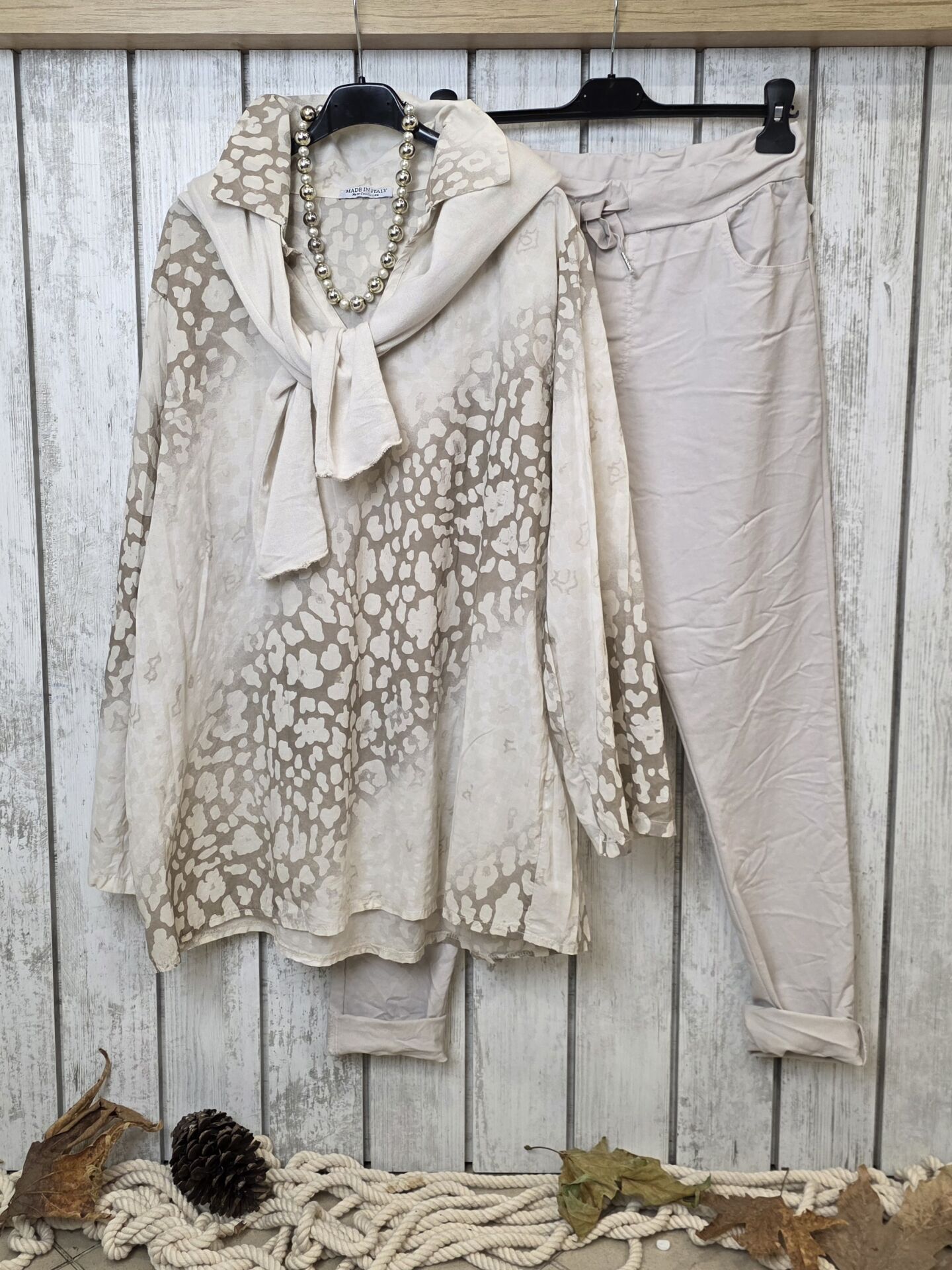 Ekru İtalyan pantolon. Esnek dokuma. Beli lastikli, bağcıklı.