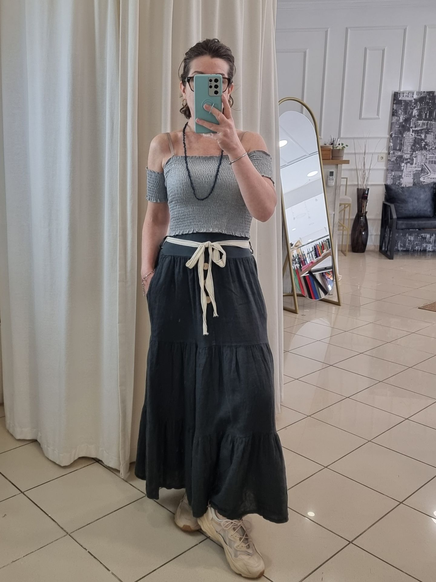 Esnek dokuma, likralı straples yaka düşük kollu crop top.