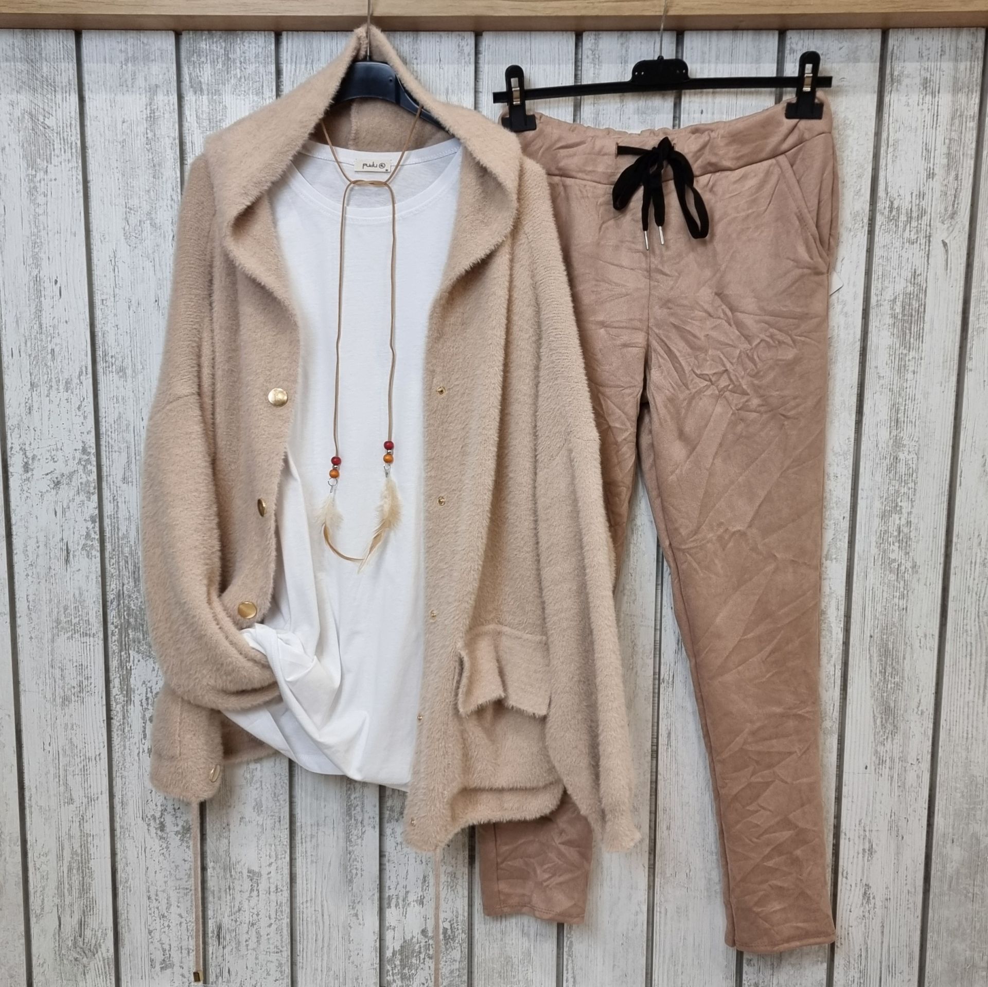 Beli lastikli, esnek, cep detaylı güderi (suni) pantolon.